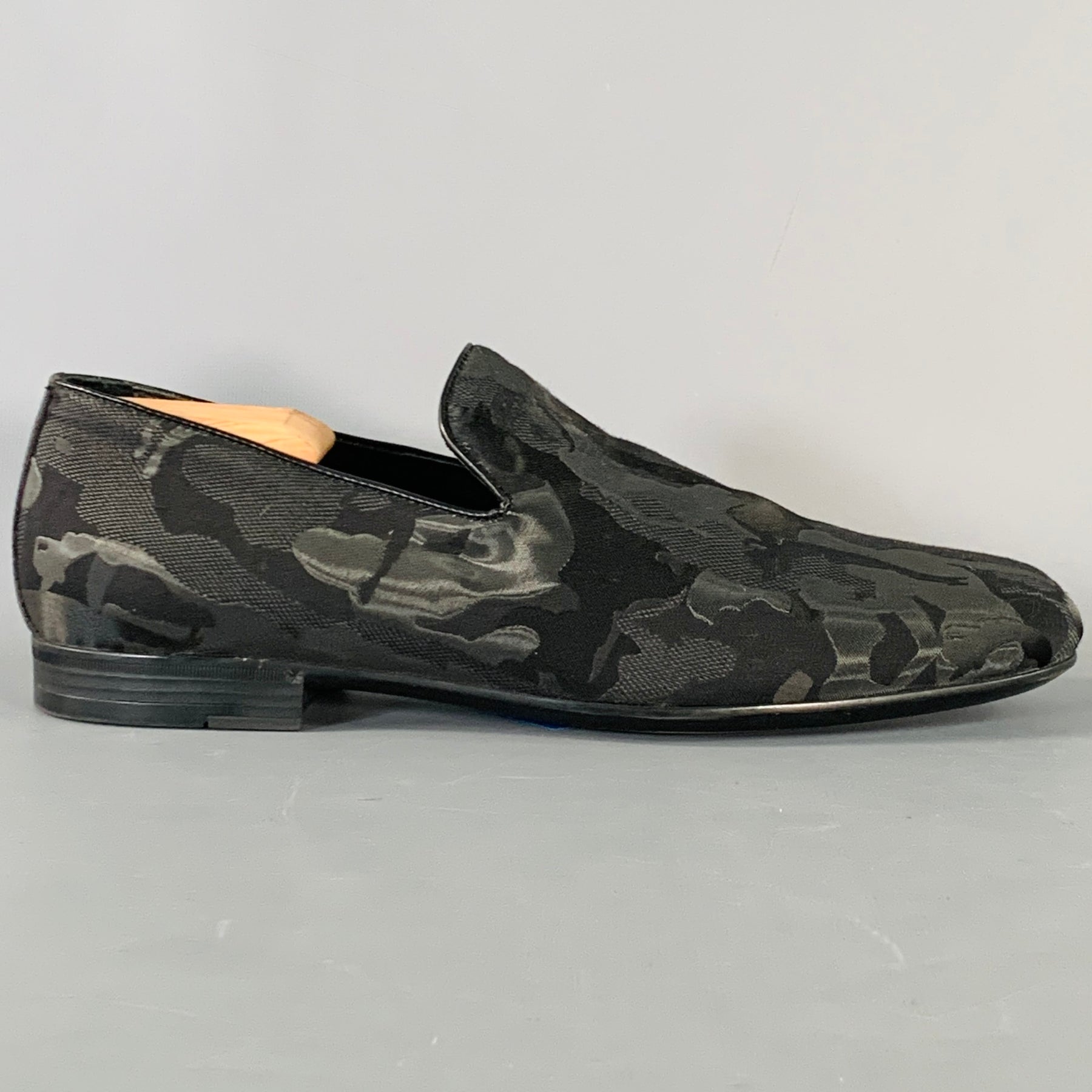 JIMMY CHOO Size 8 Black Grey Camouflage Figures Canvas Slip On Loafers