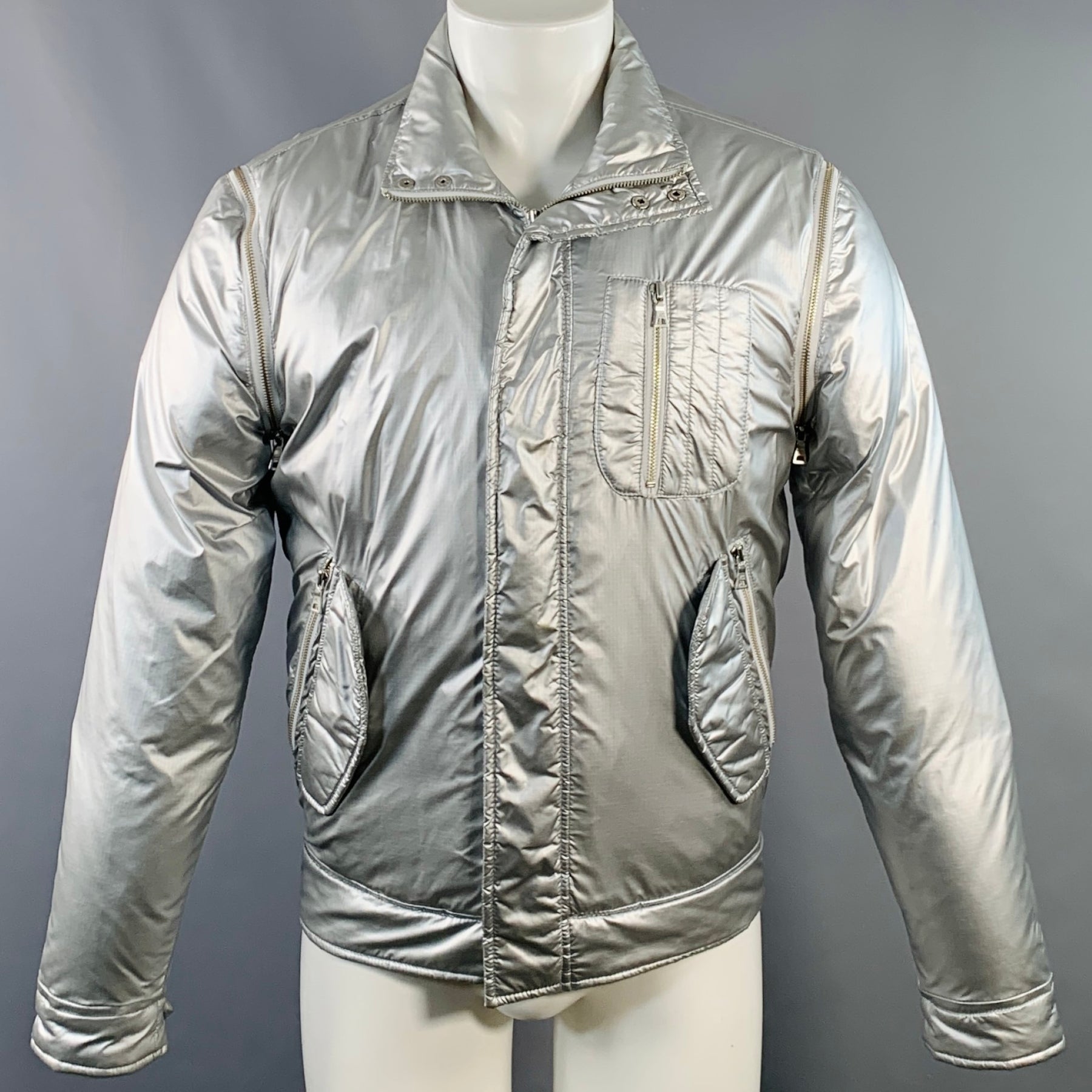 KENNETH COLE jacket in a metallic silver tone polyester featuring multiple zip and flap pockets, detachable sleeves, and zip up closure. Comes with an extra pair of sleeves.