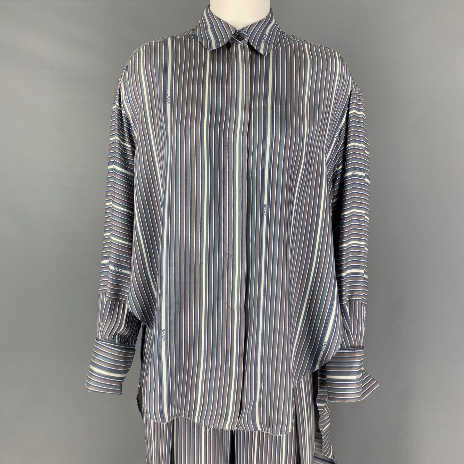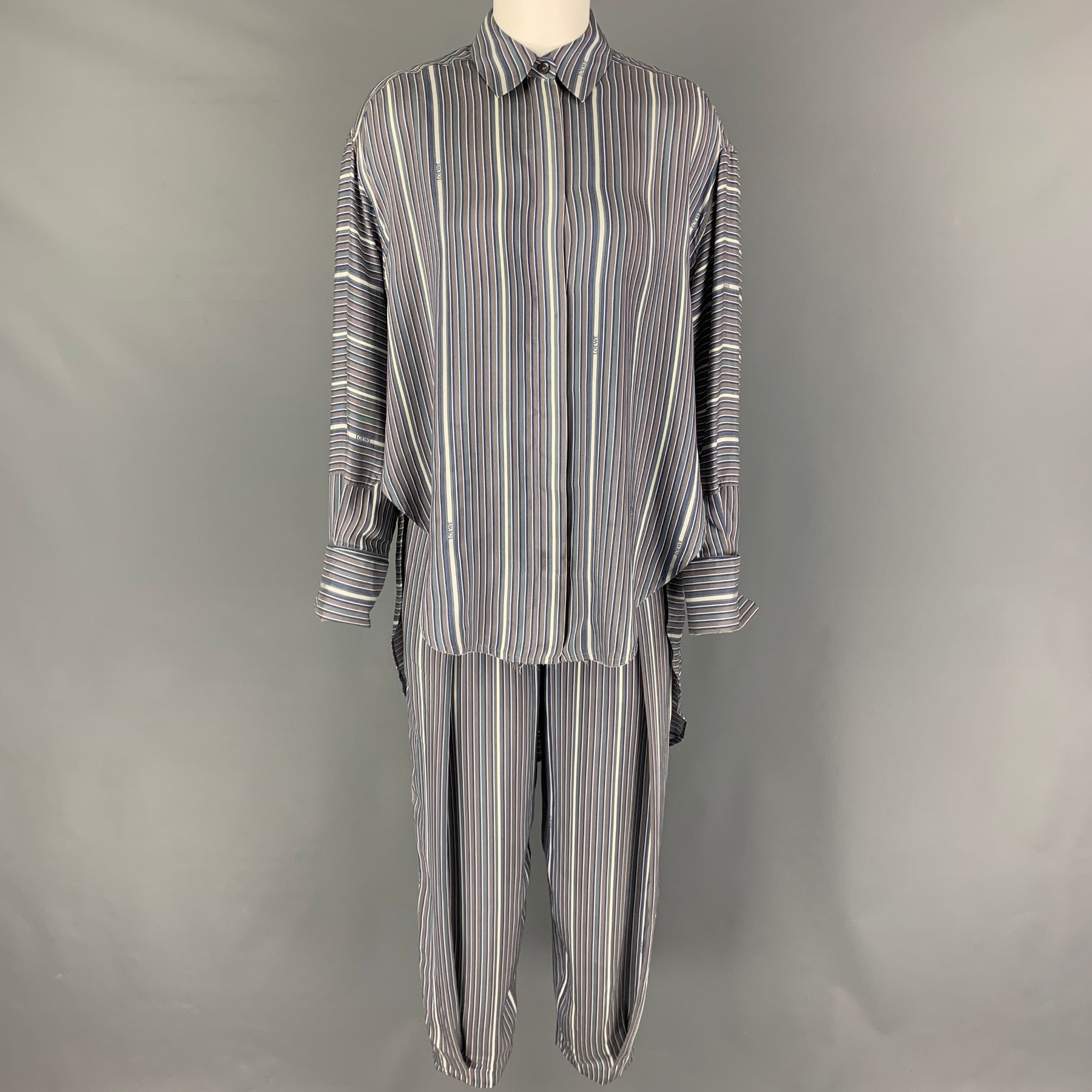LOEWE set comes in a grey & blue striped silk featuring a trompe loeil high-low hem, pointed collar, loose fit,shirttail hem blouse and includes matching pull-on pleated balloon trousers. Made in Italy.
