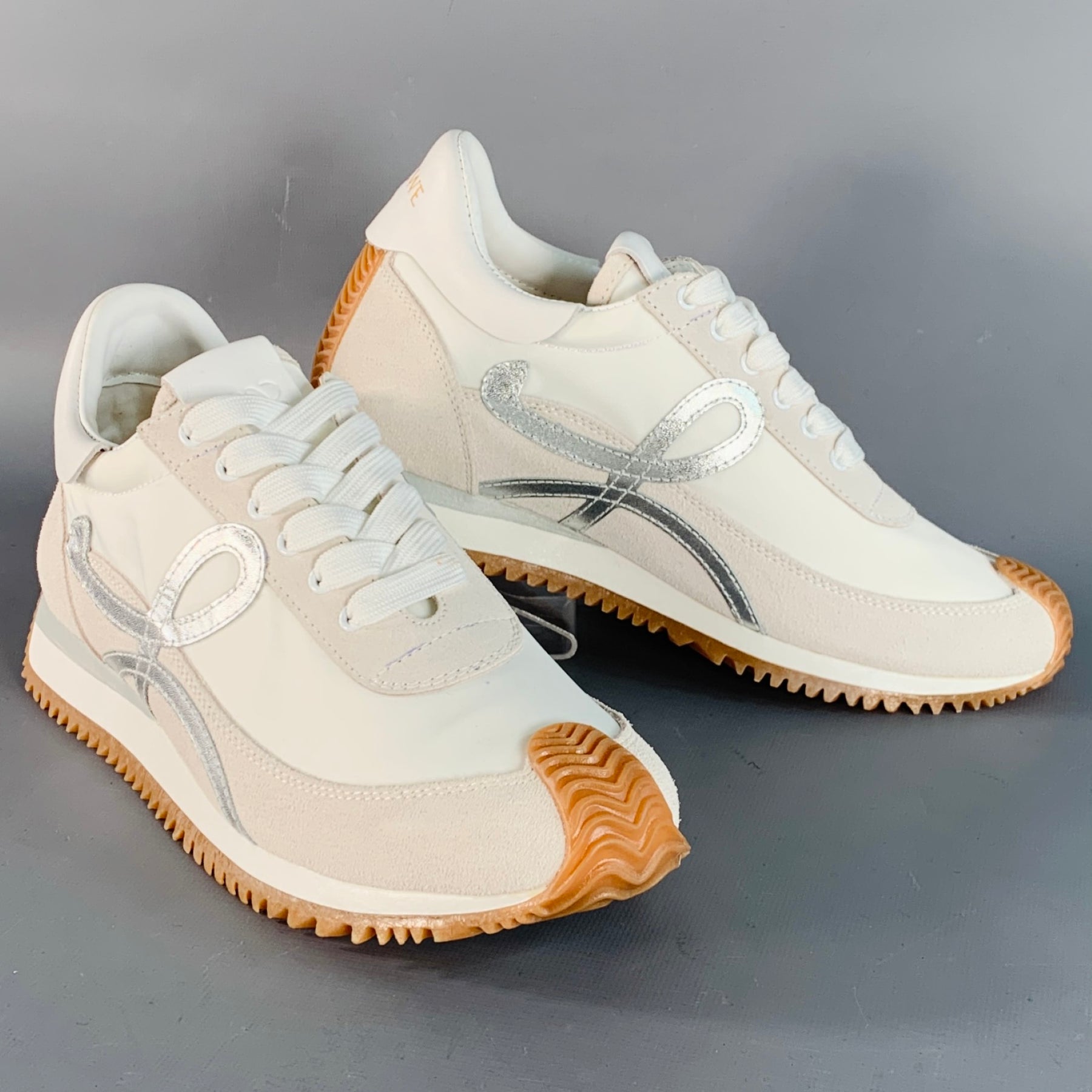 LOEWE Size 9 White Metallic Silver Nylon Suede Logo Sneakers
