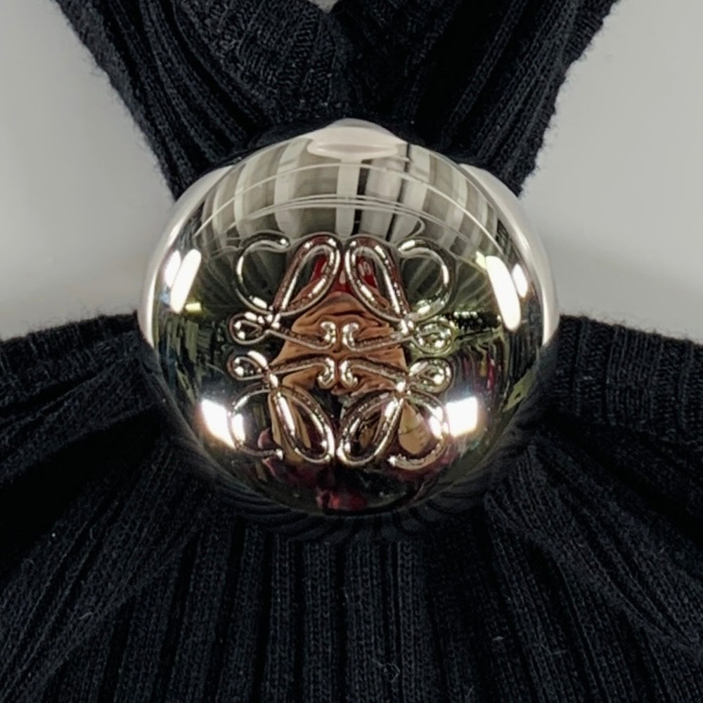 LOEWE "ANAGRAM" dress in a stretchy black cotton knit featuring a rib knit style, and halter bodice with large silver tone metal logo embellishment. Made in Portugal.