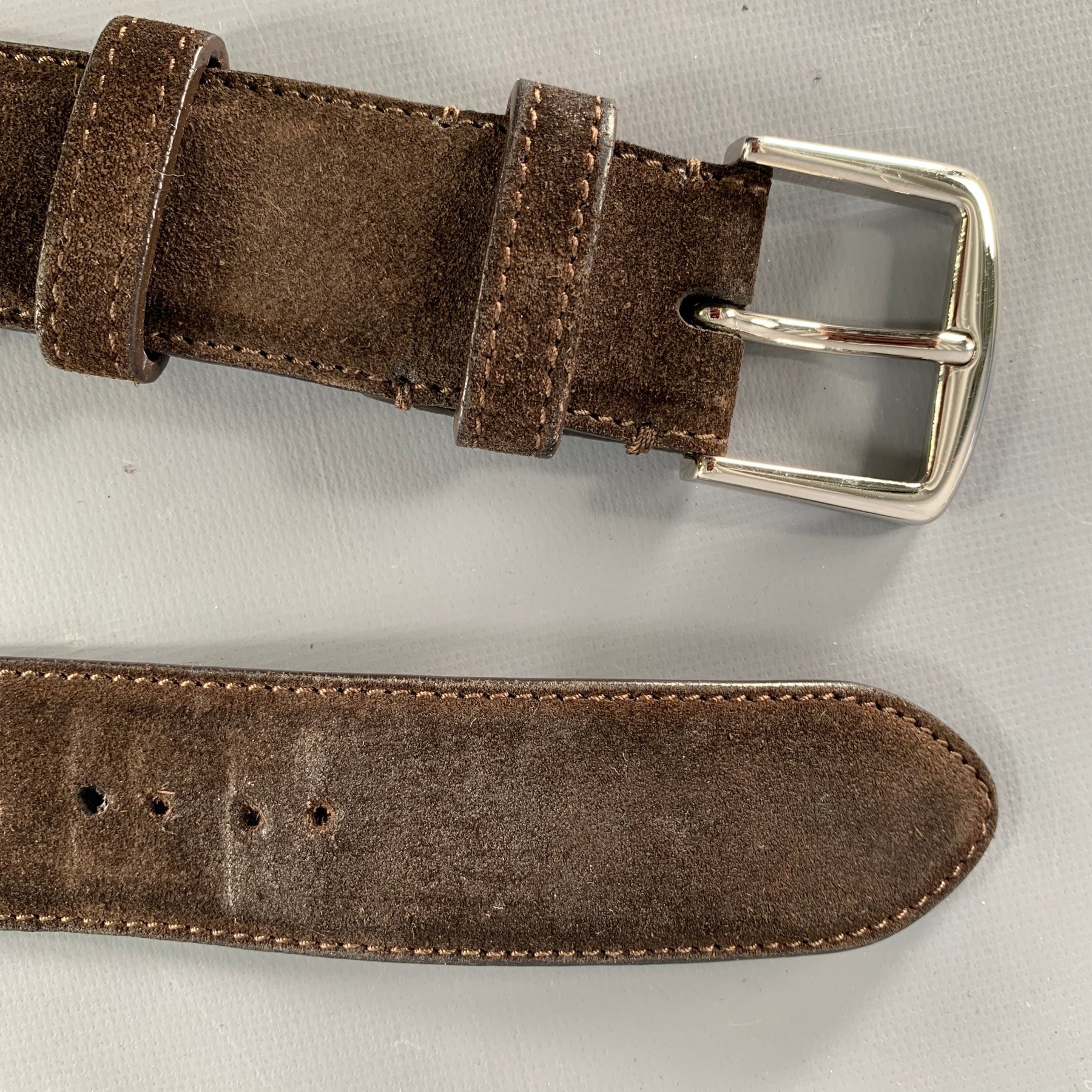LORO PIANA belt in a dark brown suede featuring a silver tone metal buckle. Made in Italy.