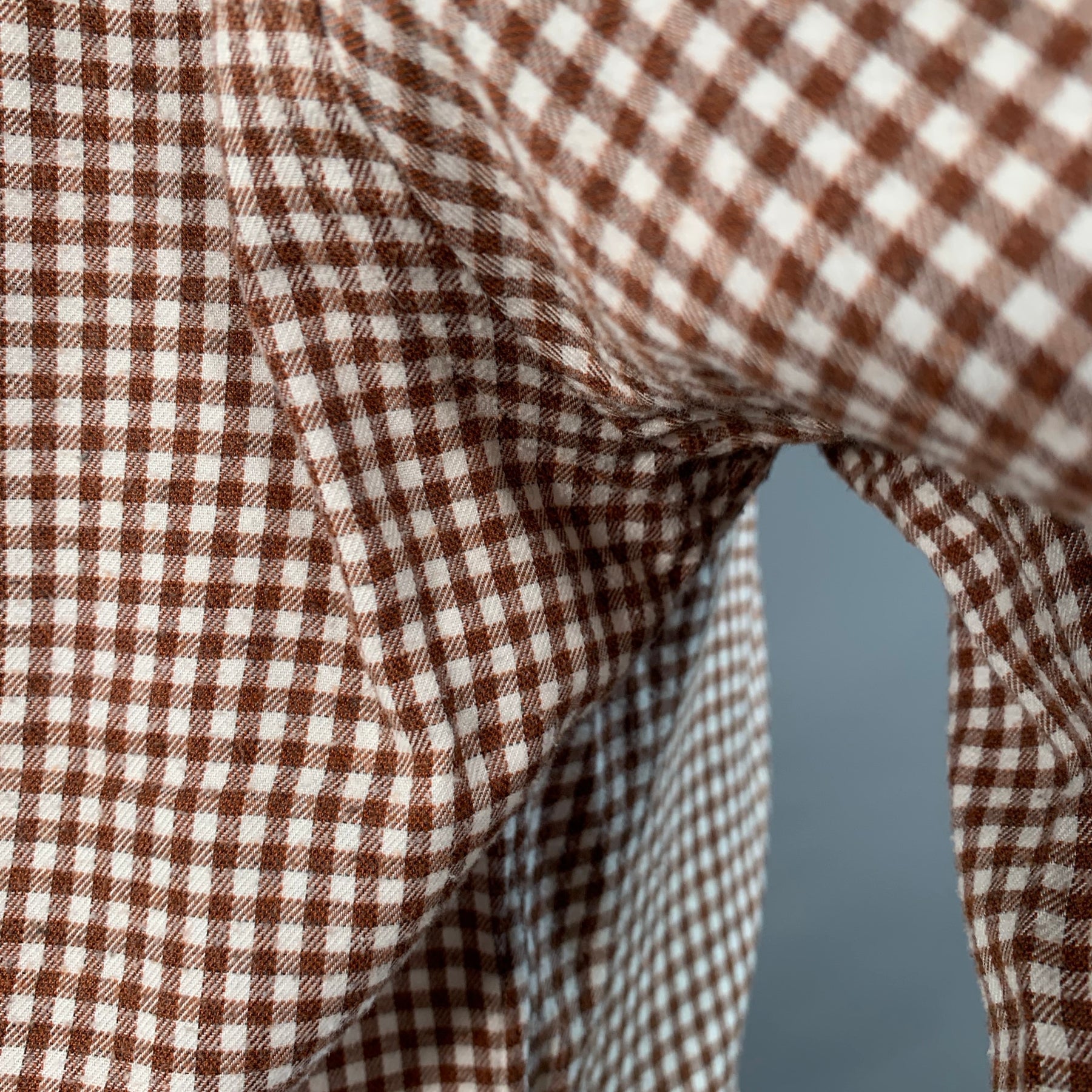 LORO PIANA long sleeve shirt in a brown and white cotton woven fabric featuring a gingham pattern, one pocket, and button closure. Made in Italy.