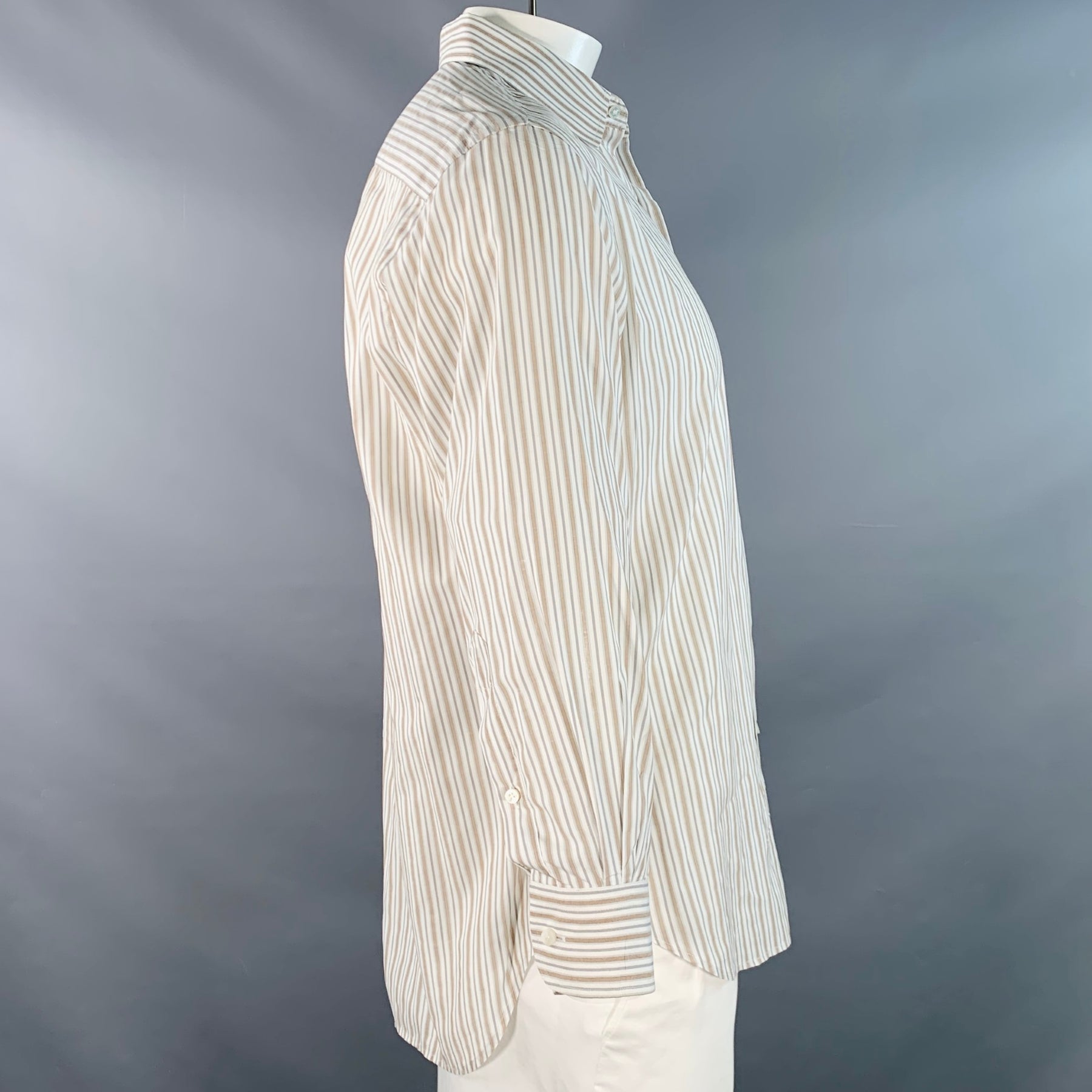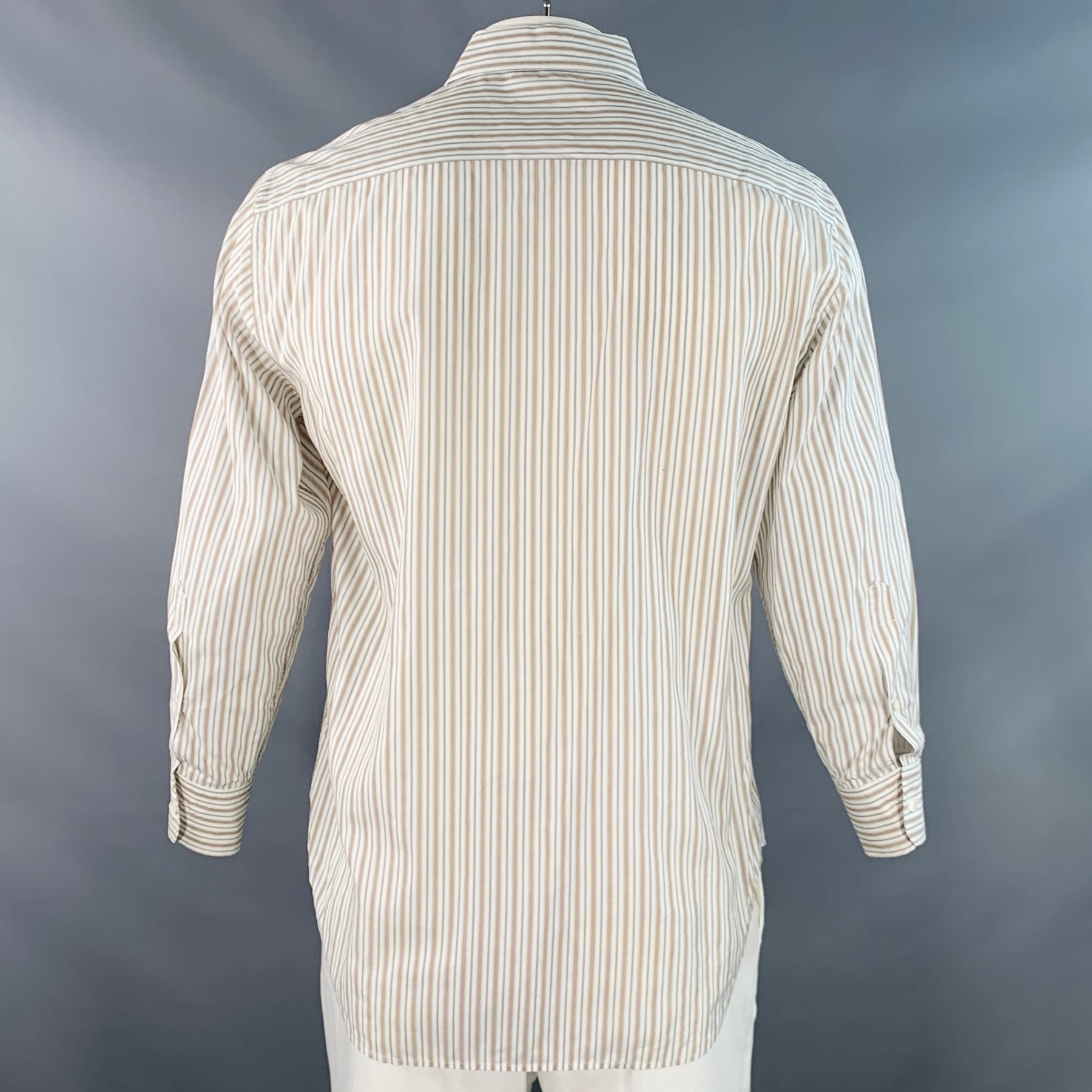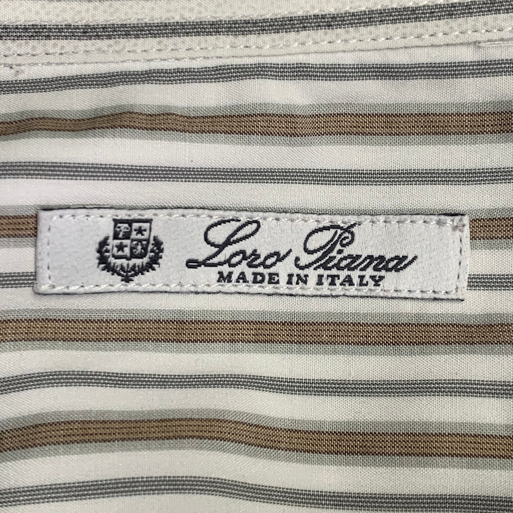 LORO PIANA long sleeve shirt in a white, tan, and grey cotton woven fabric featuring a stripe pattern, one pocket, and button closure. Made in Italy.