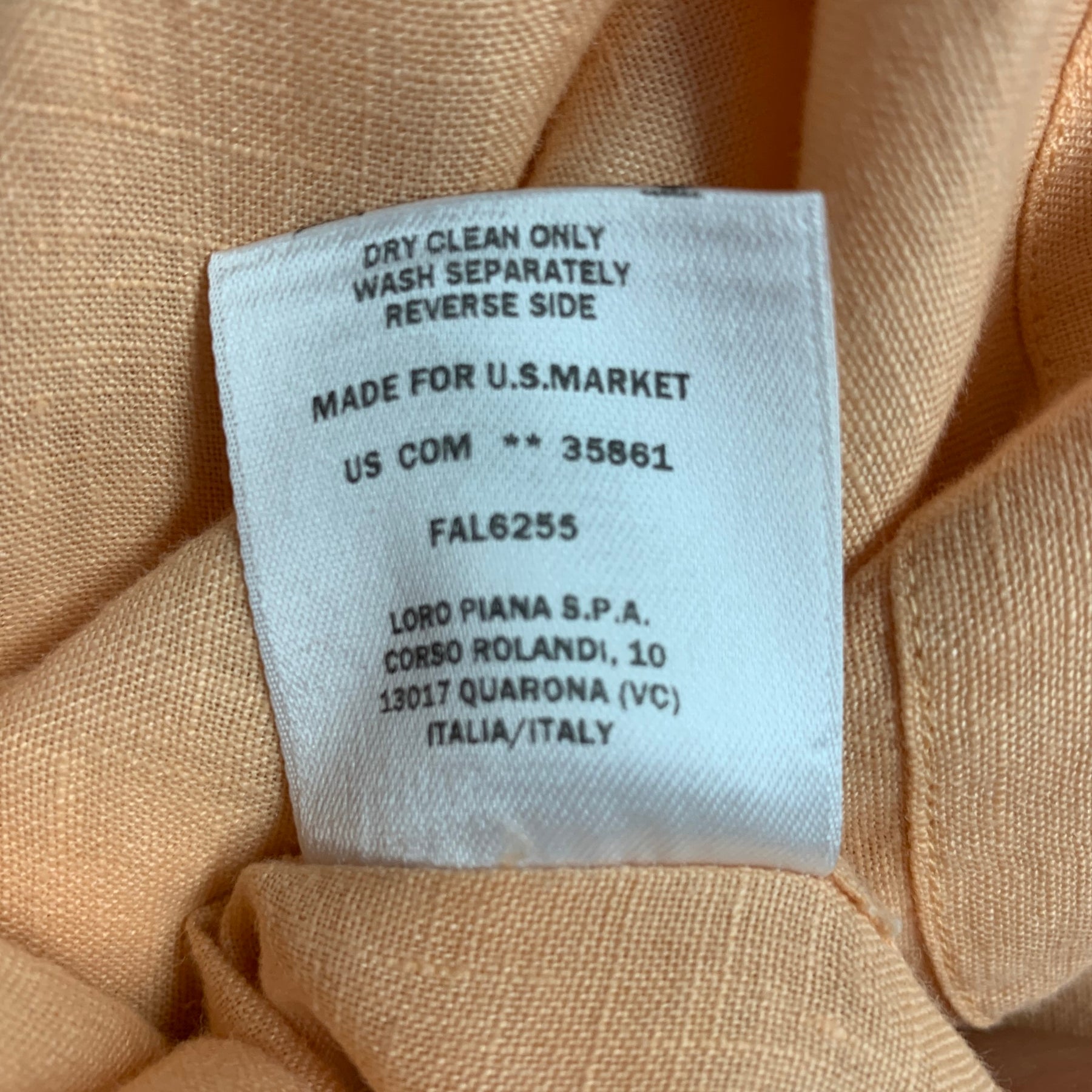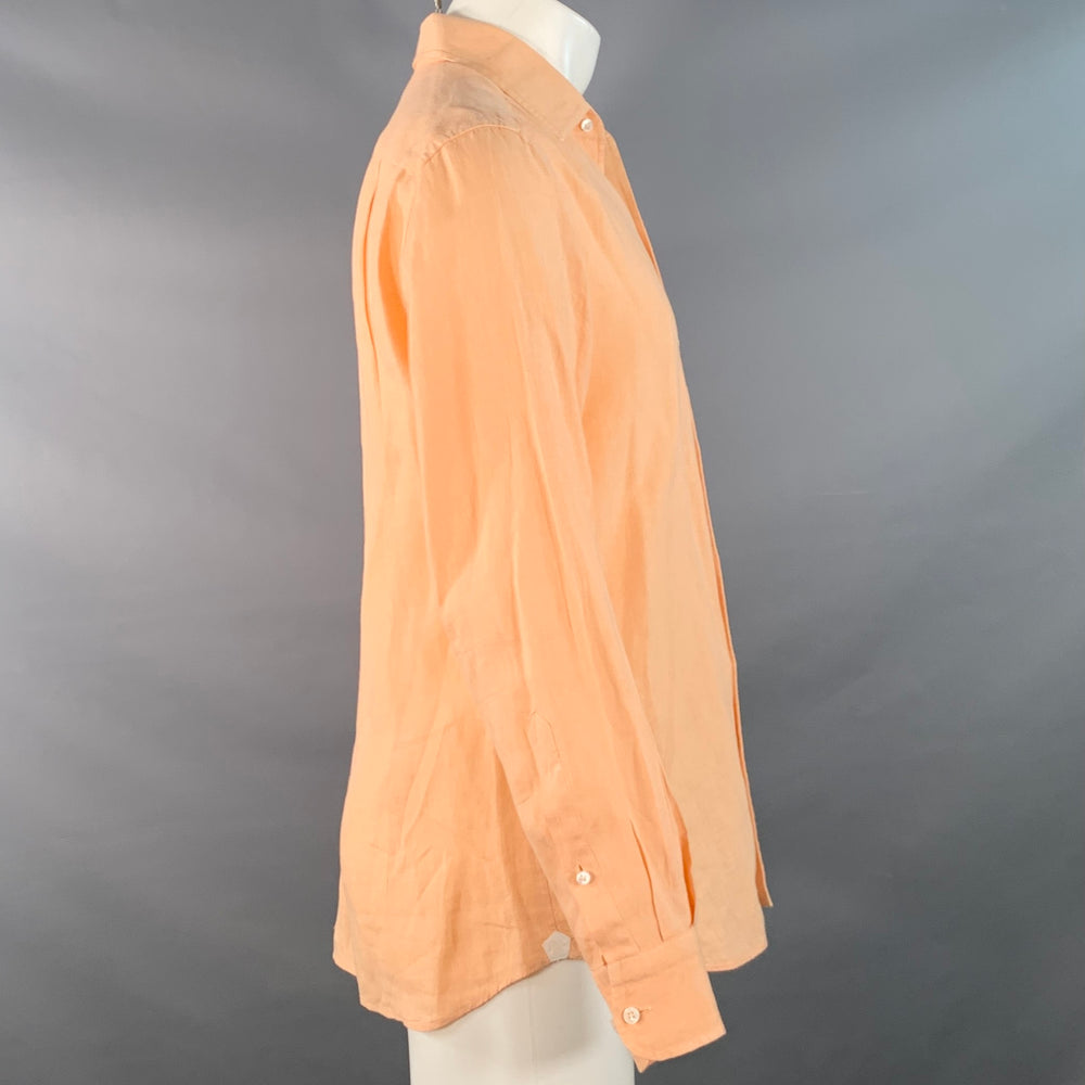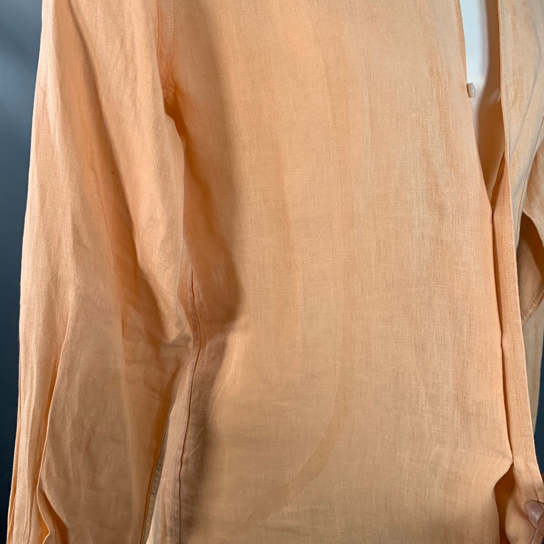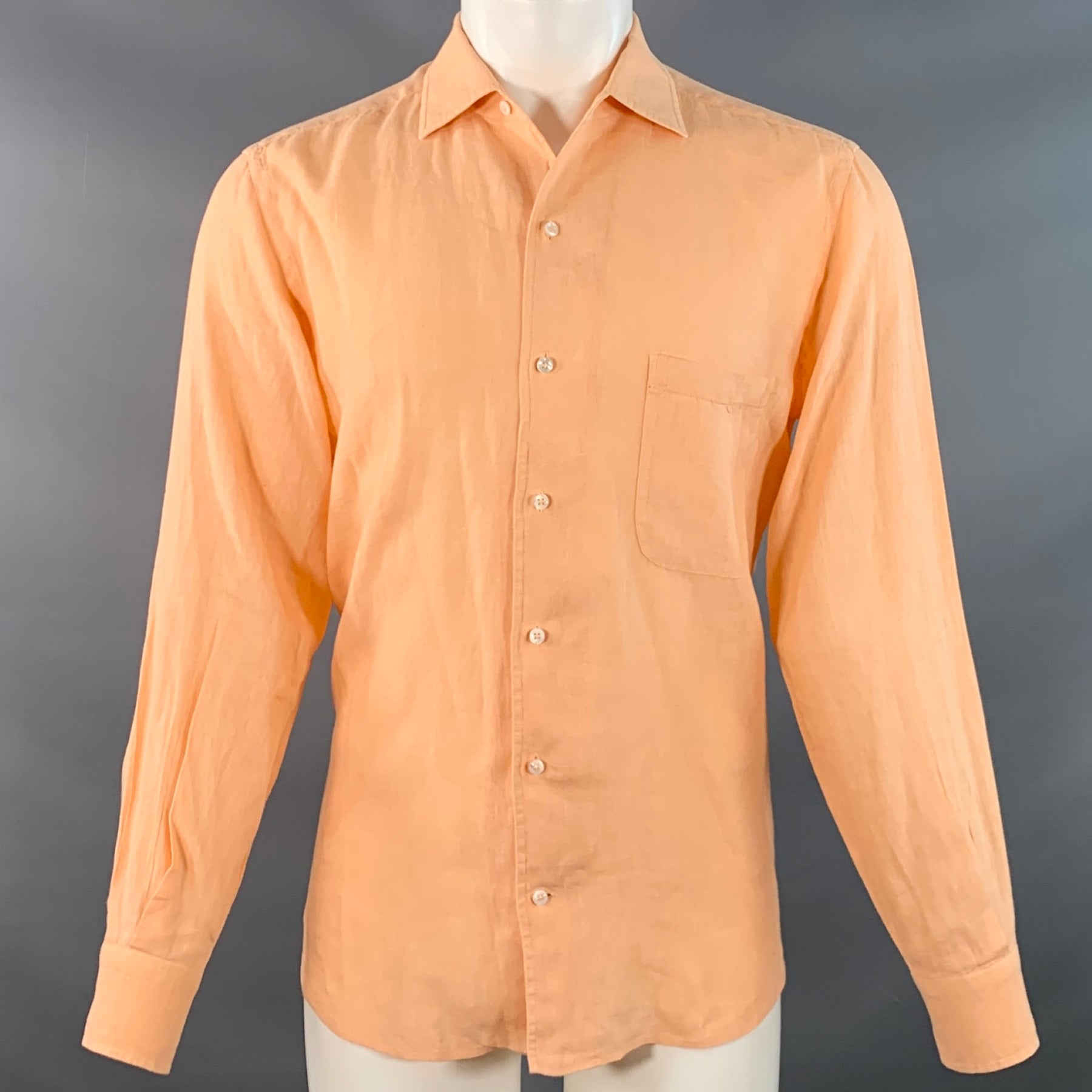 LORO PIANA long sleeve shirt in an orange creamsicle-colored linen featuring a spread collar, one pocket, and button closure. Made in Italy.