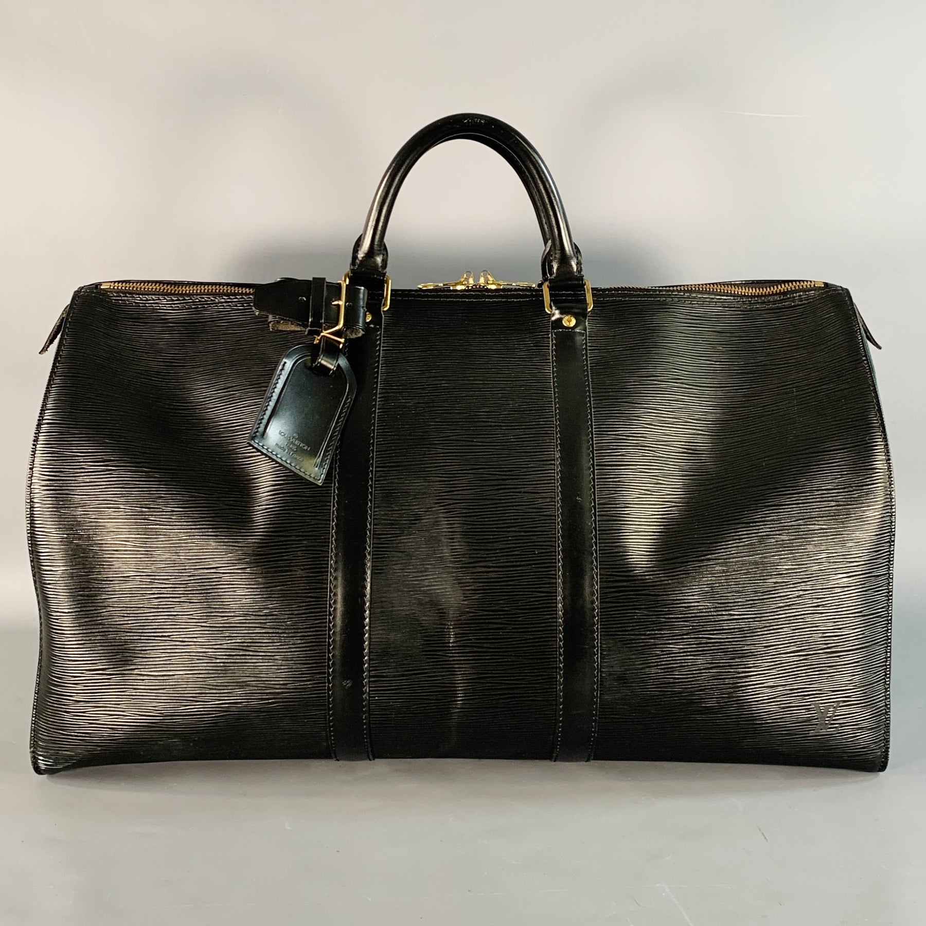 LOUIS VUITTON "Keepall" duffel bag in a black textured epi leather featuring a spacious single interior compartment, rolled leather top handles, and zip closure. Made in France.