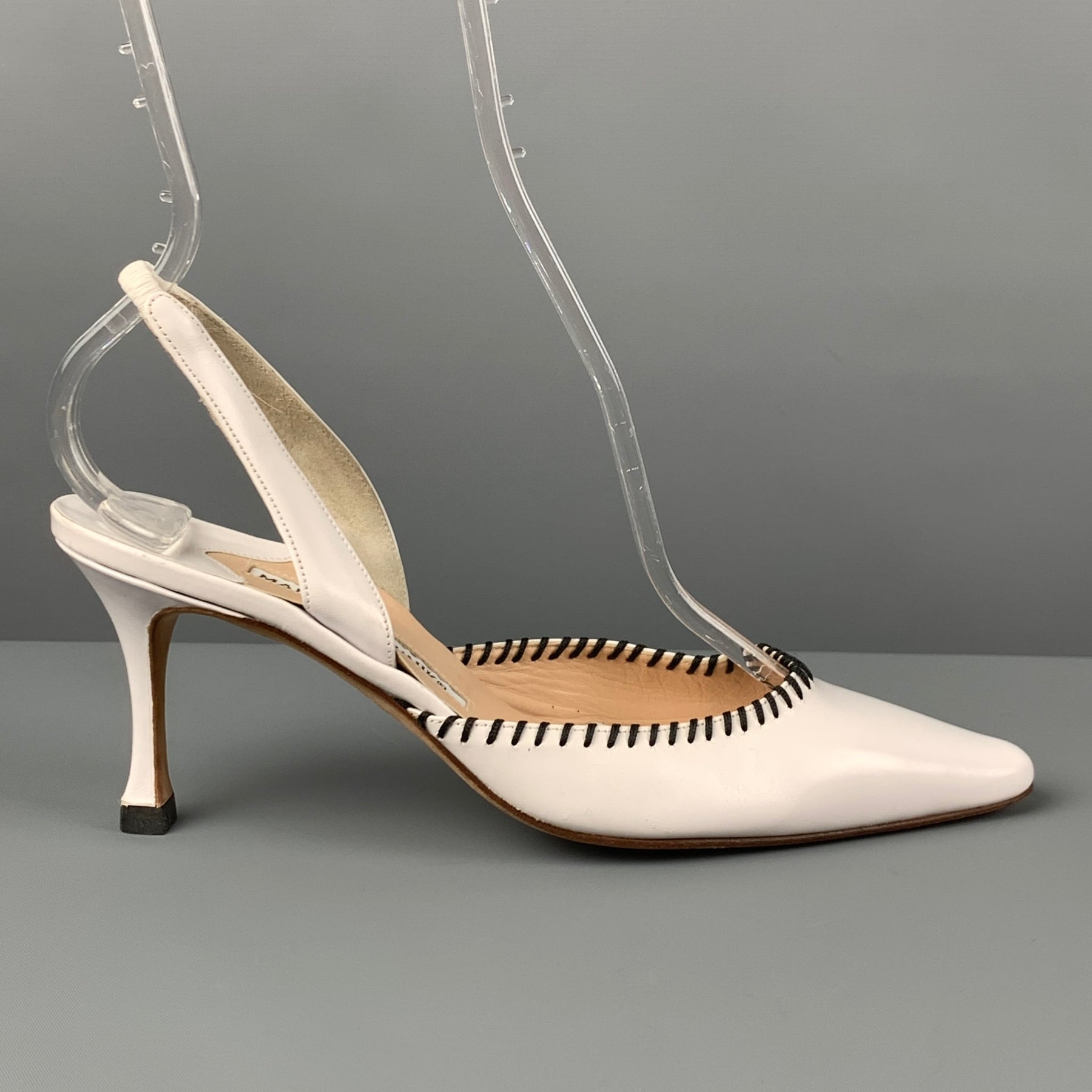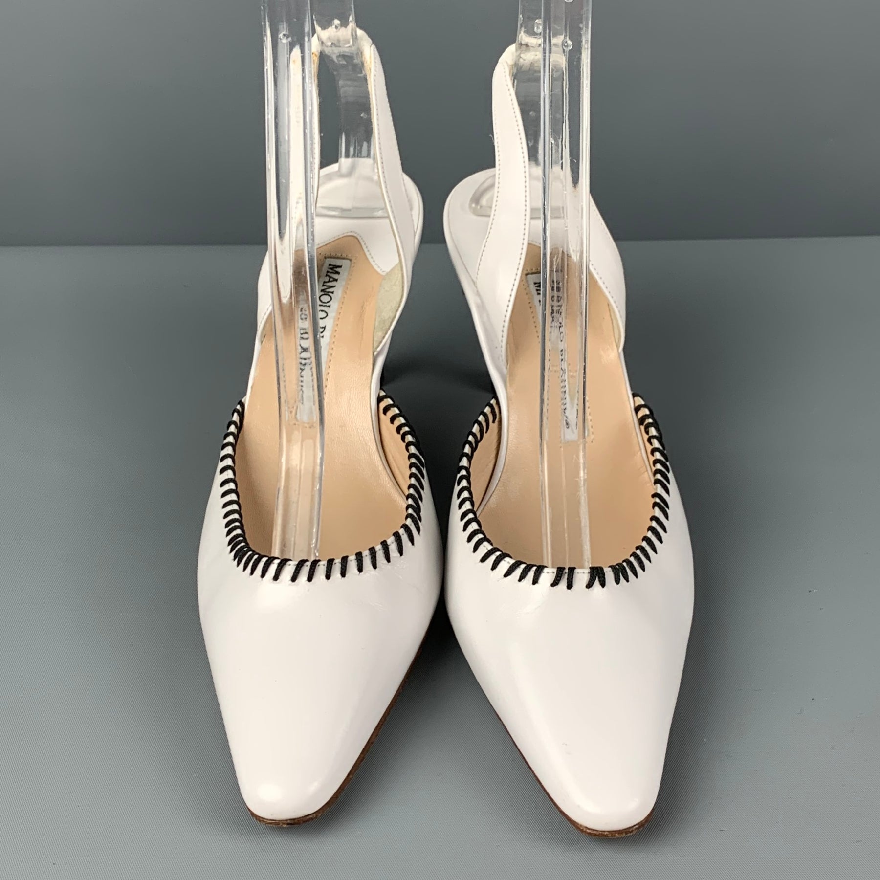 MANOLO BLAHNIK pumps comes in a white leather featuring a black stitched detail, slingback style, and a stiletto heel. Made in Italy.