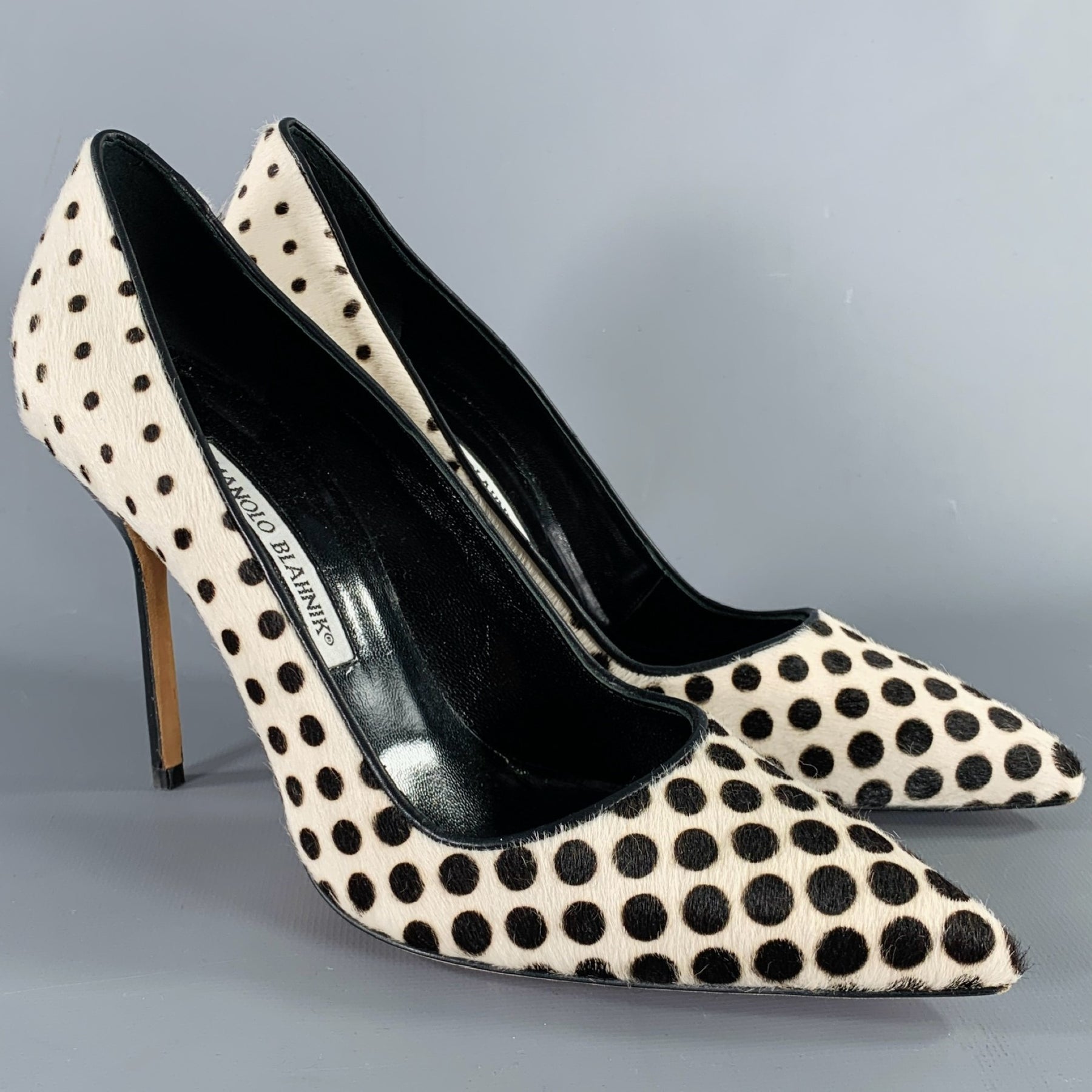 MANOLO BLAHNIK Size 7.5 White Black Dots Pony Hair Stiletto Pumps