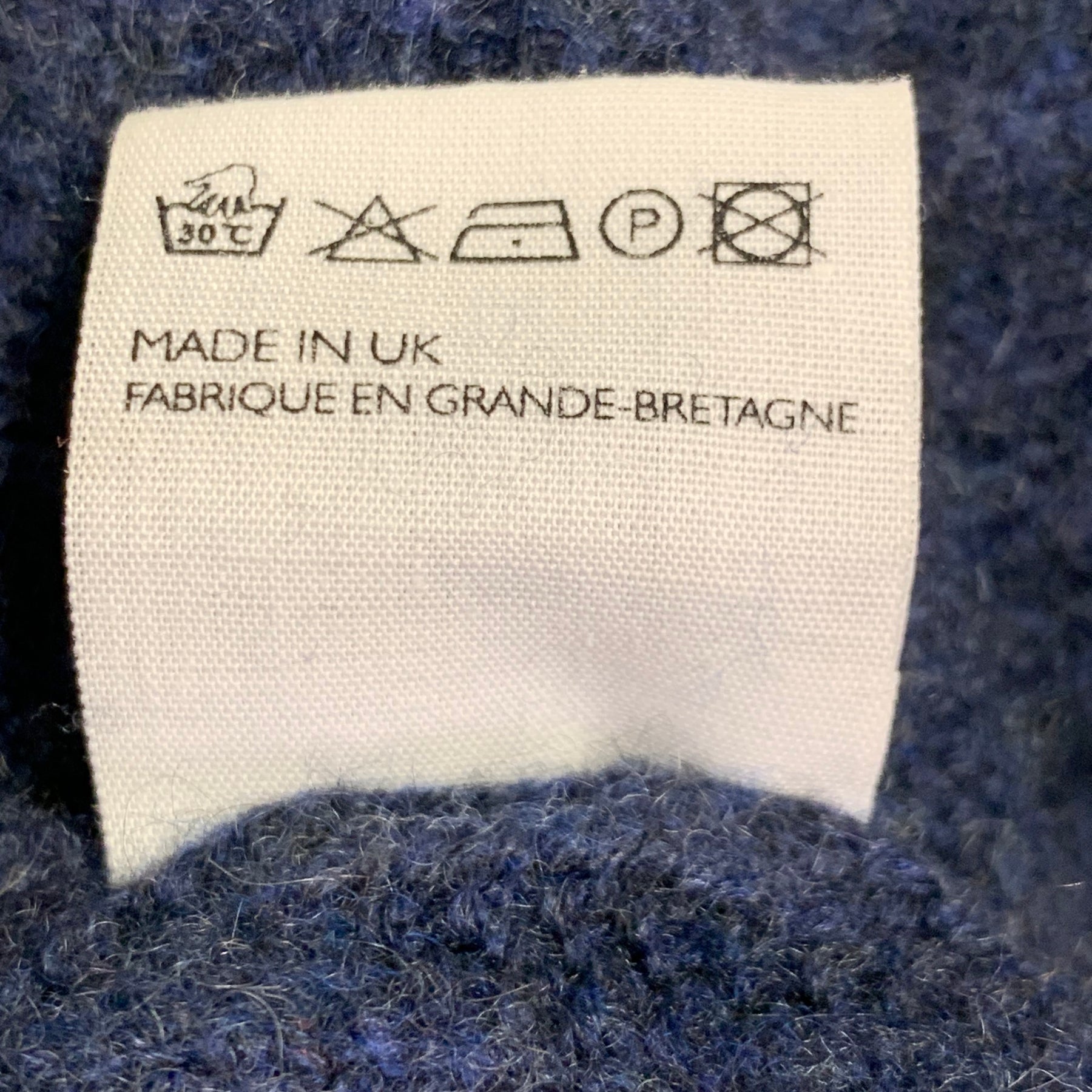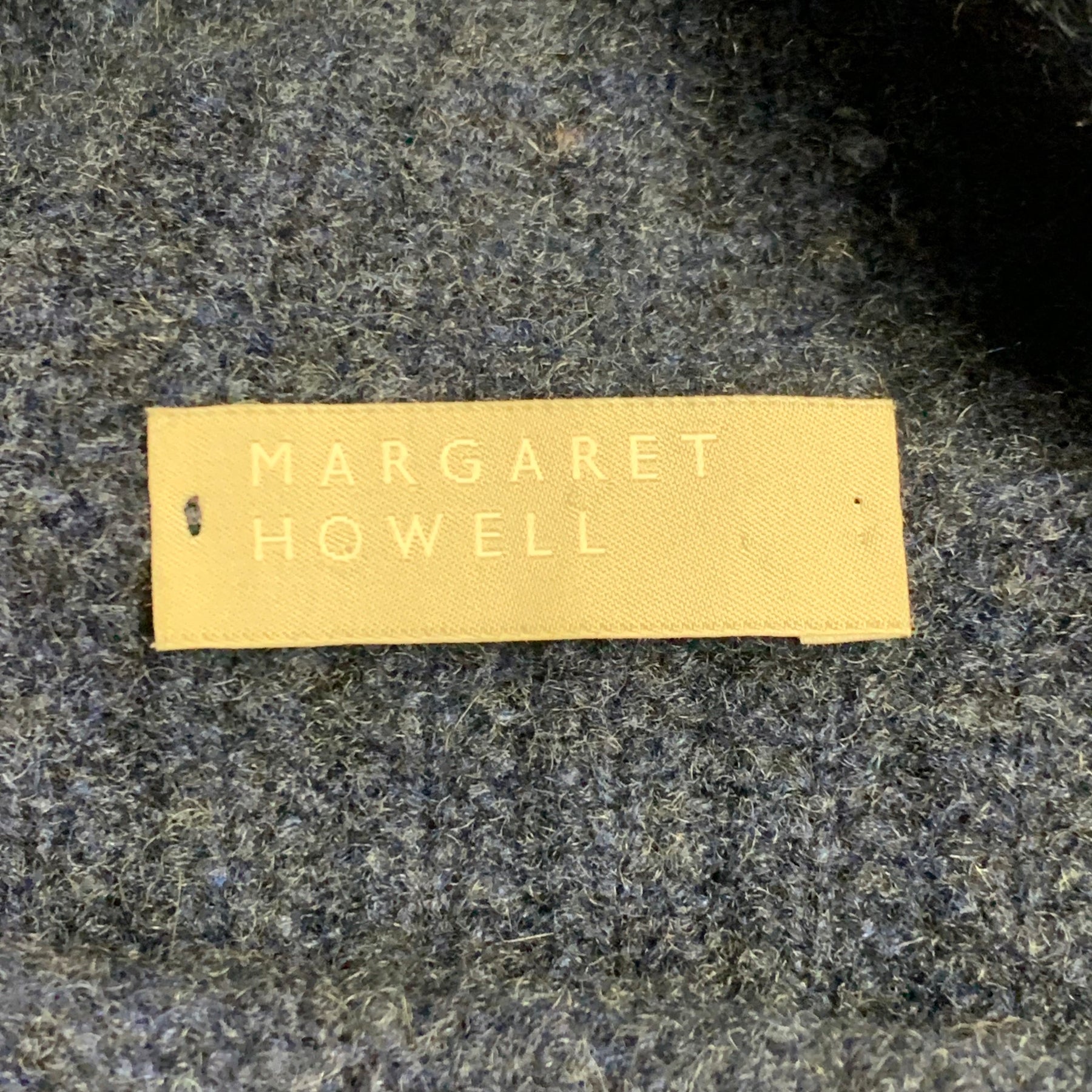 MARGARET HOWELL sweater in a navy cashmere knit featuring a rib knit pattern, long sleeves, and high neck.