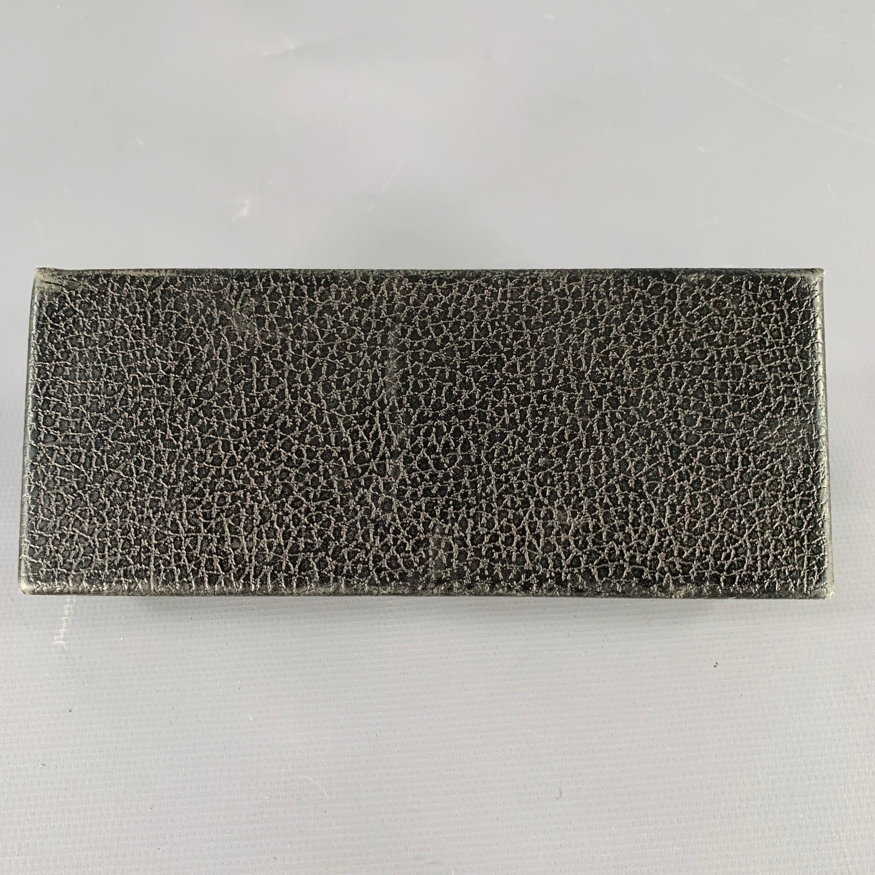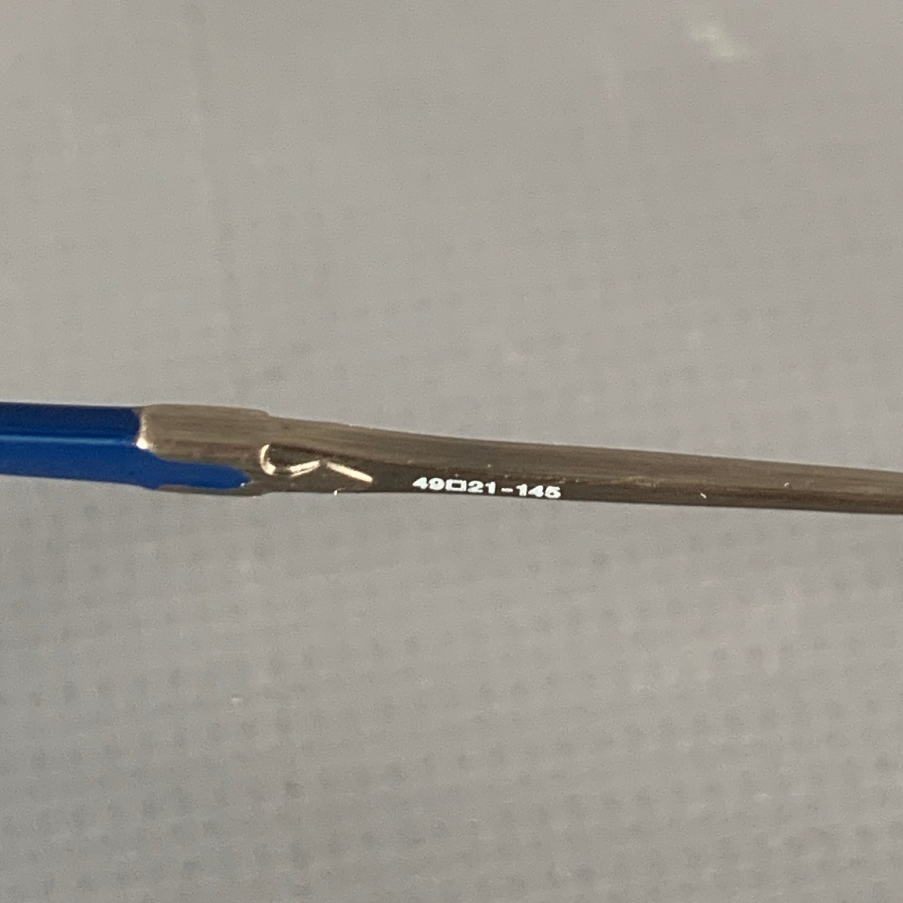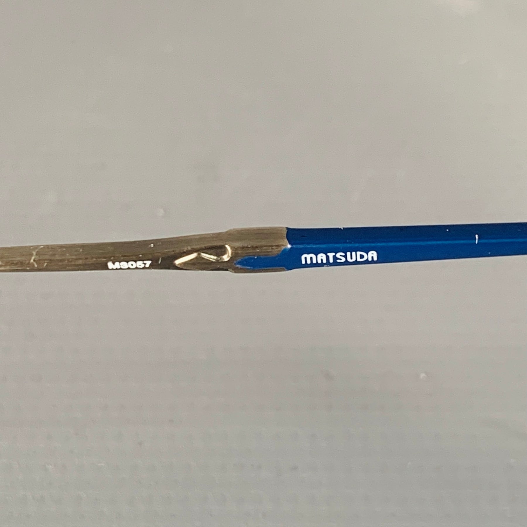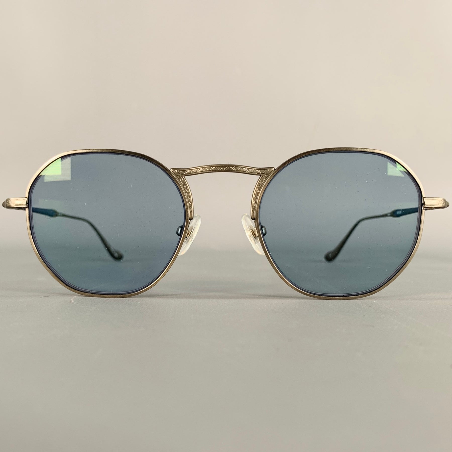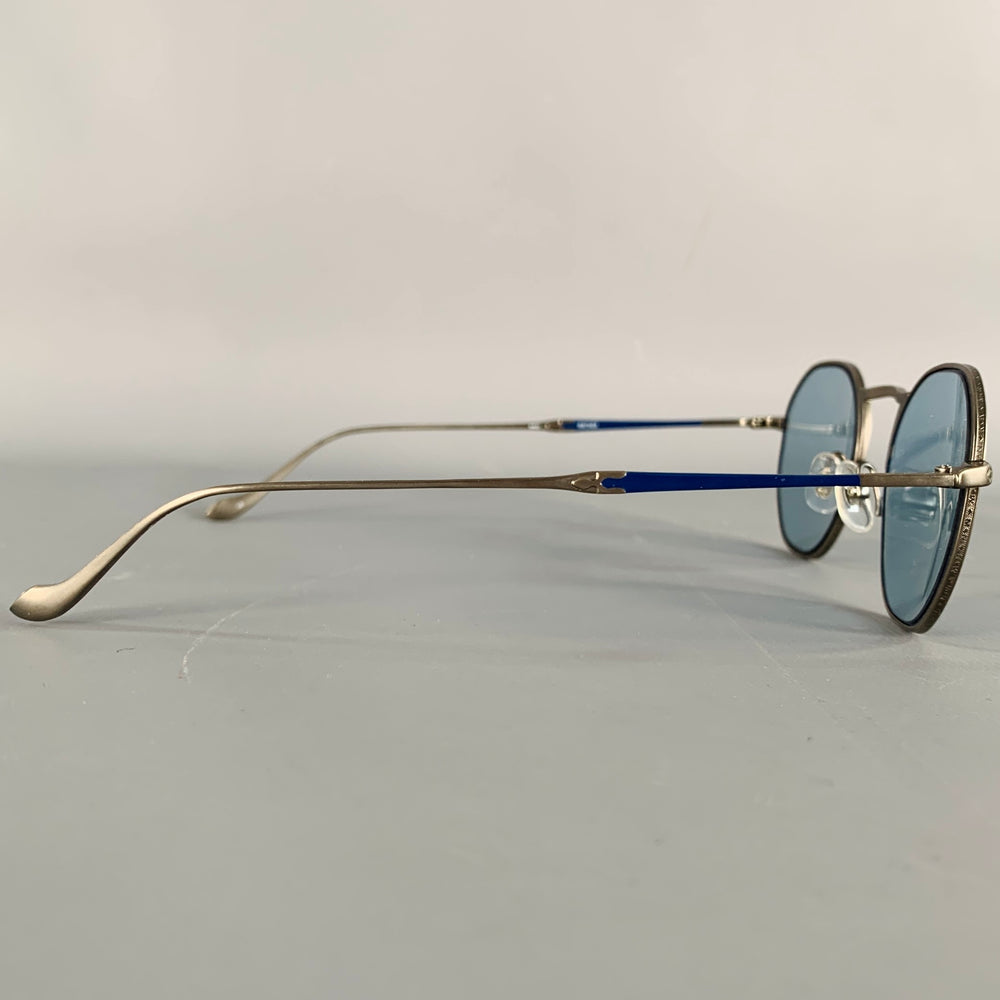 MATSUDA M3057 sunglasses in a silver tone titanium featuring a geometric shape with silver tone filigree design, and blue tinted lenses. Comes with case. Handmade in Japan.