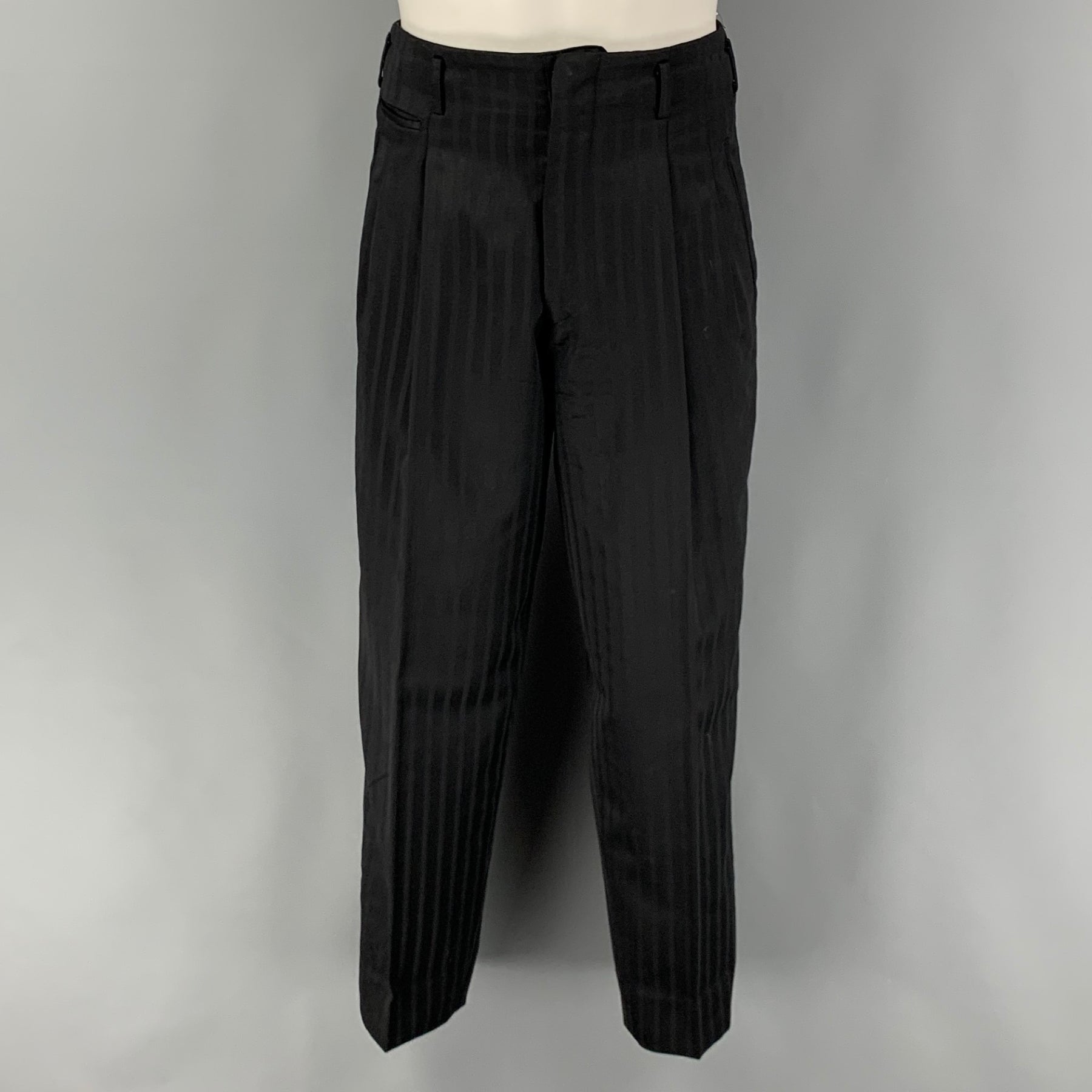 MATSUDA VINTAGE suit comes in black striped wool woven material with a full liner and includes a double breasted closure with a peak lapel and matching high waist pants. Made in Japan.