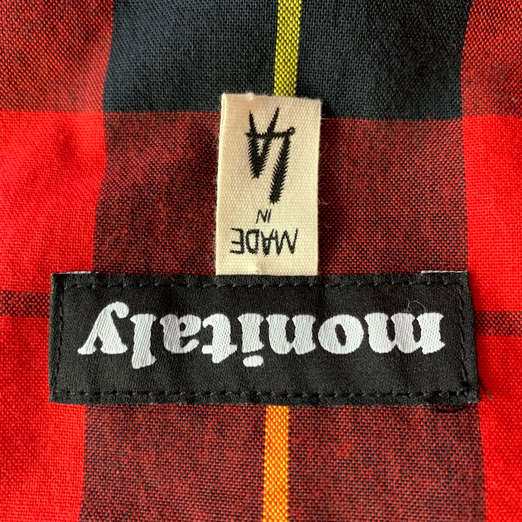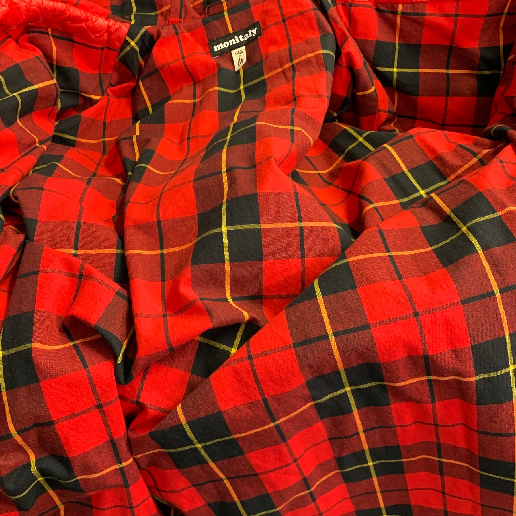 MONITALY coat in a red nylon fabric with cotton plaid lining featuring a quilted design, hooded style, and buckle clasp closure.