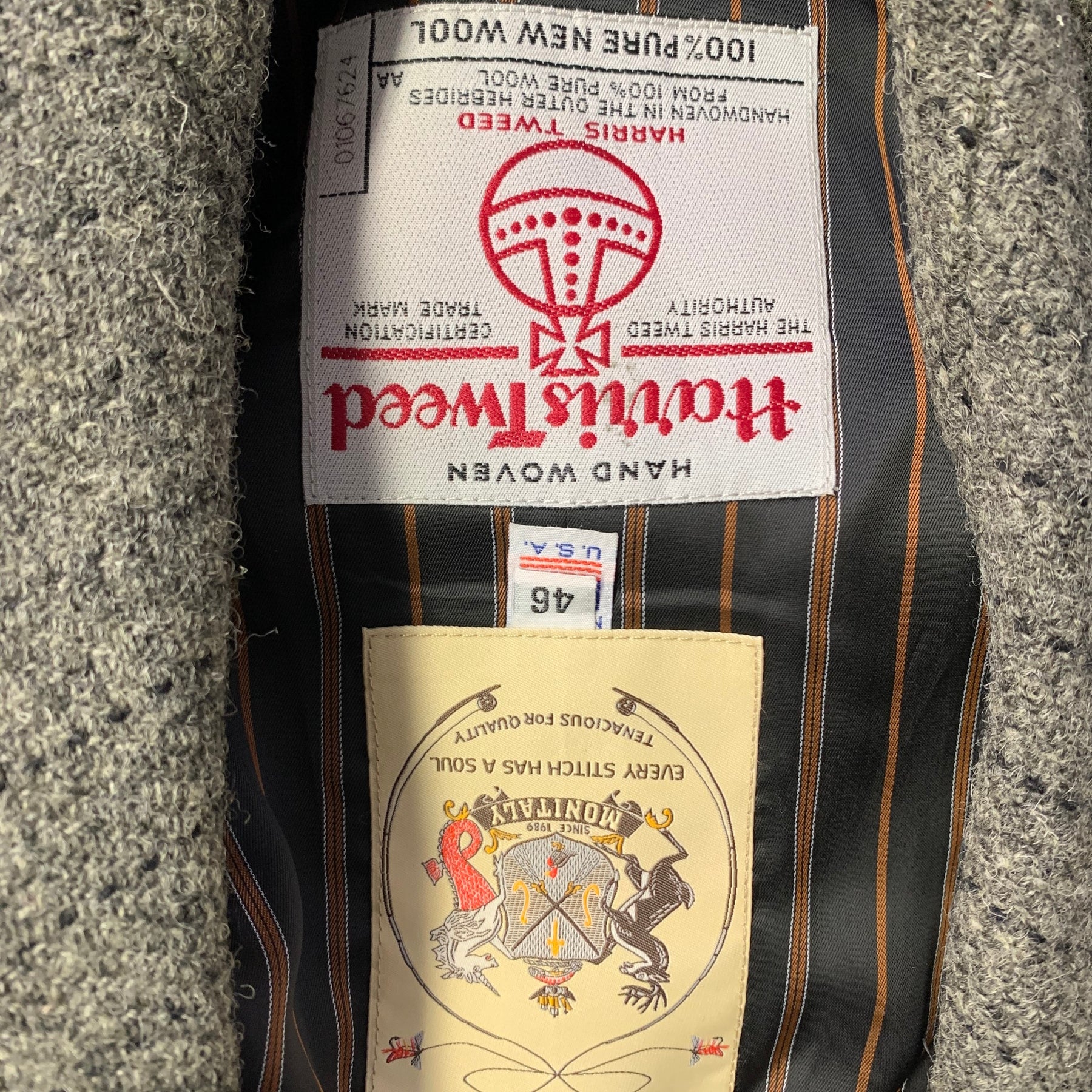 MONITALY for HARRIS TWEED vest in a grey and black virgin wool featuring a stripe pattern, notch lapel, and button closure. Made in USA.