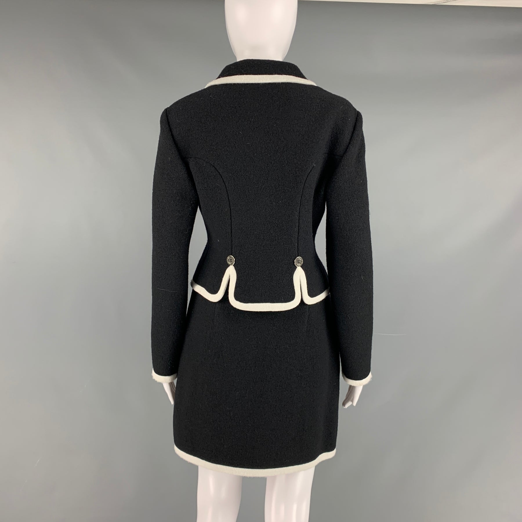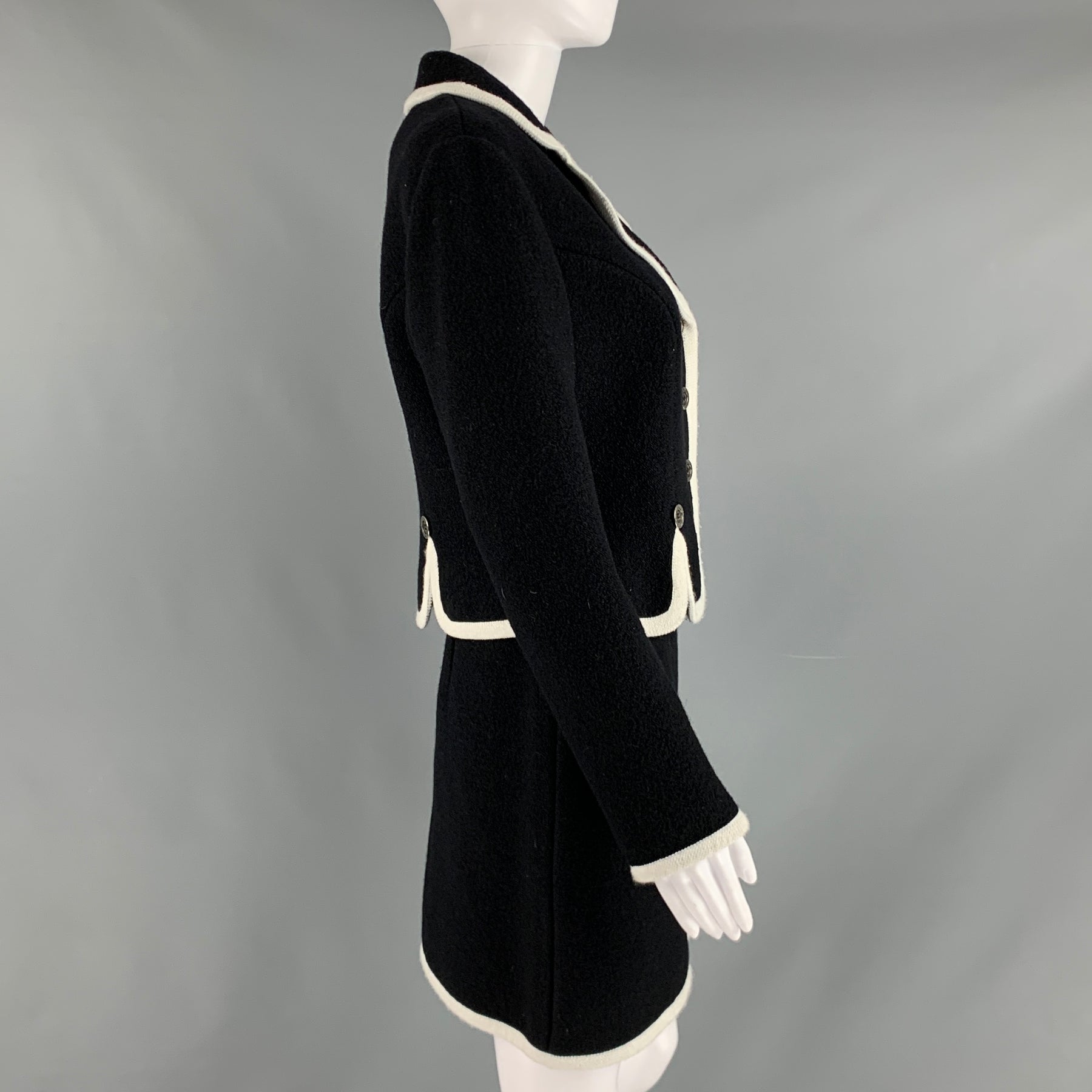 MOSCHINO Size 8 Black White Virgin Wool Contrast trim Single breasted Skirt Suit