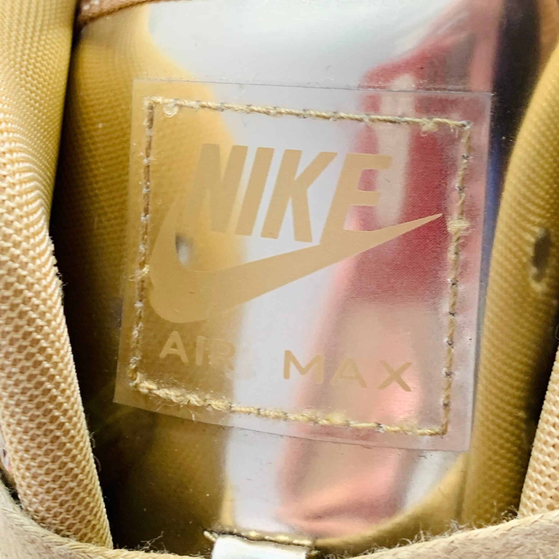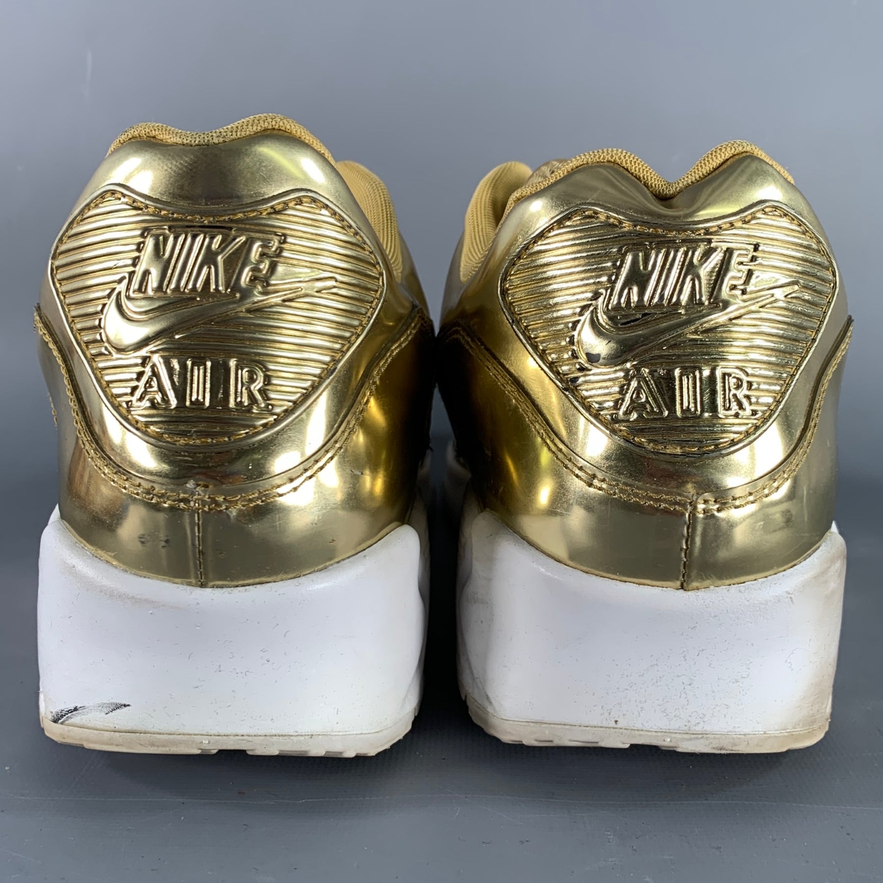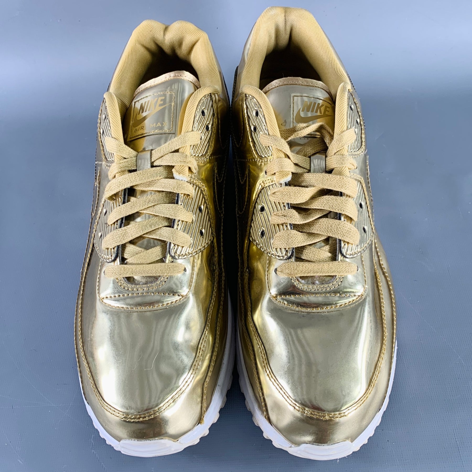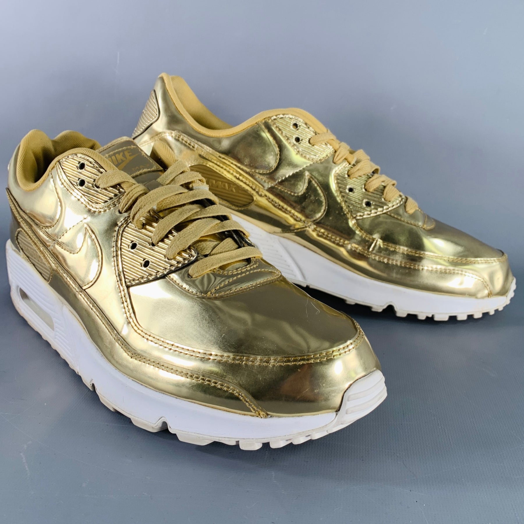 NIKE 2020 30th Anniversary Limited Edition sneakers in a metallic gold tone faux patent leather featuring a low top style, foam sole, and lace-up closure.