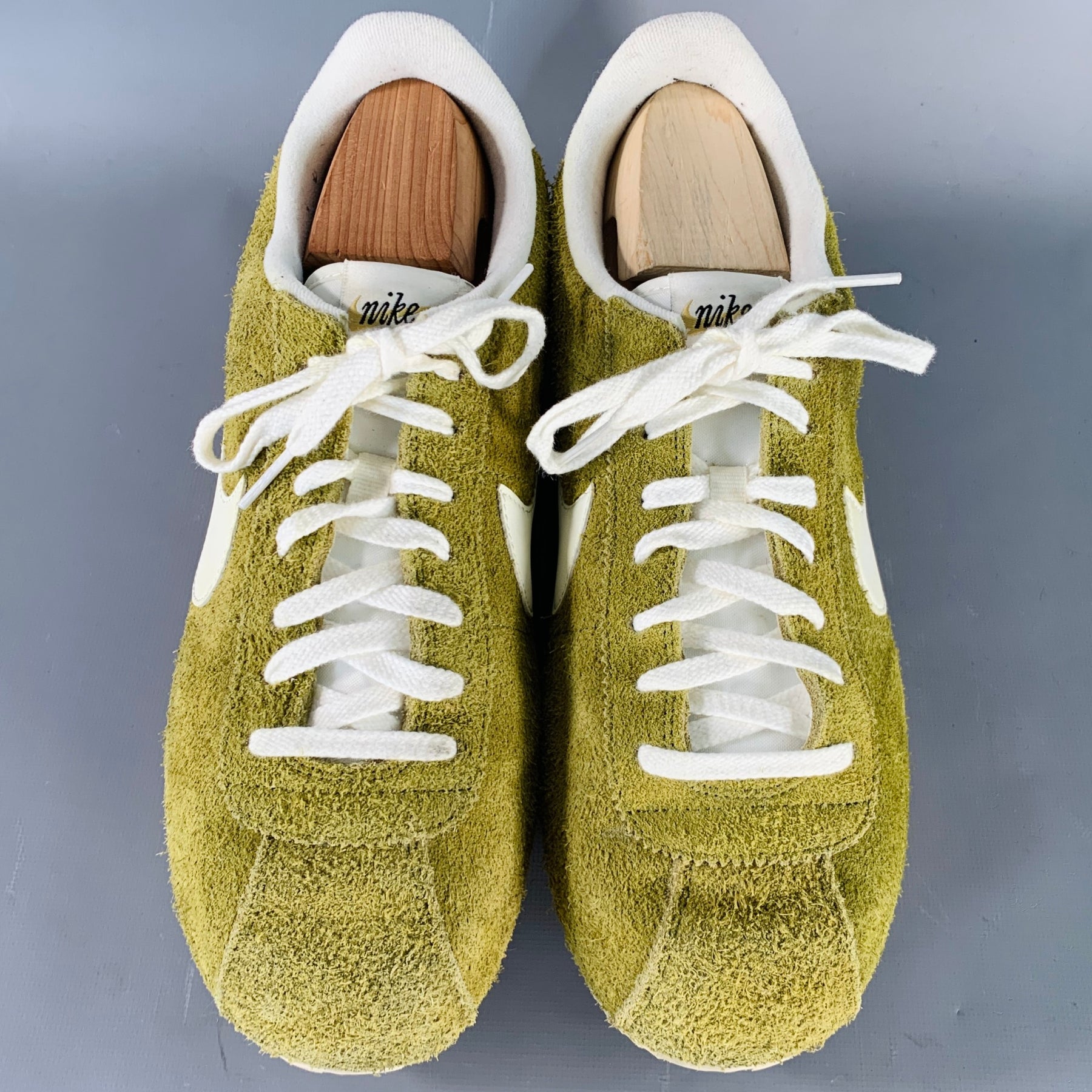 NIKE "Cortez SE" sneakers in a shaggy moss green suede featuring a low top style, foam sole, and lace-up closure. Shoe trees not included.