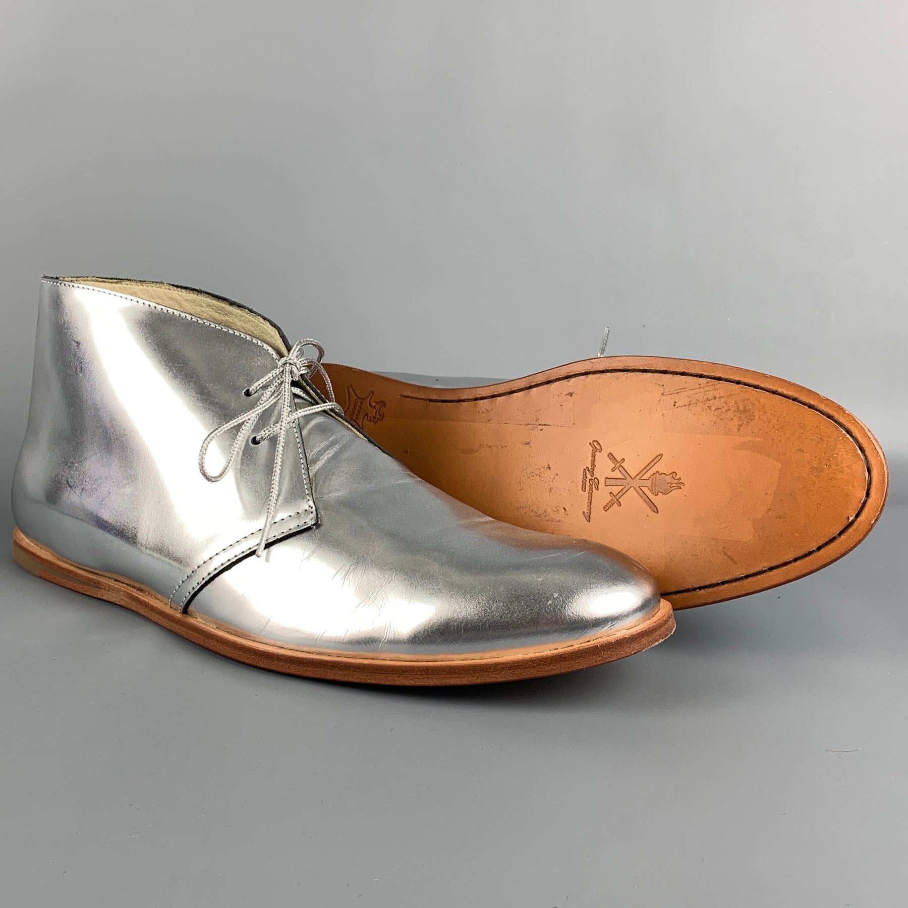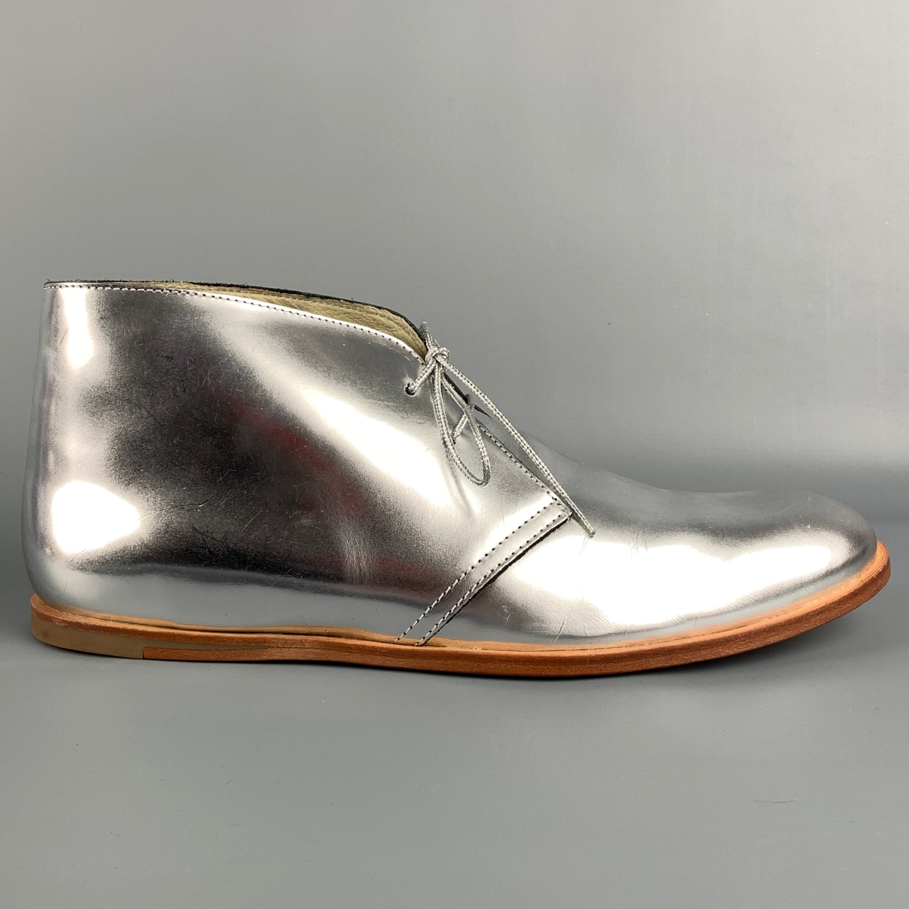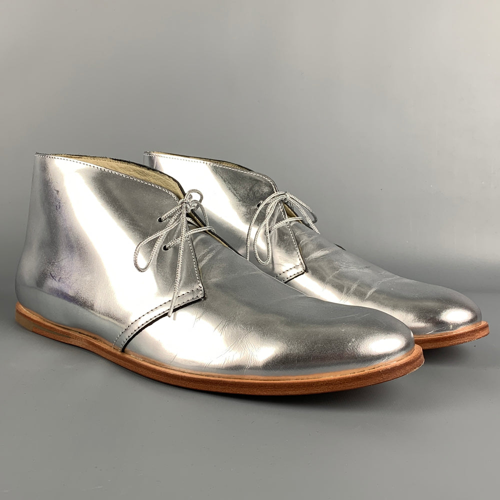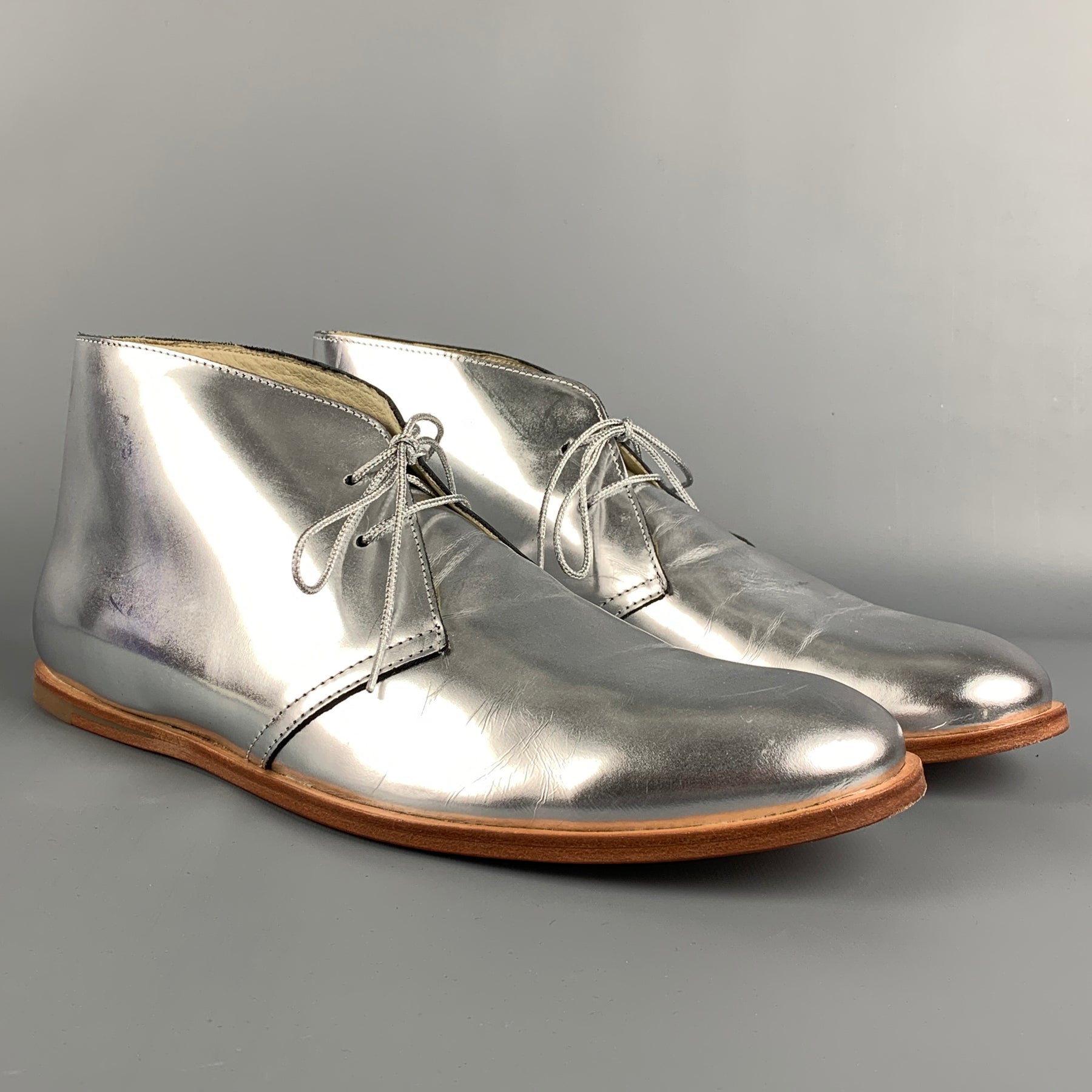 OPENING CEREMONY boots comes in a silver metallic leather featuring a chukka style, round toe, and a lace up closure. Includes box. Made in Portugal.