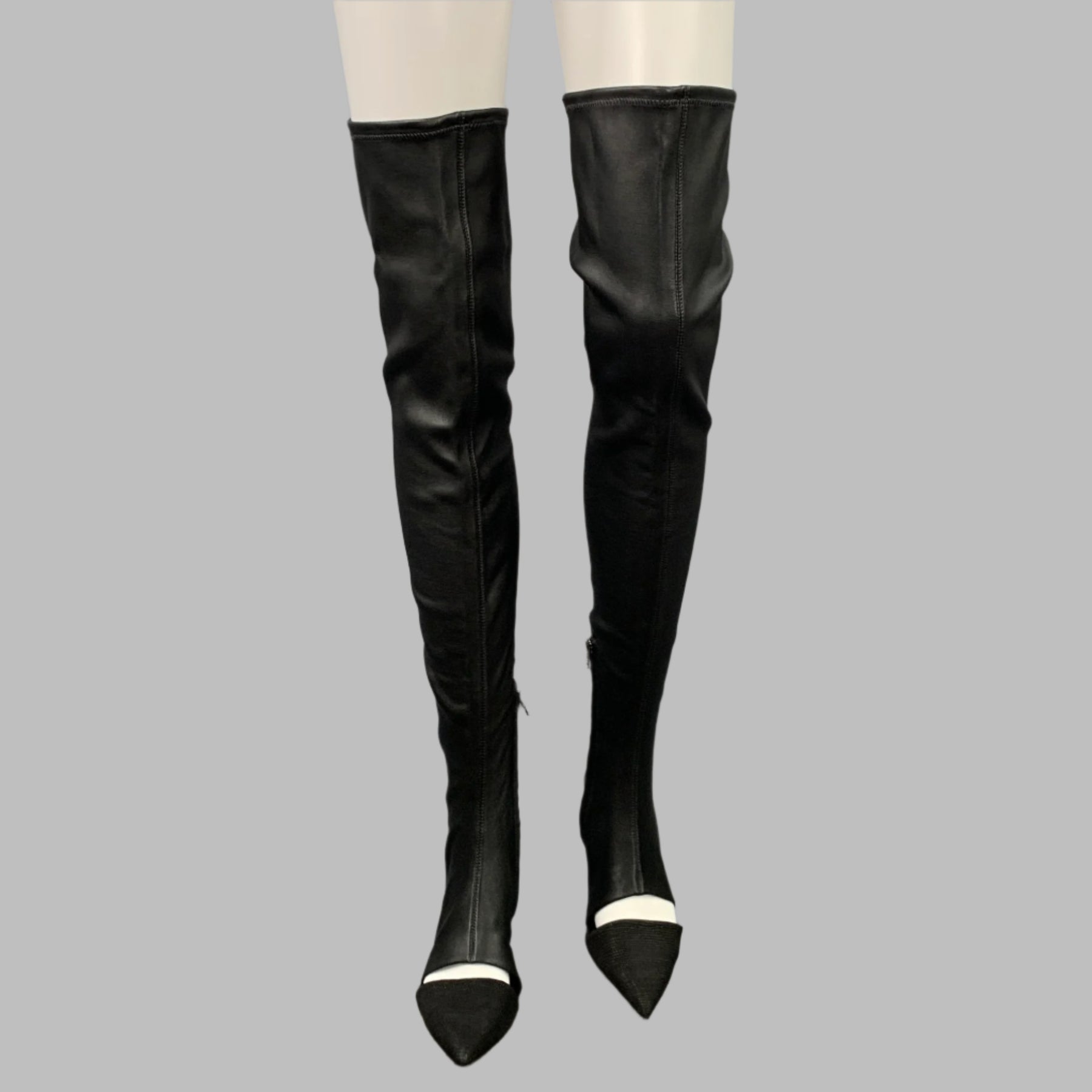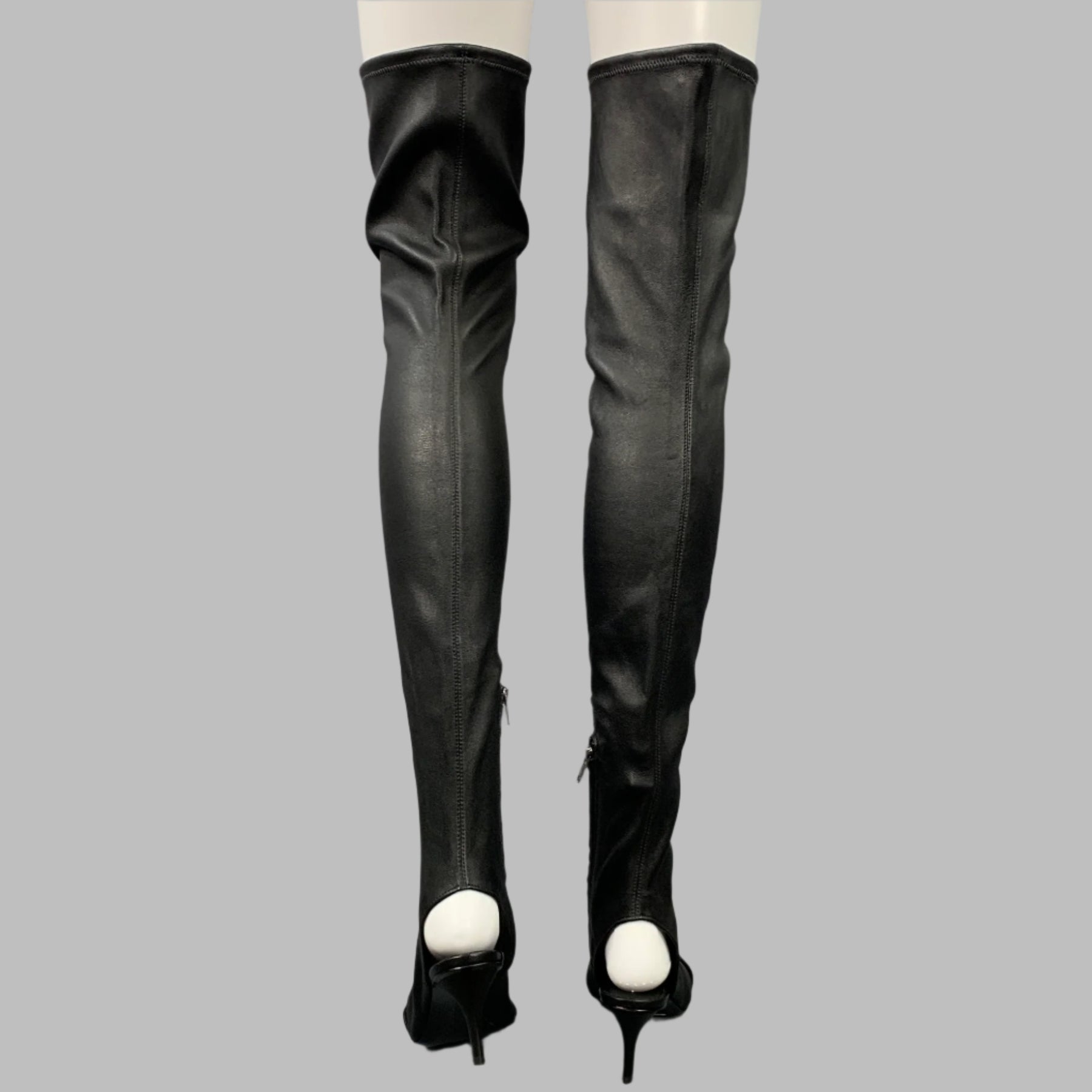 OPENING CEREMONY boots in a black leather featuring a thigh high style, cutouts at heel and upper, and embossed pointed toe detail.