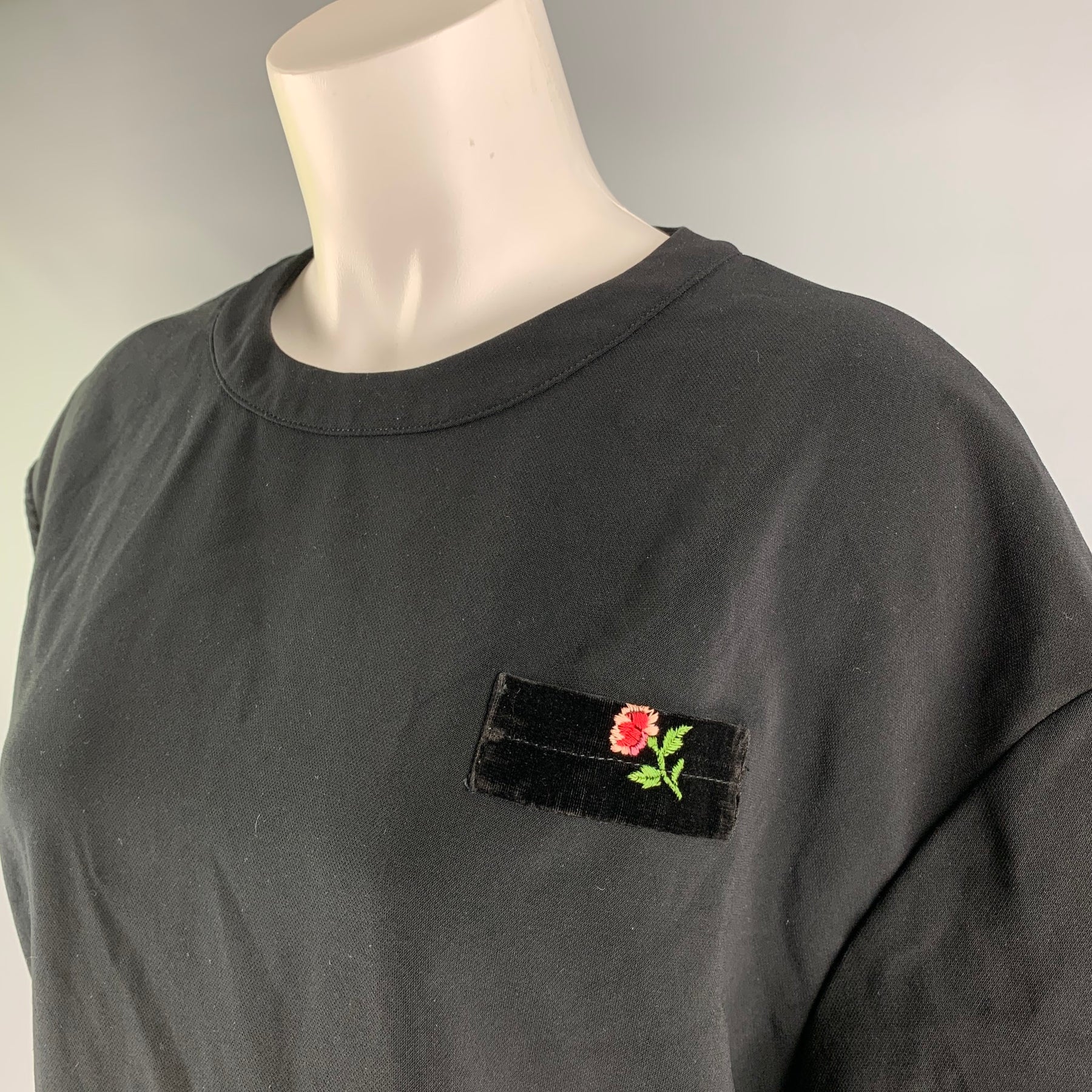 OPENING CEREMONY oversized casual top comes in a black polyester and viscose jersey fabric featuring velvet and embroidered flower detail at right side, asymmetrical sleeves and half zip up closure at center back. Made in New York.