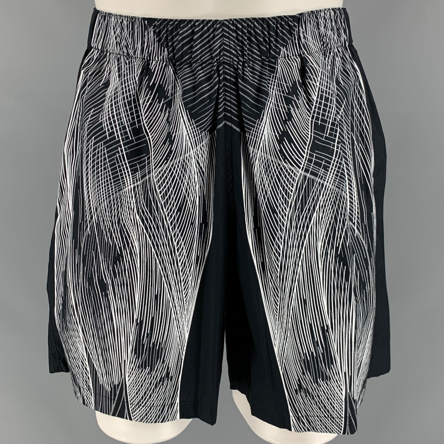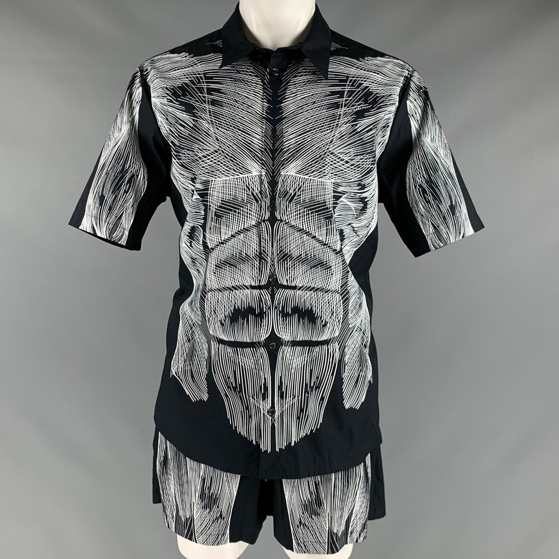 OPENING CEREMONY set in a black cotton fabric featuring white muscle print, spread collar, and button closure. Comes with matching shorts. Made in Italy.