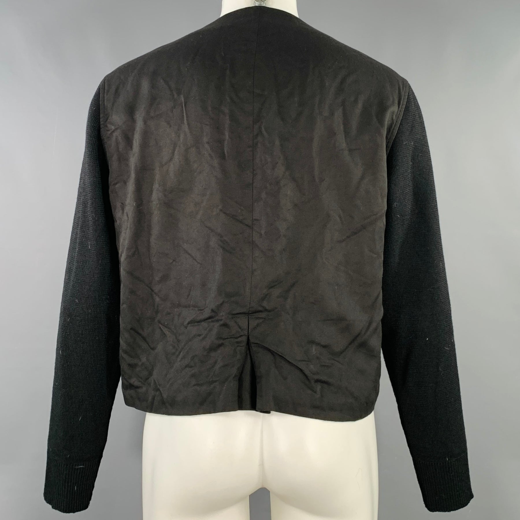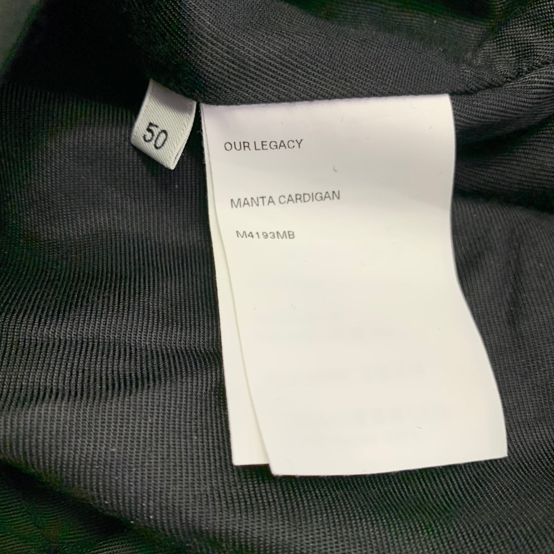 OUR LEGACY "Manta Cardigan" in a black cotton wool featuring a mixed fabrics design with rib knit sleeves, three pockets, and button closure. Made in Portugal.