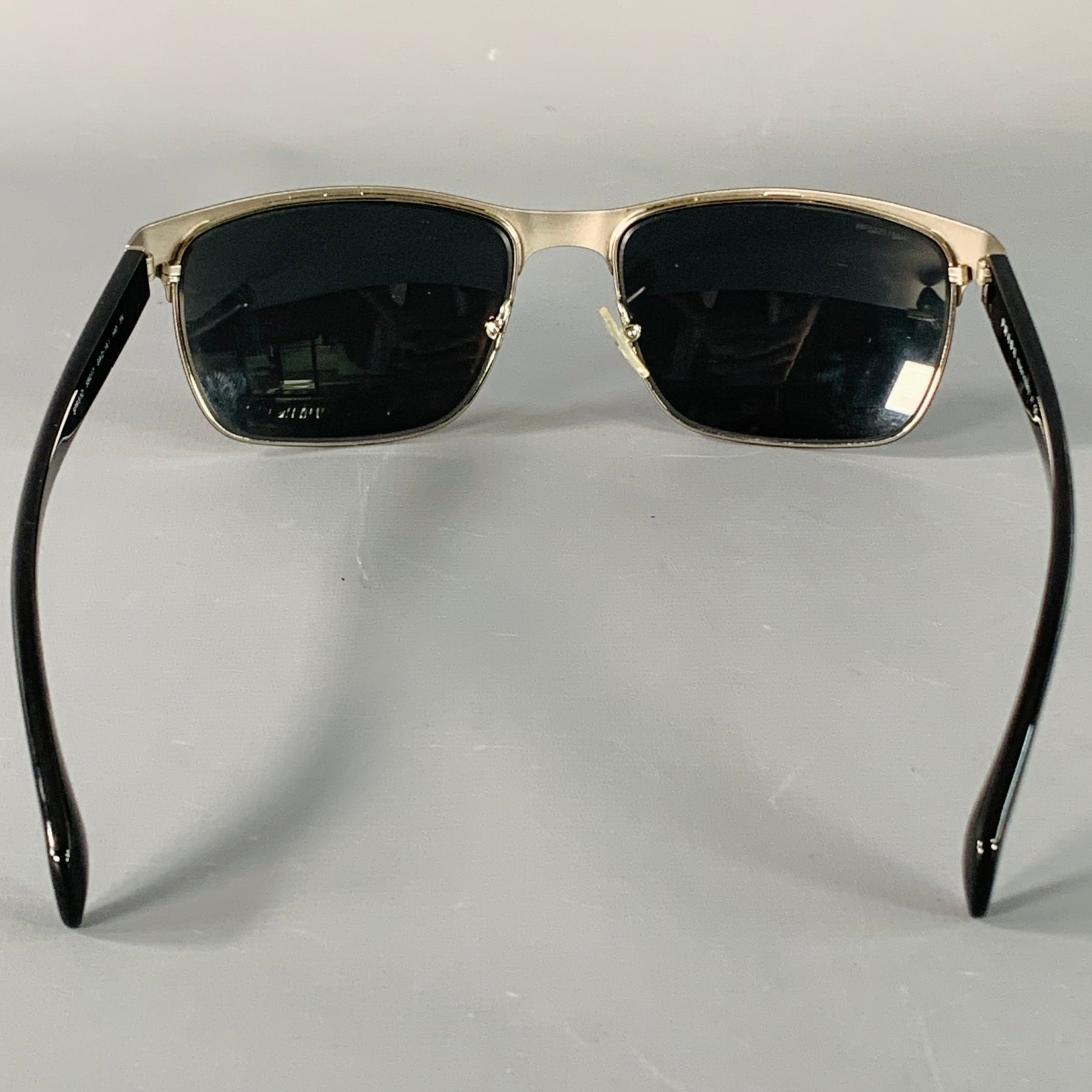 PRADA sunglasses in a semi-rimless black acetate with silver tone metal details featuring a rectangular shape and polarized lenses. Comes with case.