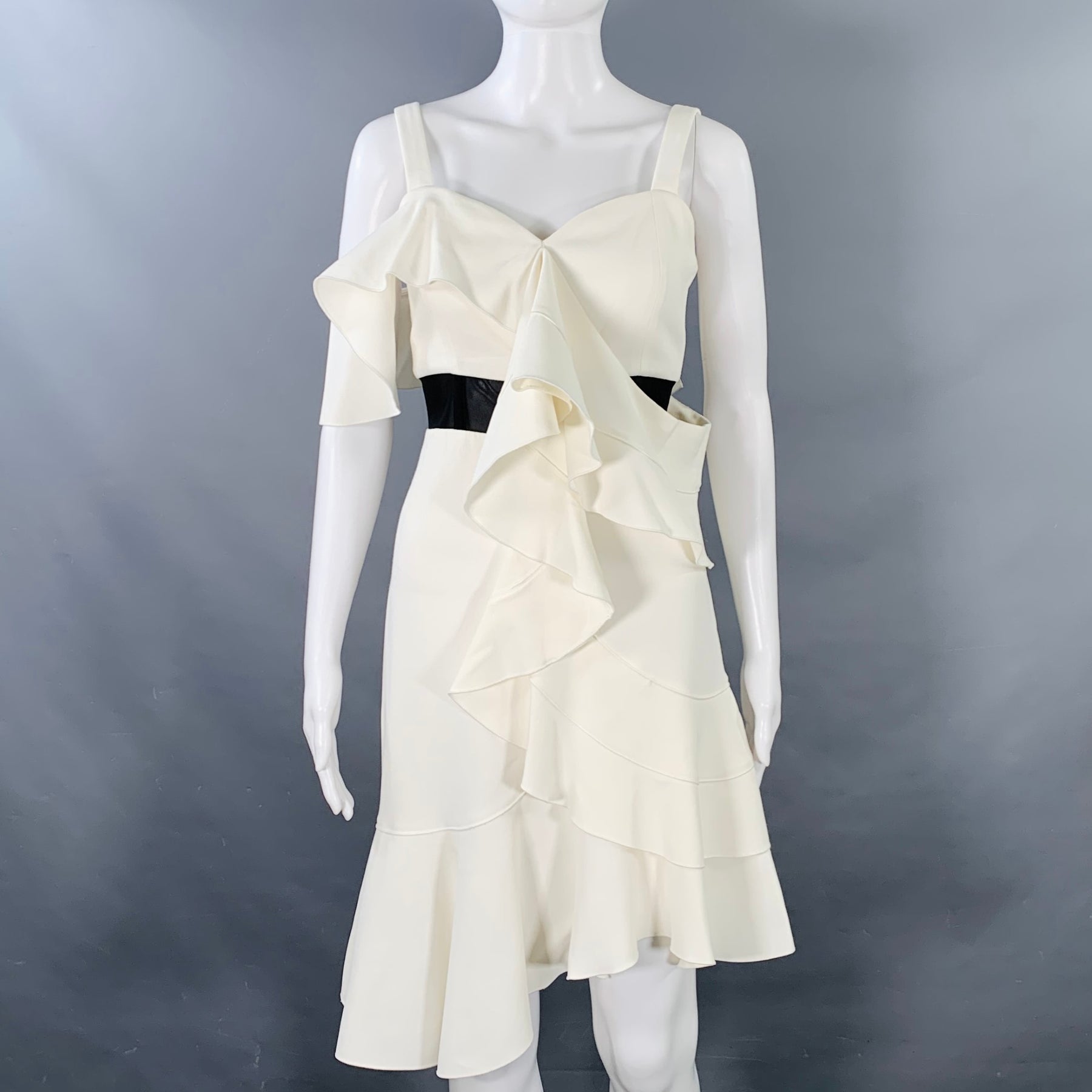 PROENZA SCHOULER cocktail dress in a cream viscose stretch blend featuring a ruffle skirt, black mesh "belt" detail, and invisible back zipper closure. Made in USA.