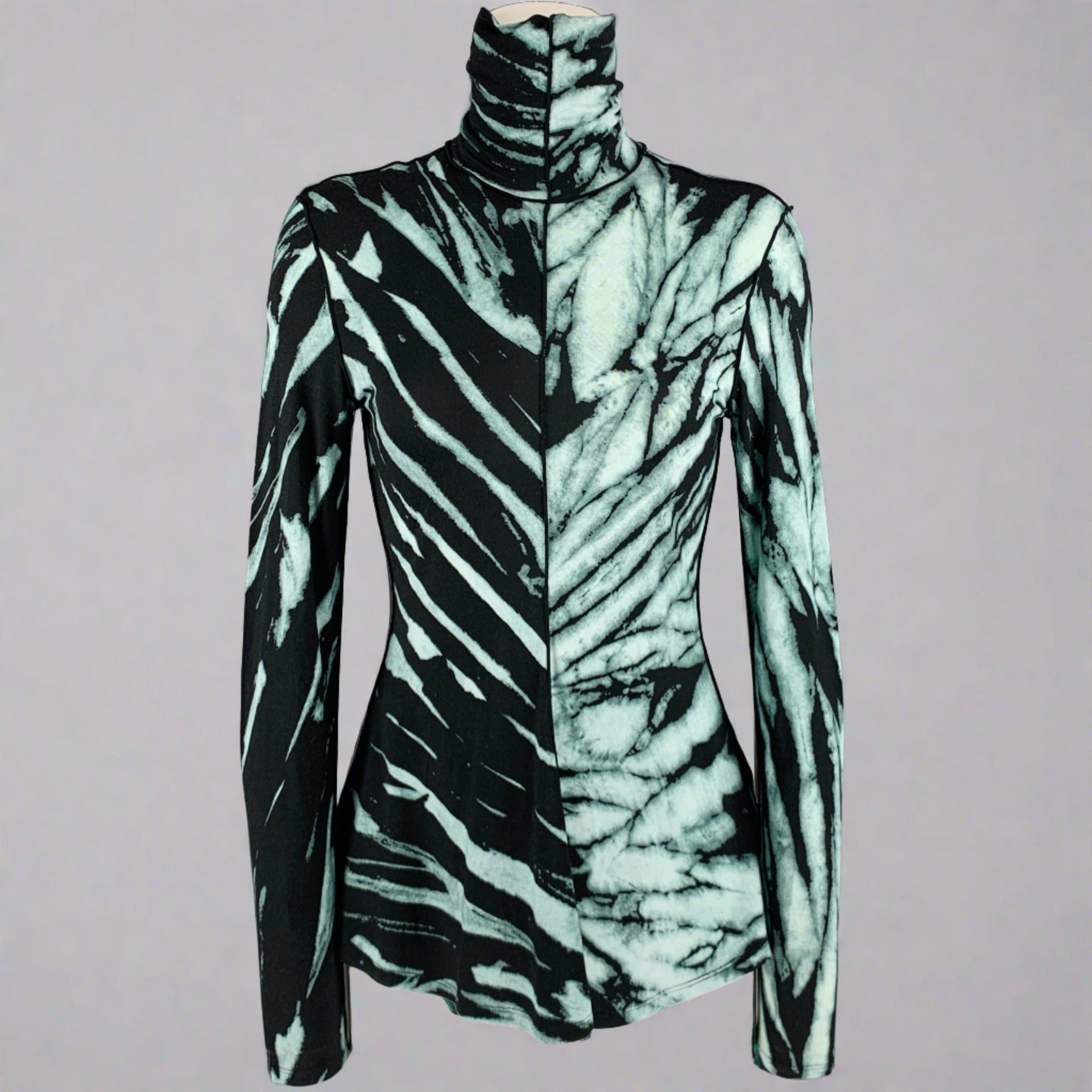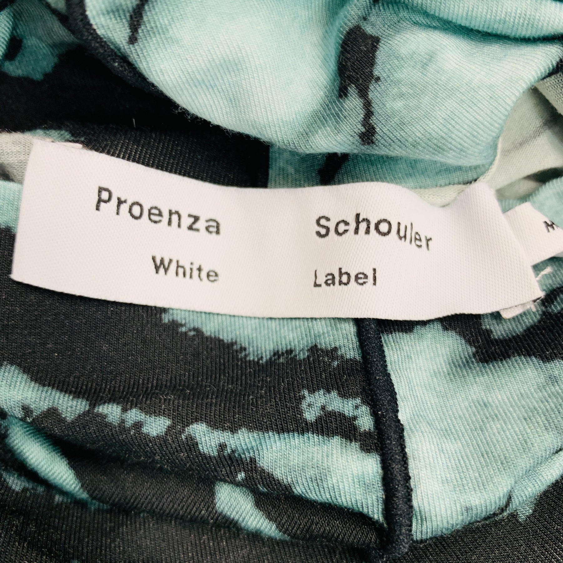 PROENZA SCHOULER casual top in a black and sage green rayon blend fabric featuring a marbled pattern with black trim, long sleeves, and turtleneck.