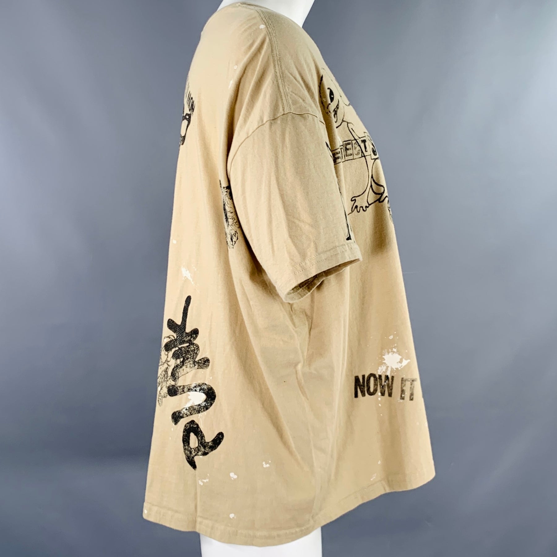 R13 "Stamp" t-shirt in a khaki cotton jersey featuring black stamped all over design, relaxed fit, and crew neck. Made from Japanese fabric.