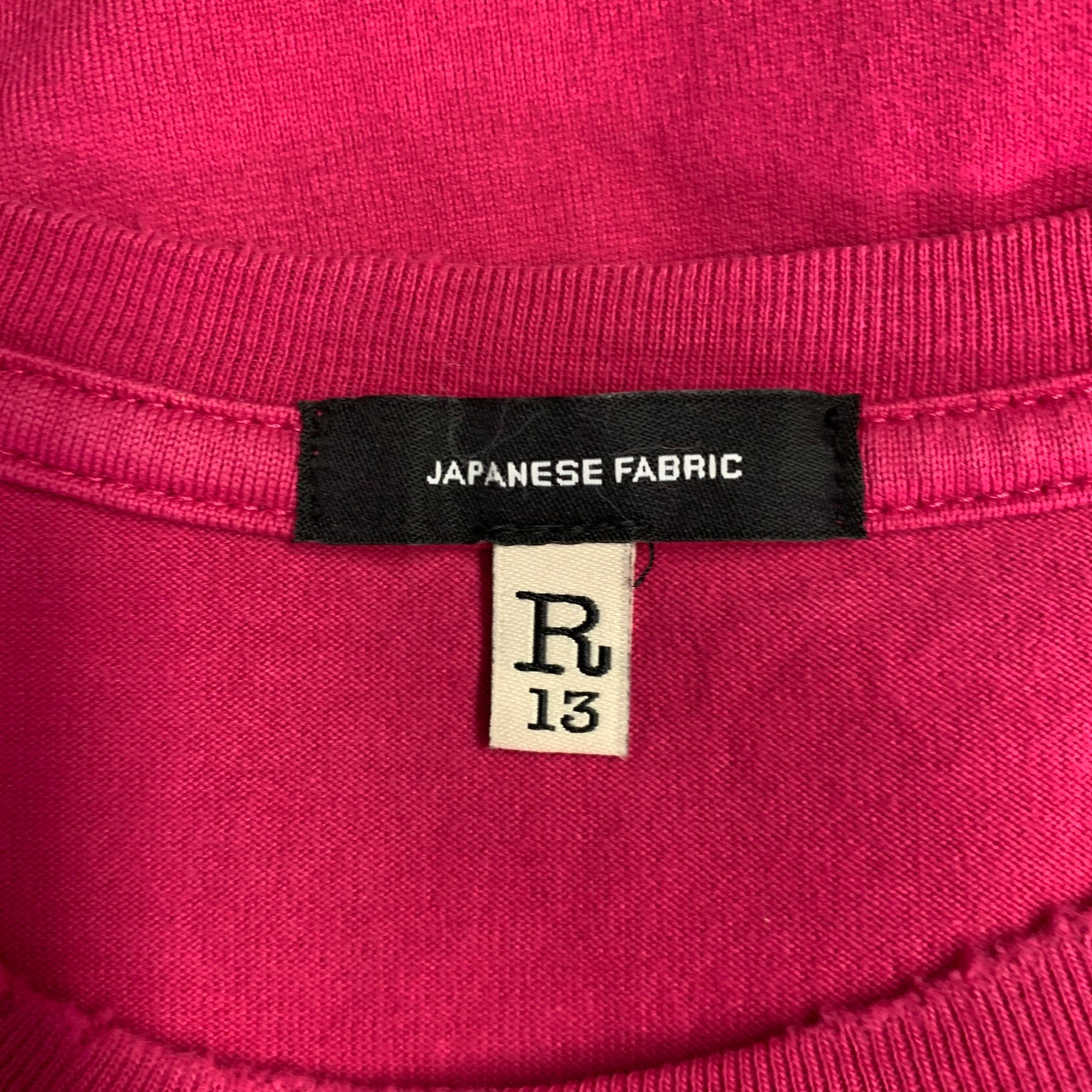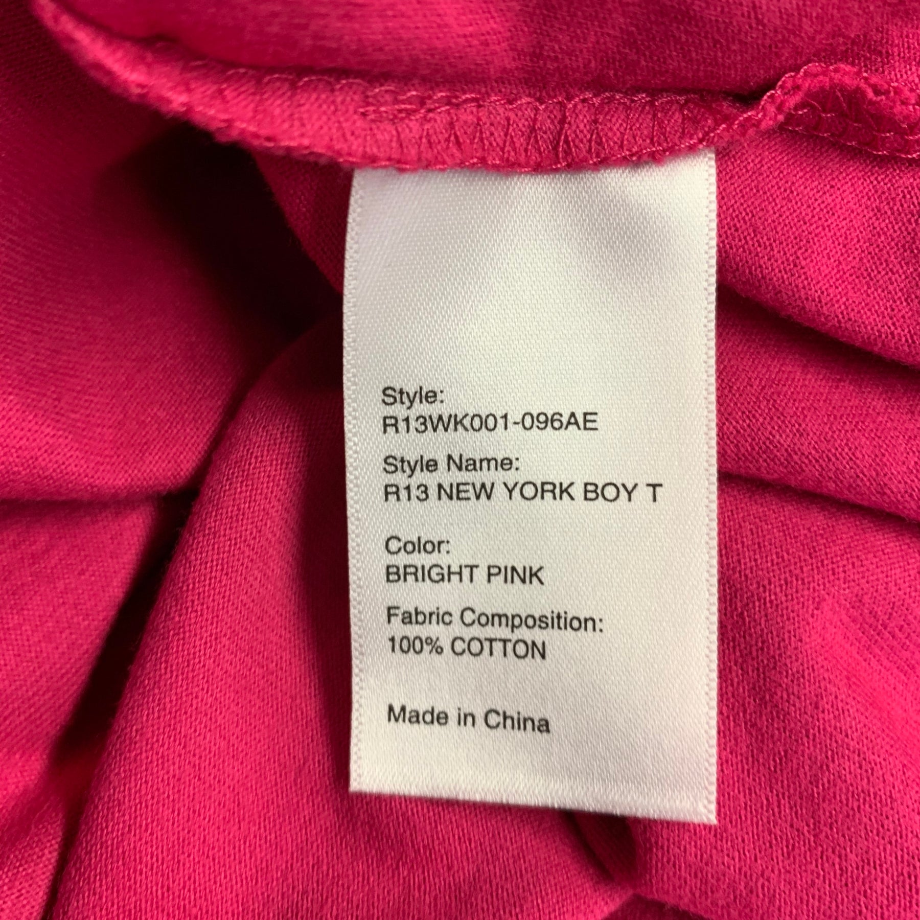 R13 "New York Boy" t-shirt in a fuchsia pink cotton jersey featuring a lightly distressed style, black "NEW YORK" print with R13 logo detail, and crew neck.
