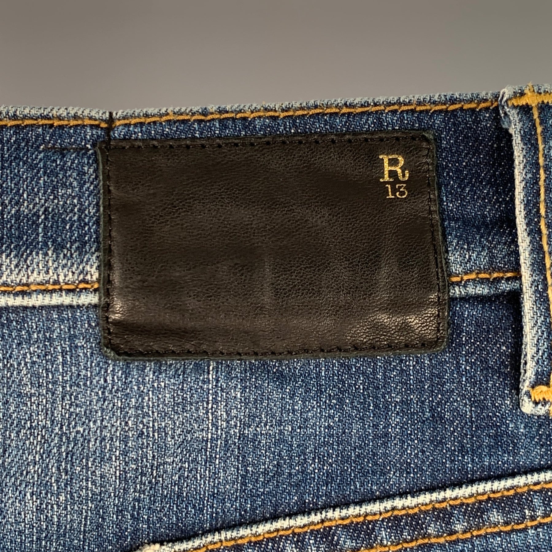 R13 SKATE SS15 jeans in a blue cotton stretch blend denim featuring a distressed style, slim tapered leg, and zip fly closure.