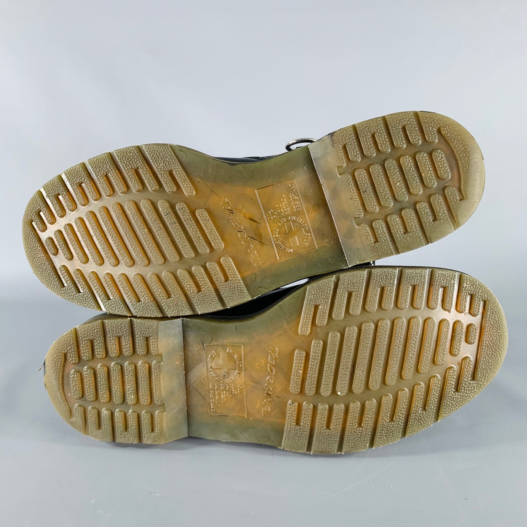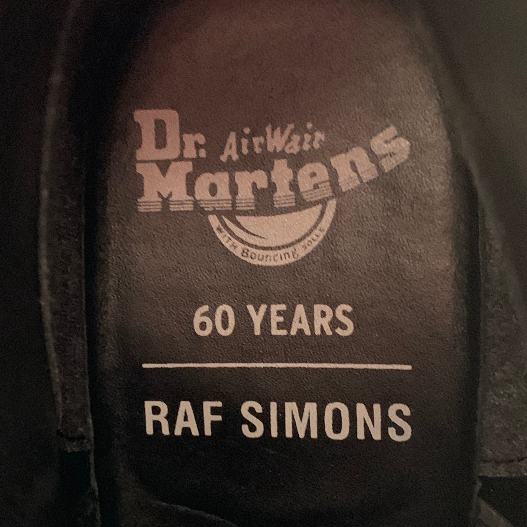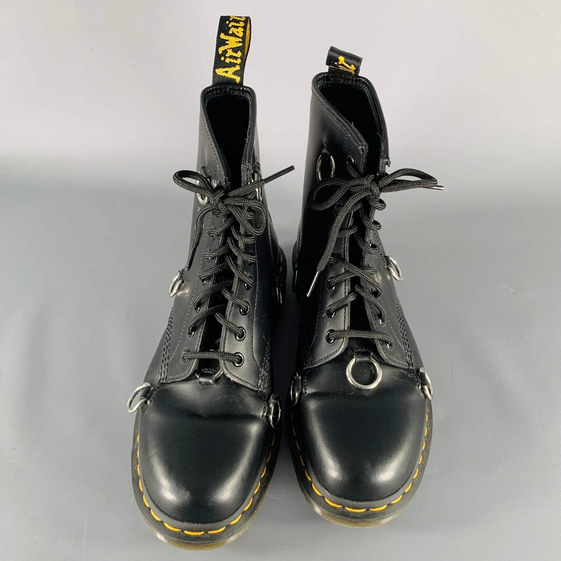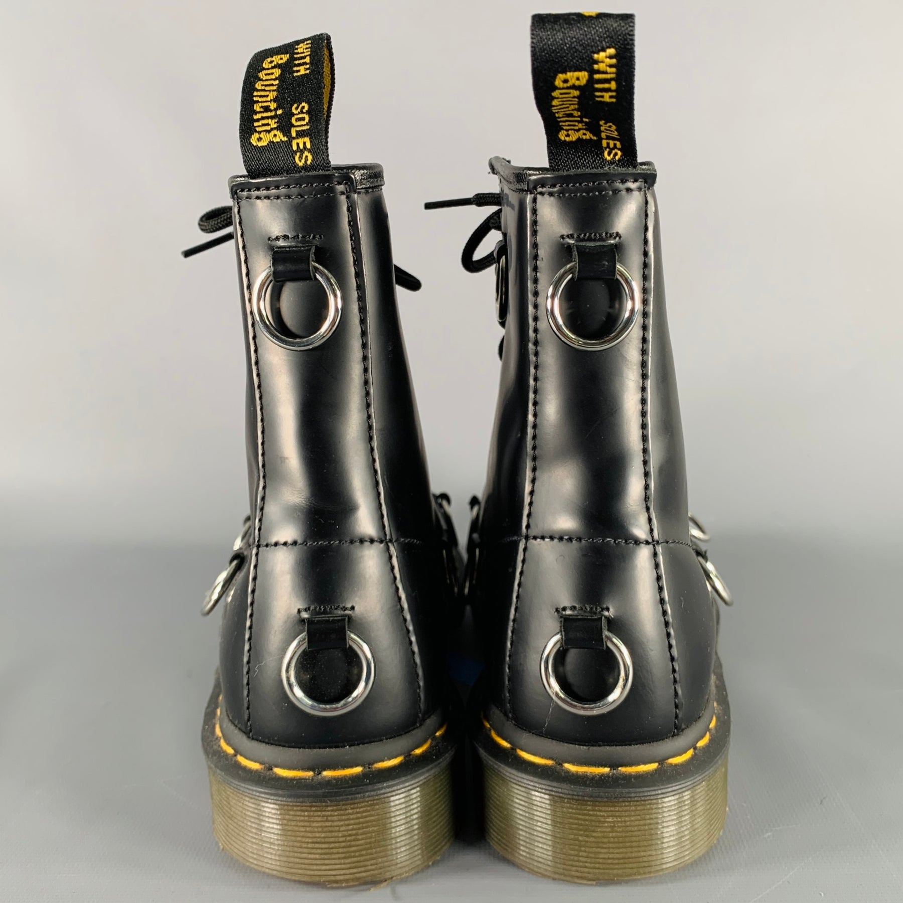 RAF SIMONS x DR. MARTENS boots in a black leather fabric featuring a silver tone O-ring design, ankle height, rubber sole, and lace-up closure.