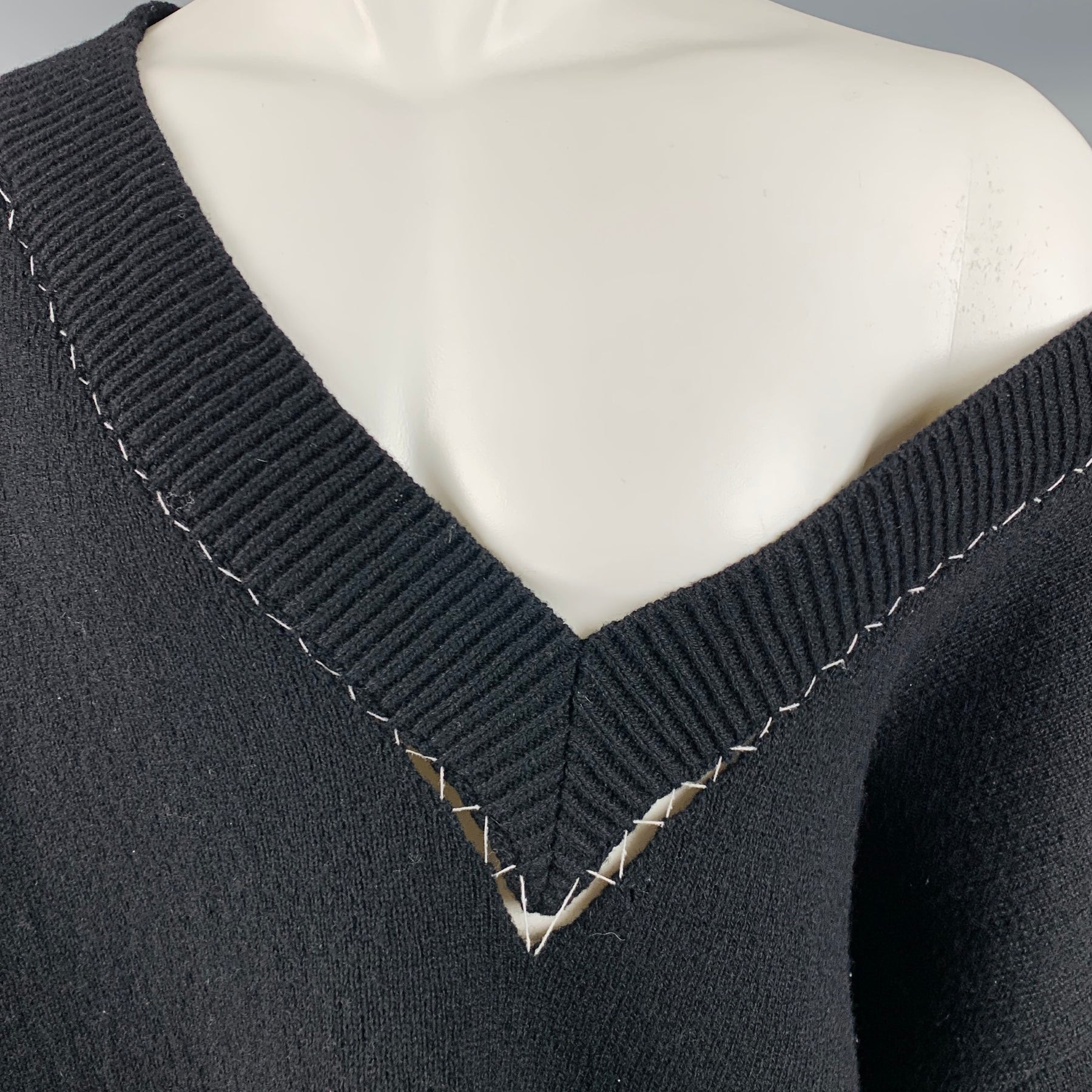 RAF SIMONS SS18 "Fireman Buckle" sweater in a black wool knit fabric featuring an oversized asymmetrical style, zig zag stitch V-neck detail, and fireman's buckle. Made in Italy.