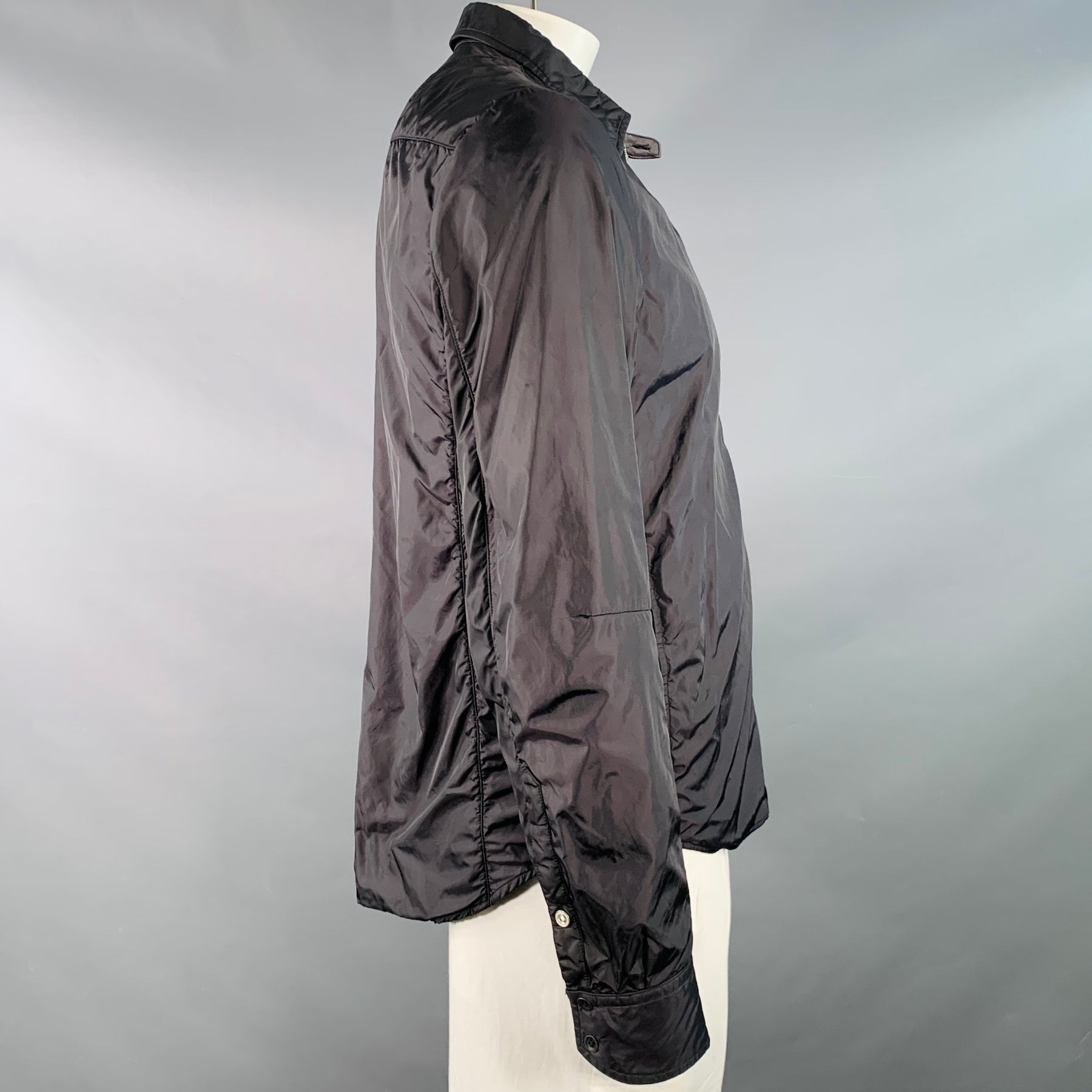 RAG & BONE shirt jacket in a black nylon fabric with grey cotton lining featuring a spread collar, one chest pocket, and zip up closure. Made in USA.