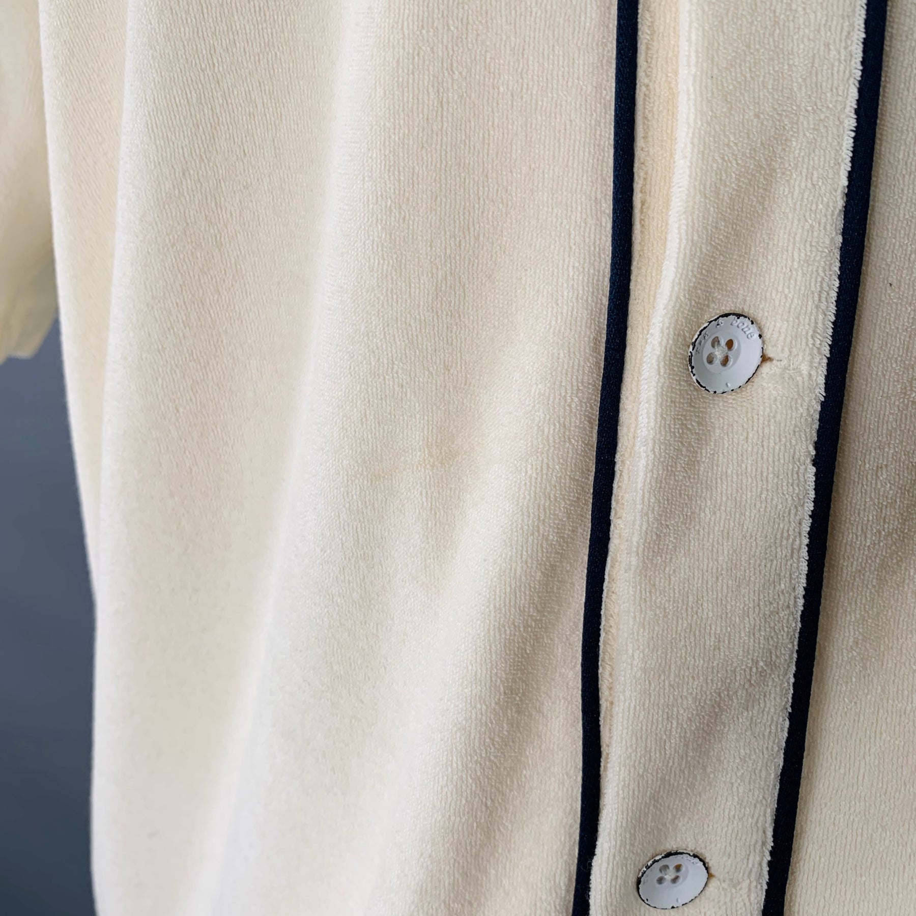 RAG & BONE short sleeve shirt in a beige cotton blend terry featuring a navy contrast trim, camp collar, and button closure.