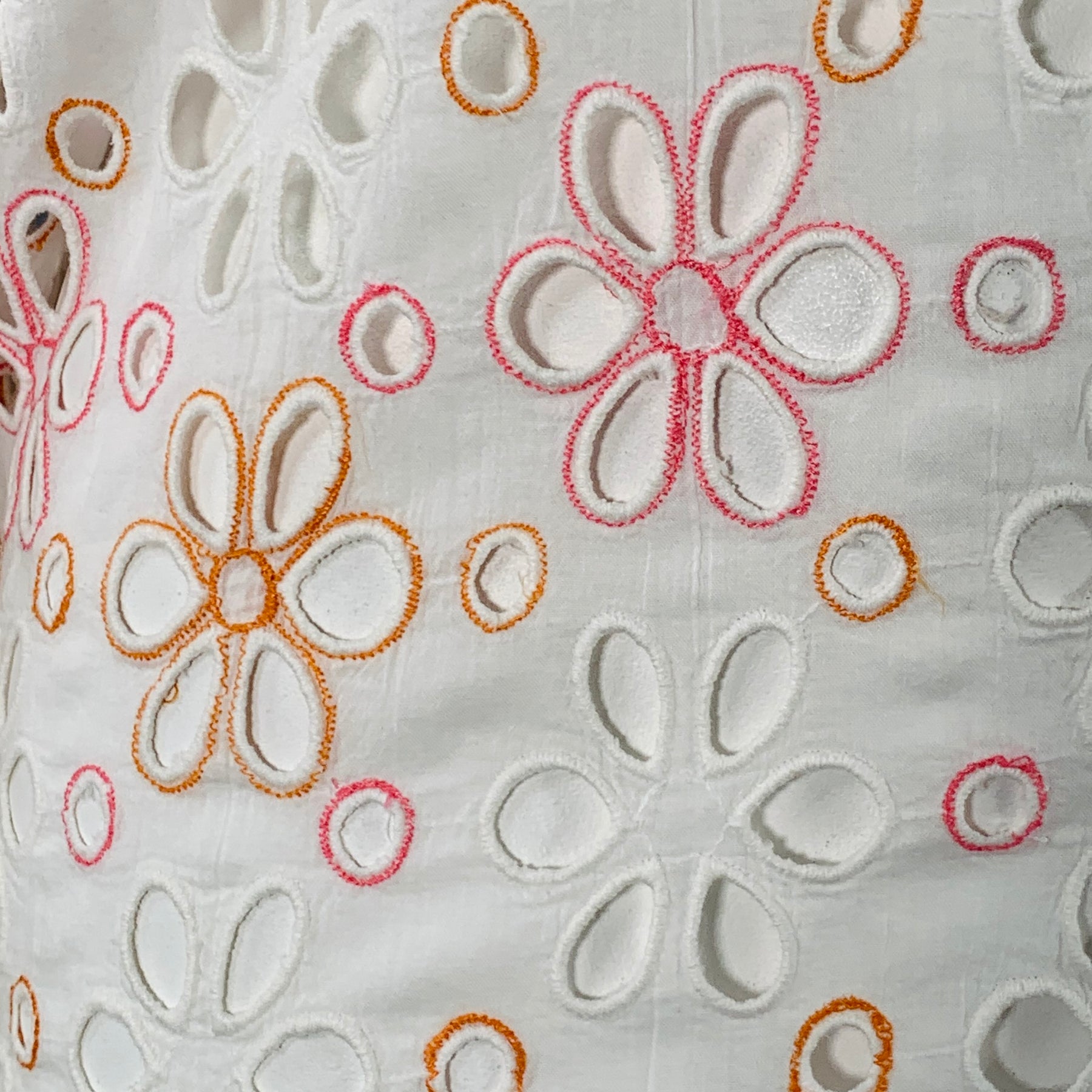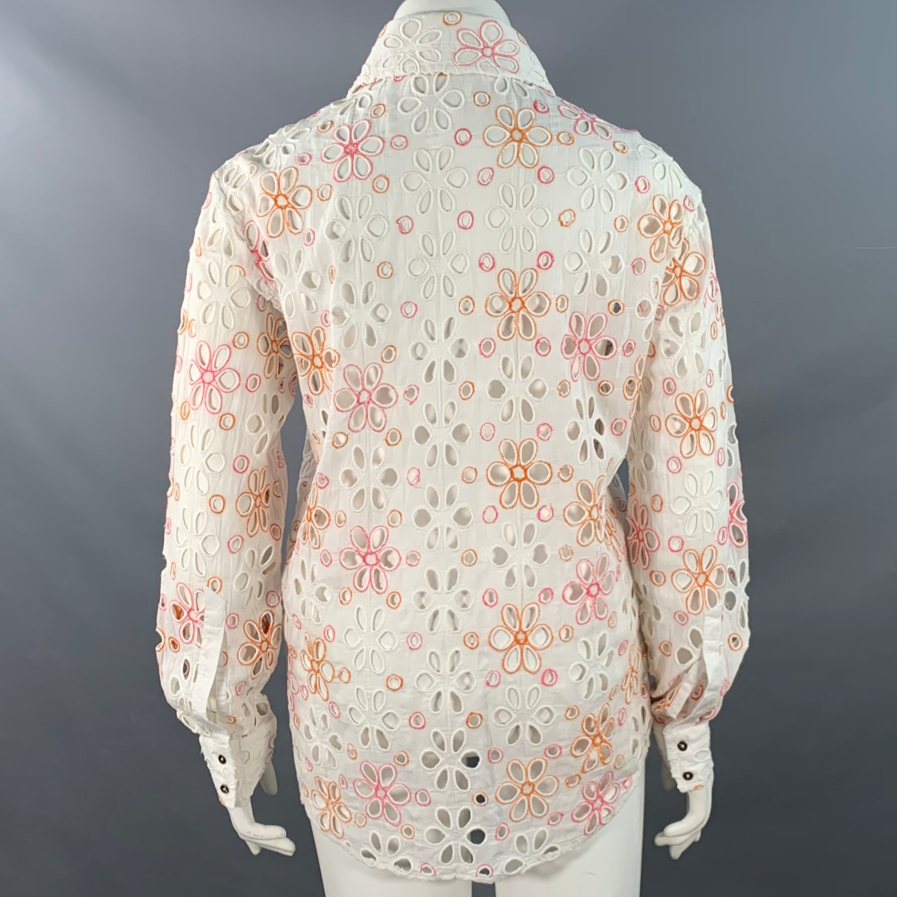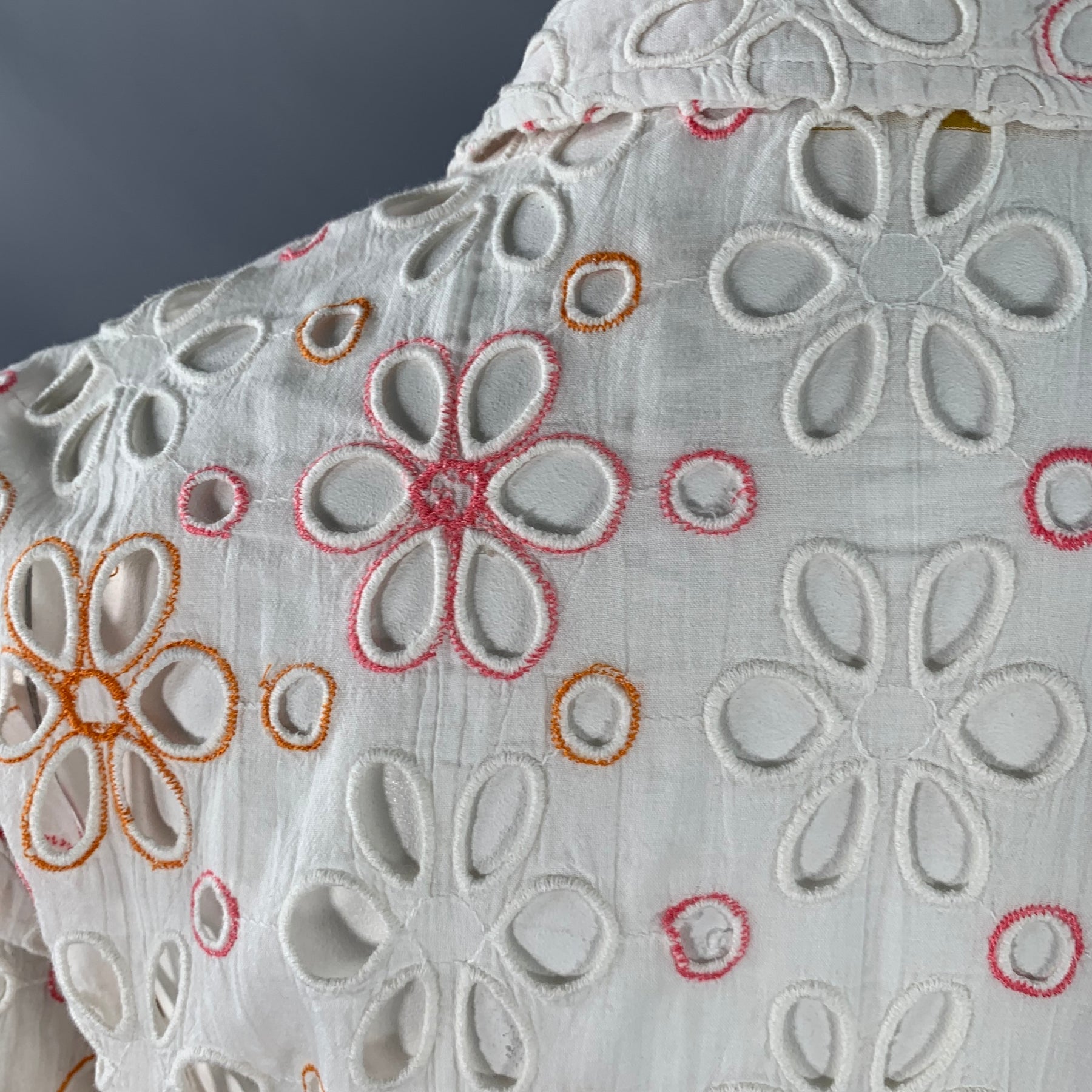 RAMY BROOK casual top in a white cotton woven fabric featuring an all over floral cutout design with pink and orange embroidered details, spread collar, and button closure.