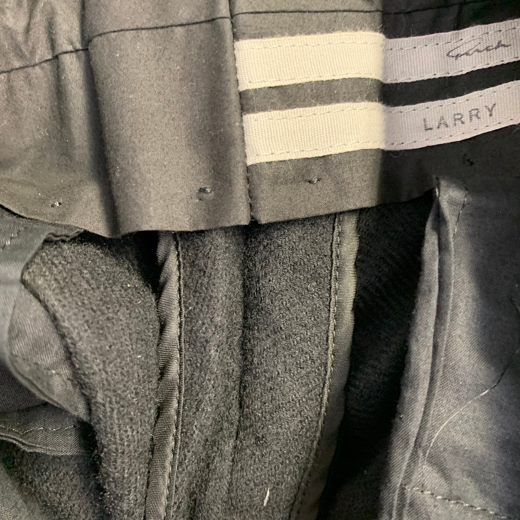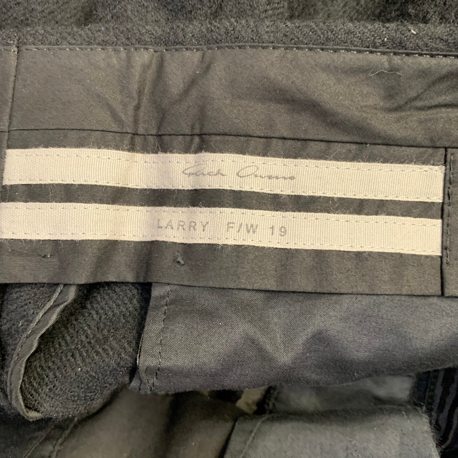 RICK OWENS FW19 "Larry" casual pants in a black wool twill featuring a drop crotch style, tapered leg, and button fly closure. Made in Italy.