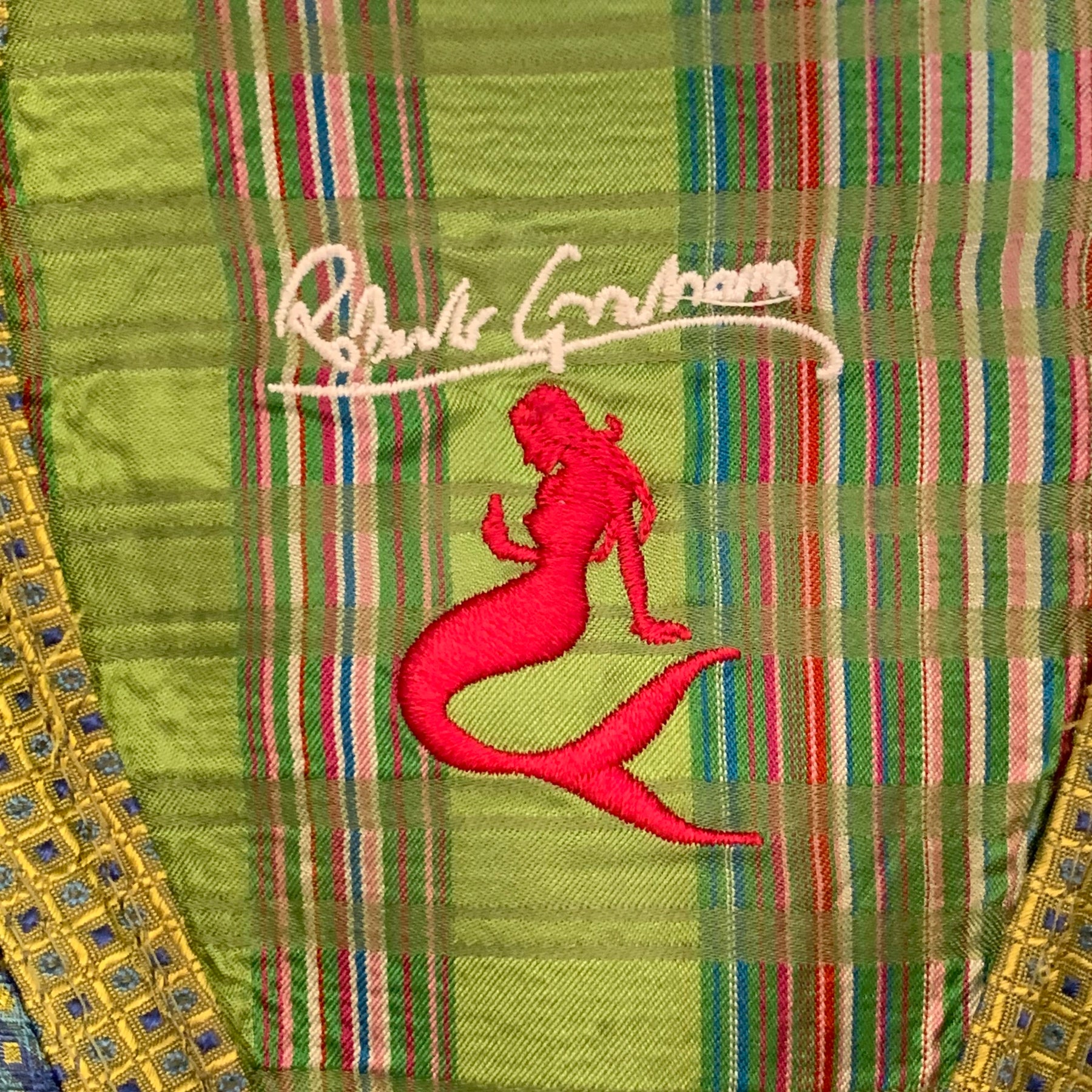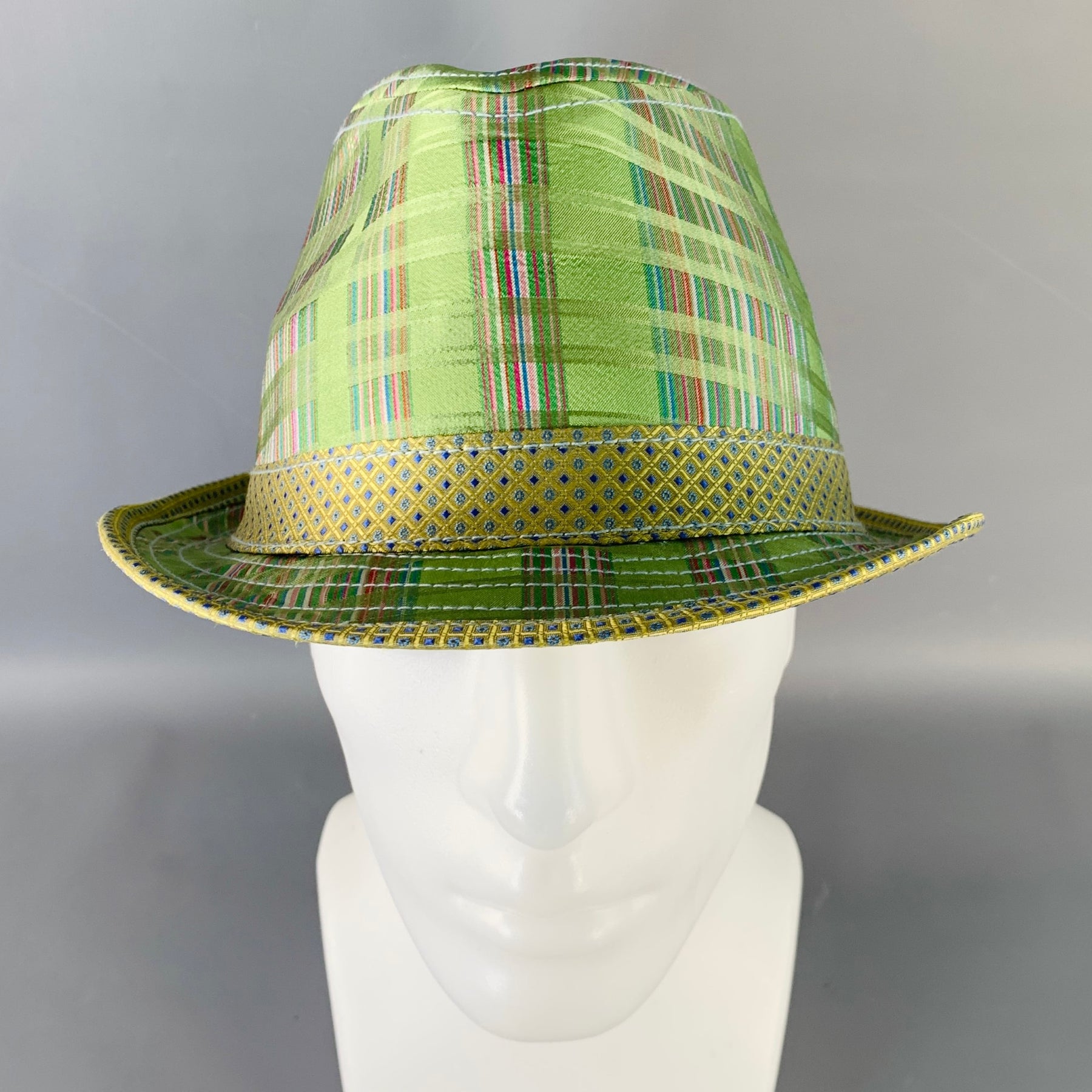 ROBERT GRAHAM trilby in a green silk featuring a plaid pattern with yellow and blue diamond patterned hatband and trim.