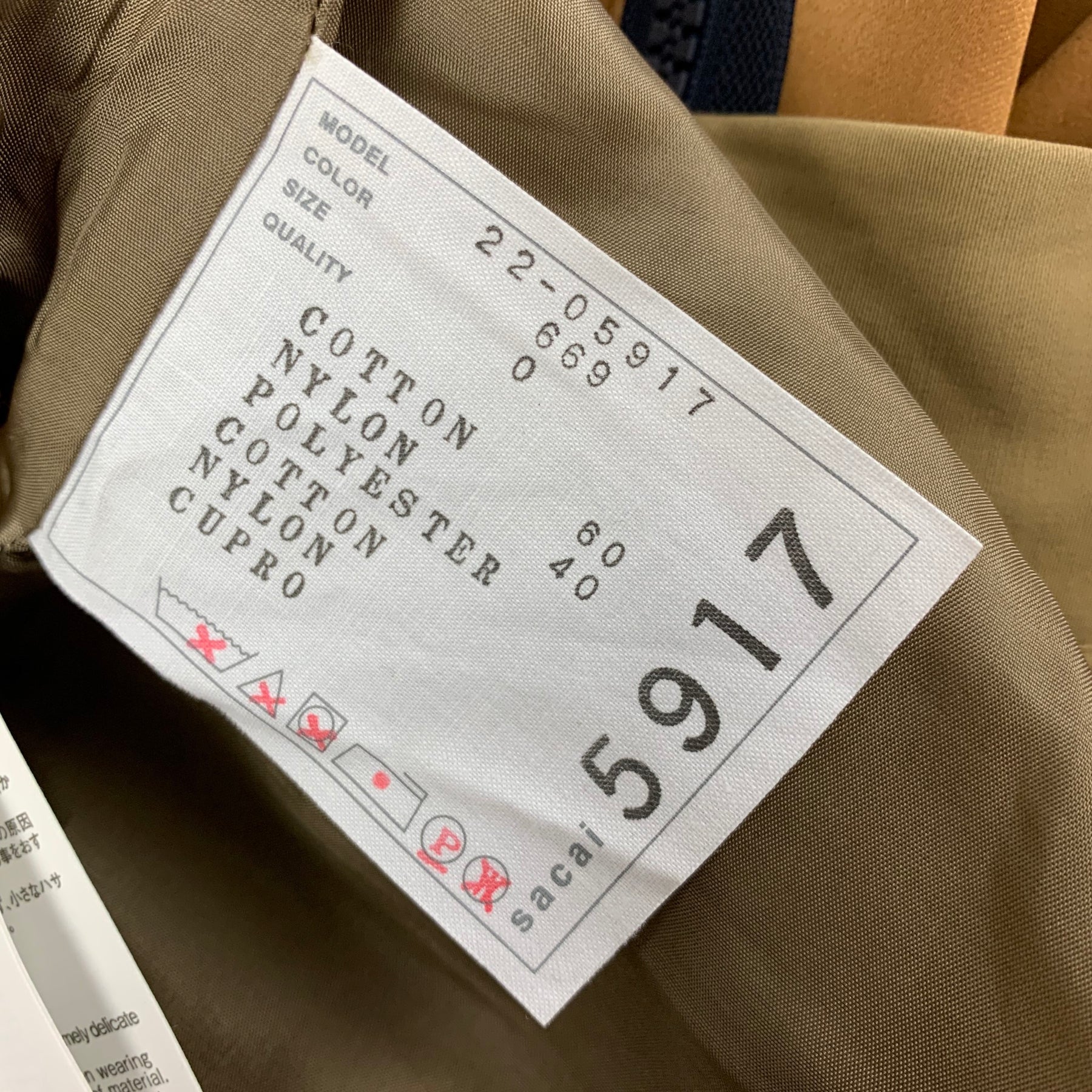 SACAI skirt comes in a khaki & gold color block cotton blend featuring a pencil style, patch pockets, exposed zipper details, adjustable side tabs, and a hidden zip & snap button closure. Made in Japan.