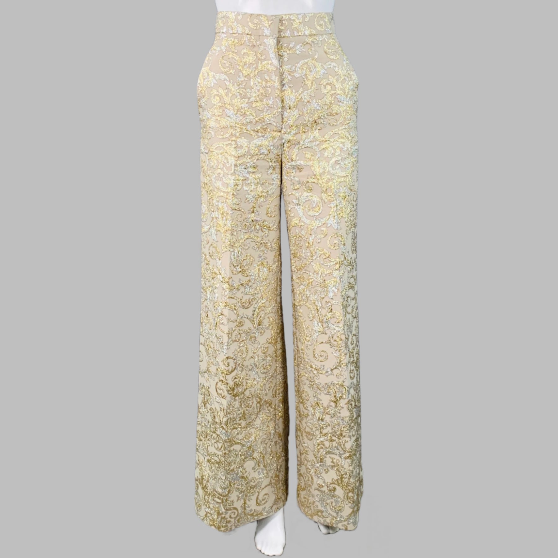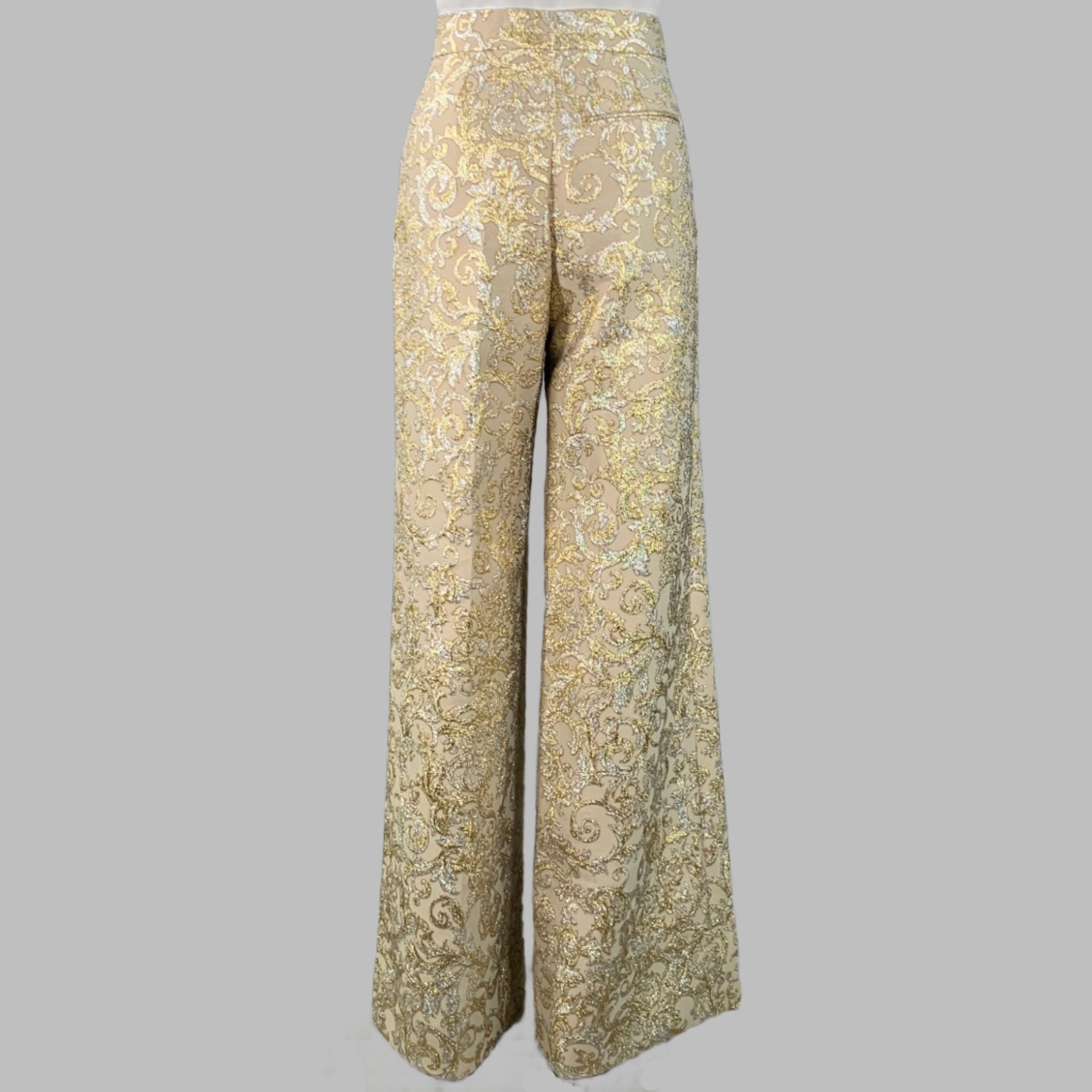 STELLA McCARTNEY pantsuit in a gold tone and silver tone jacquard polyamide blend fabric and includes a single breasted peak lapel, single button closure jacket and matching flat front wide leg pants. Made in Hungary.