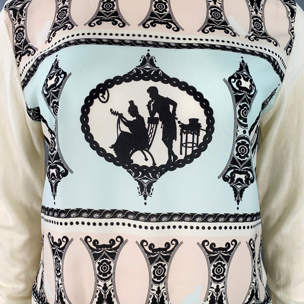 TED BAKER LONDON SEW IN LOVE pullover in a cream cotton knit featuring a pink and blue polyester satin front with Regency-themed silhouettes, long sleeves, and scoop neck.