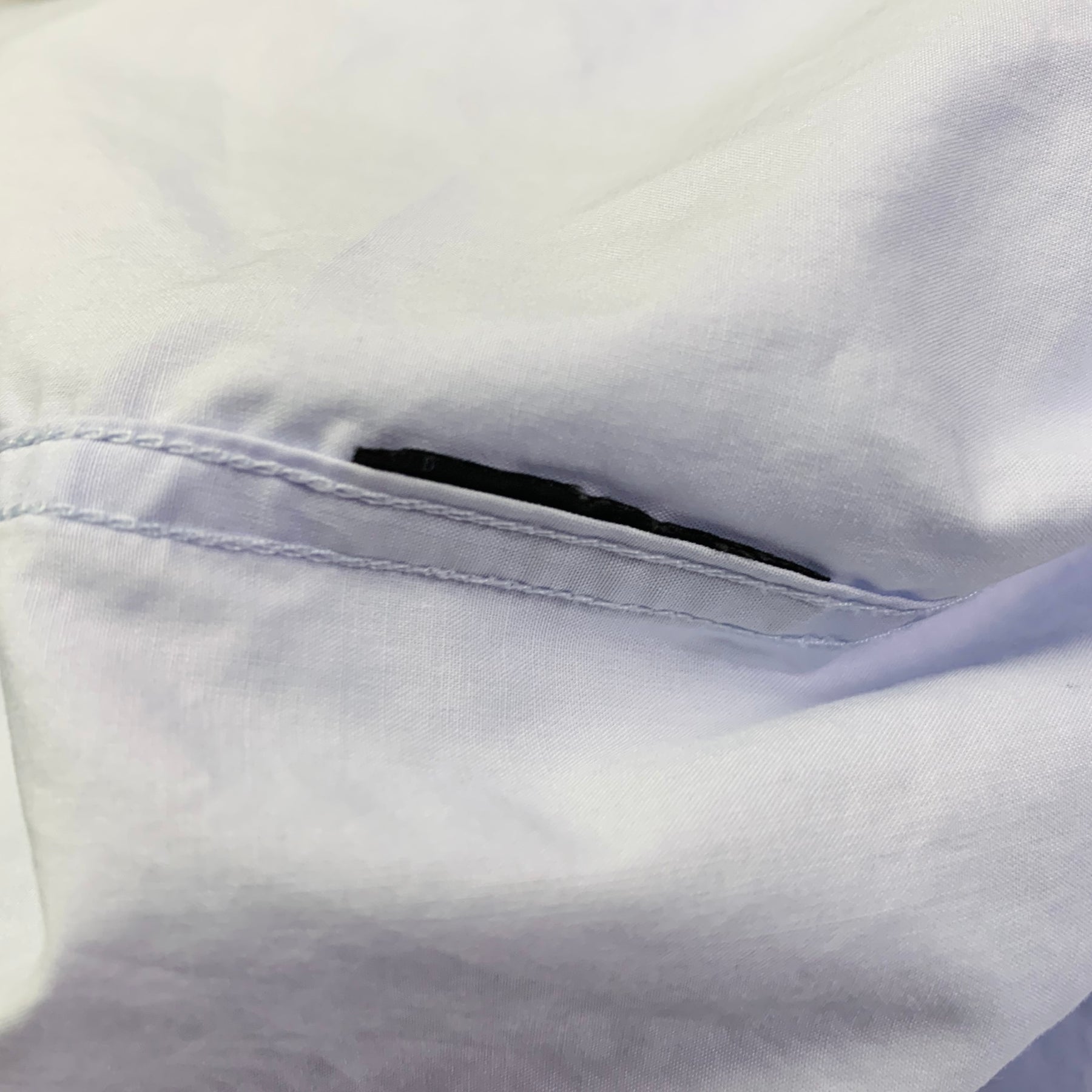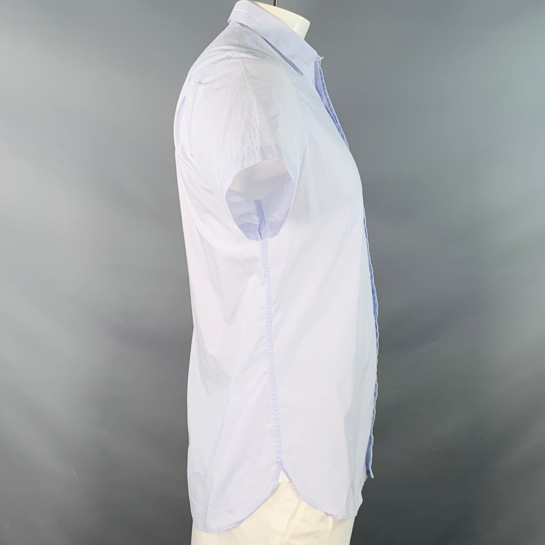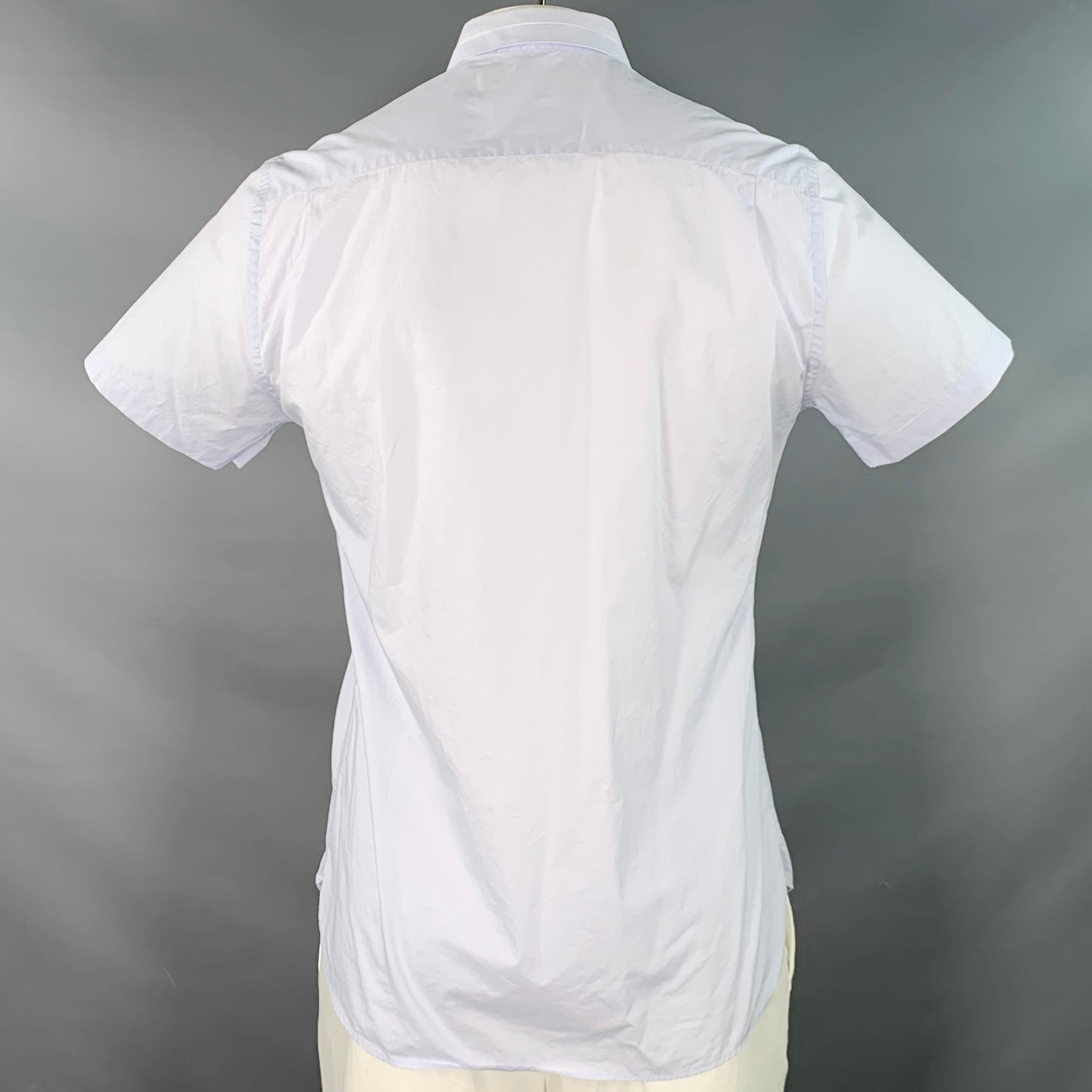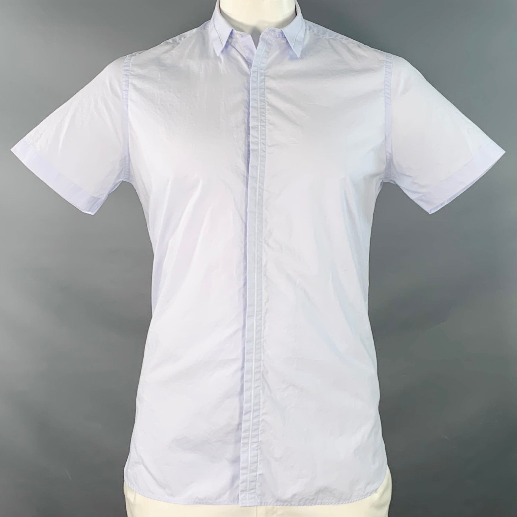 THE KOOPLES short sleeve shirt in a light blue woven fabric (feels like cotton) featuring white contrasting stripe trim on collar and placket, and hidden button closure. Made in Poland.