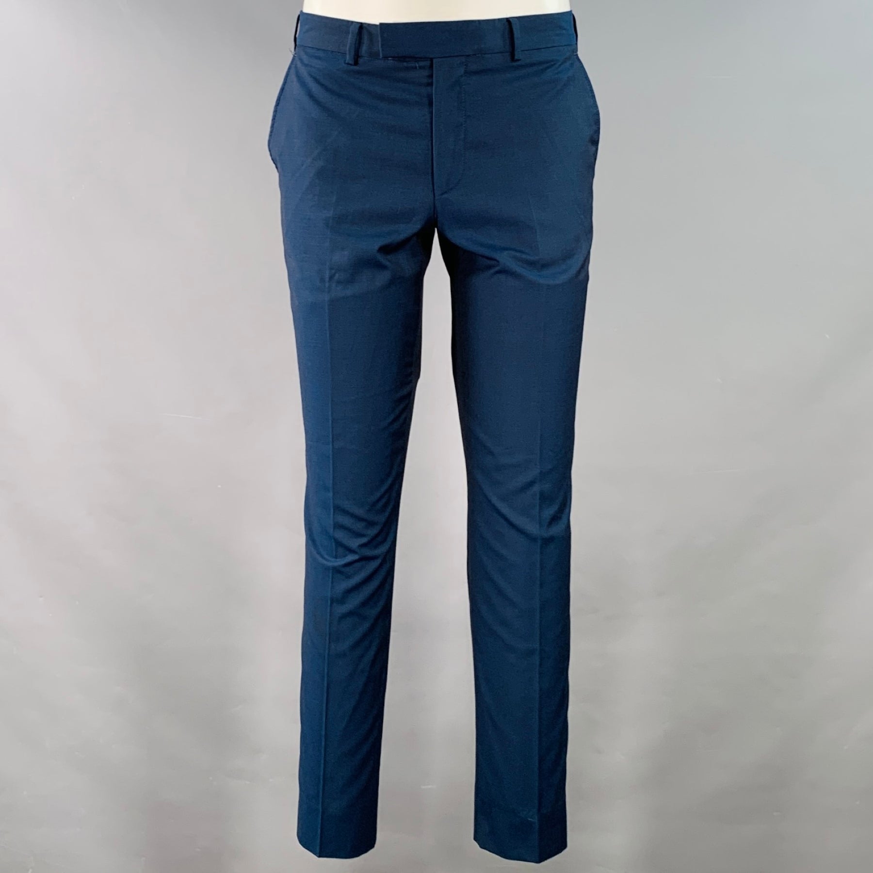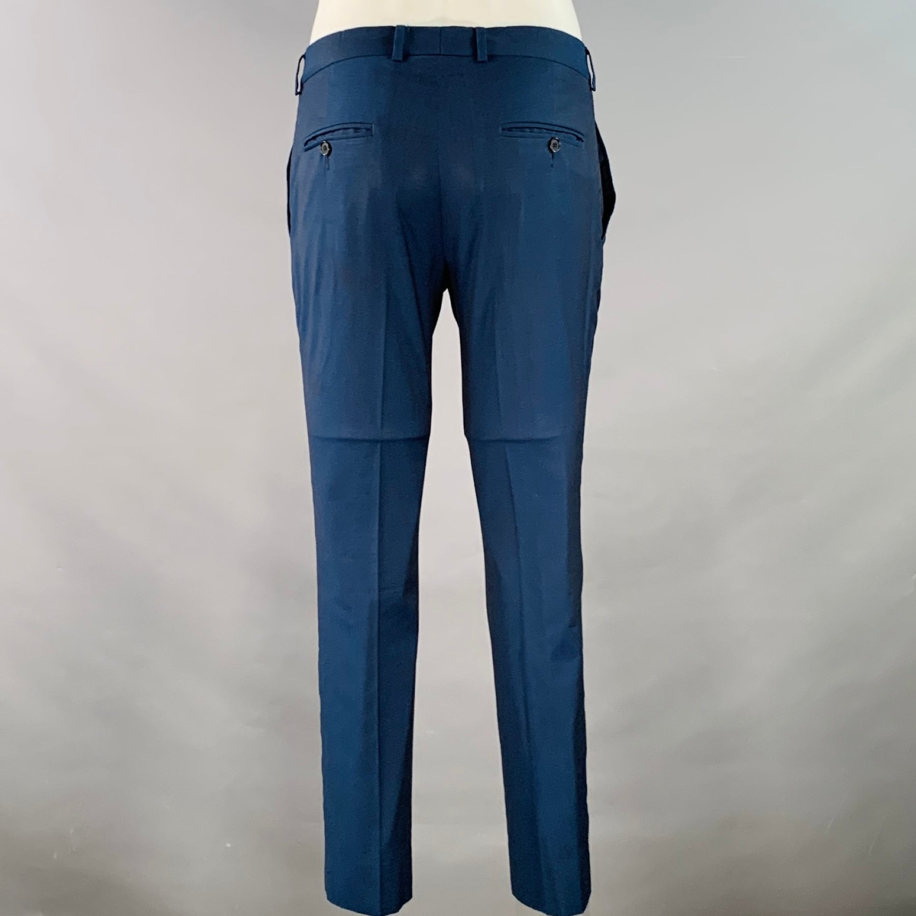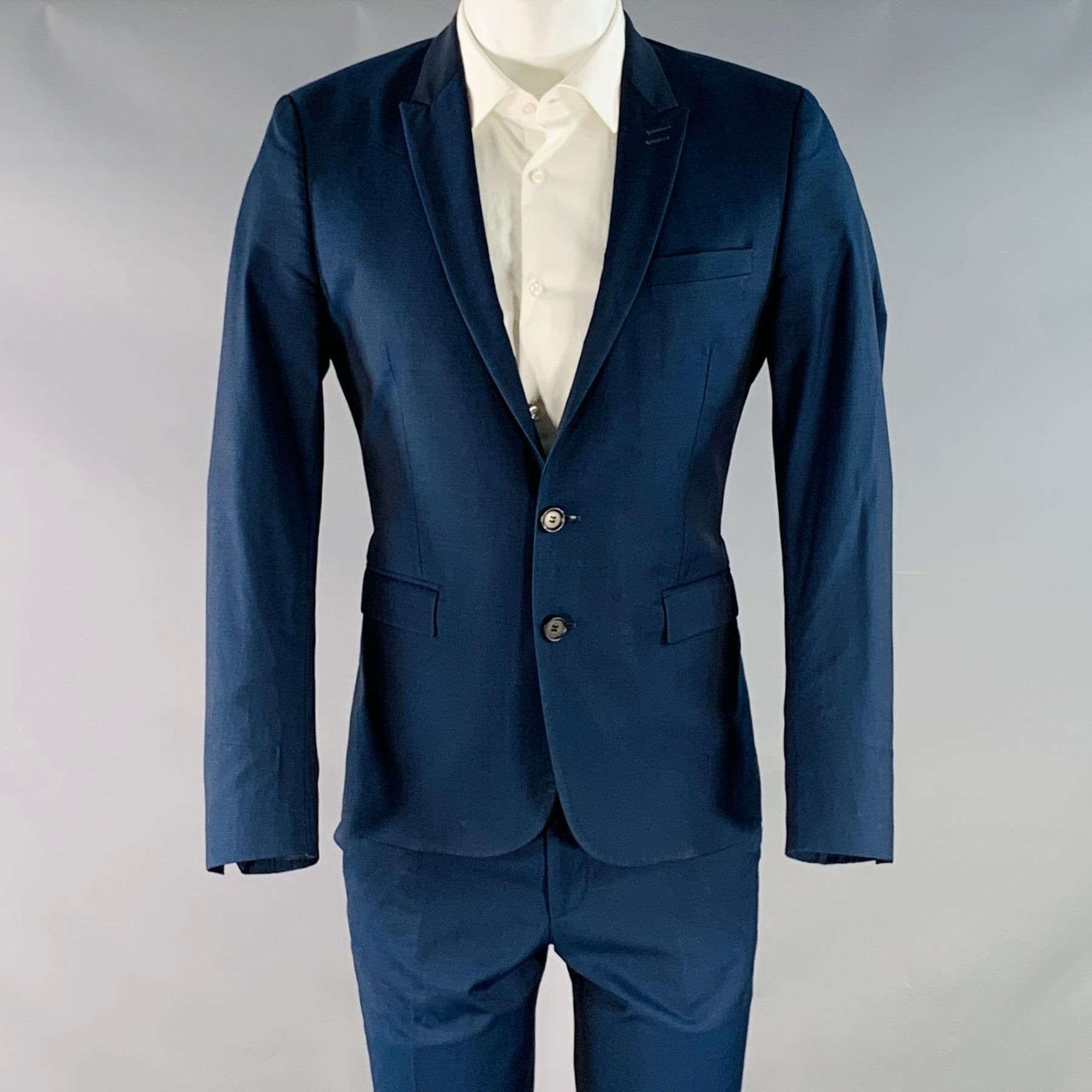 THE KOOPLES suit in a navy wool and includes a single breasted, double button sport coat with a peak lapel and matching flat front trousers.