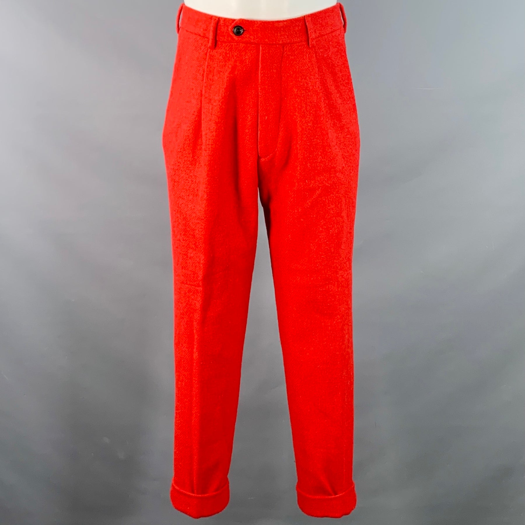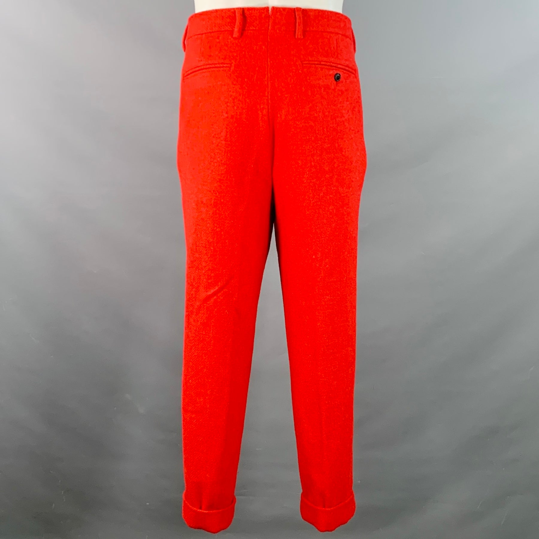 J.PRESS x TODD SNYDER suit in an orange wool with a half liner and includes a single breasted, three button sport coat with a notch lapel and matching pleated trousers. Made in Italy.