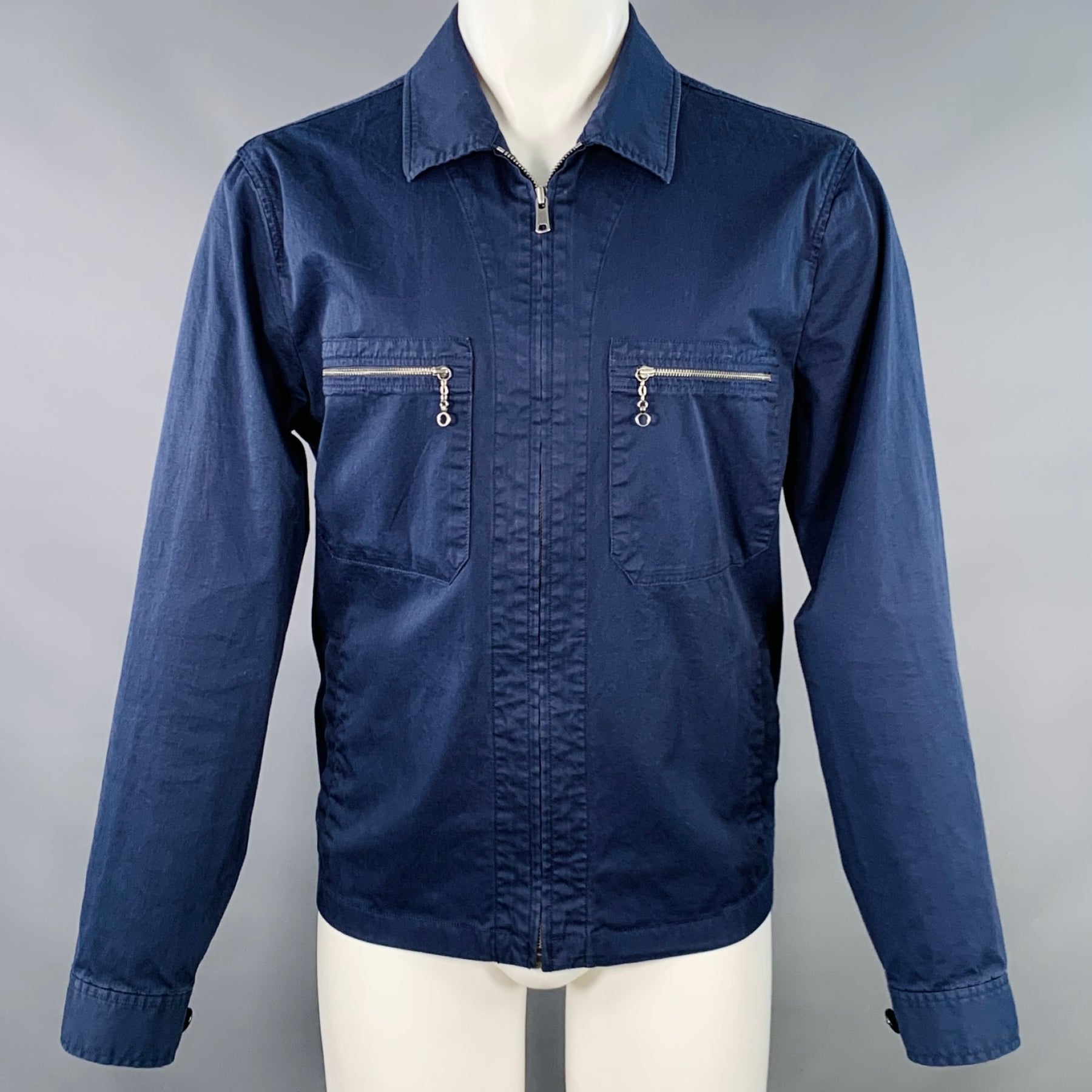 TODD SNYDER jacket in a navy cotton stretch blend fabric featuring two zip pockets with silver tone metal zipper pulls, and zip up closure.