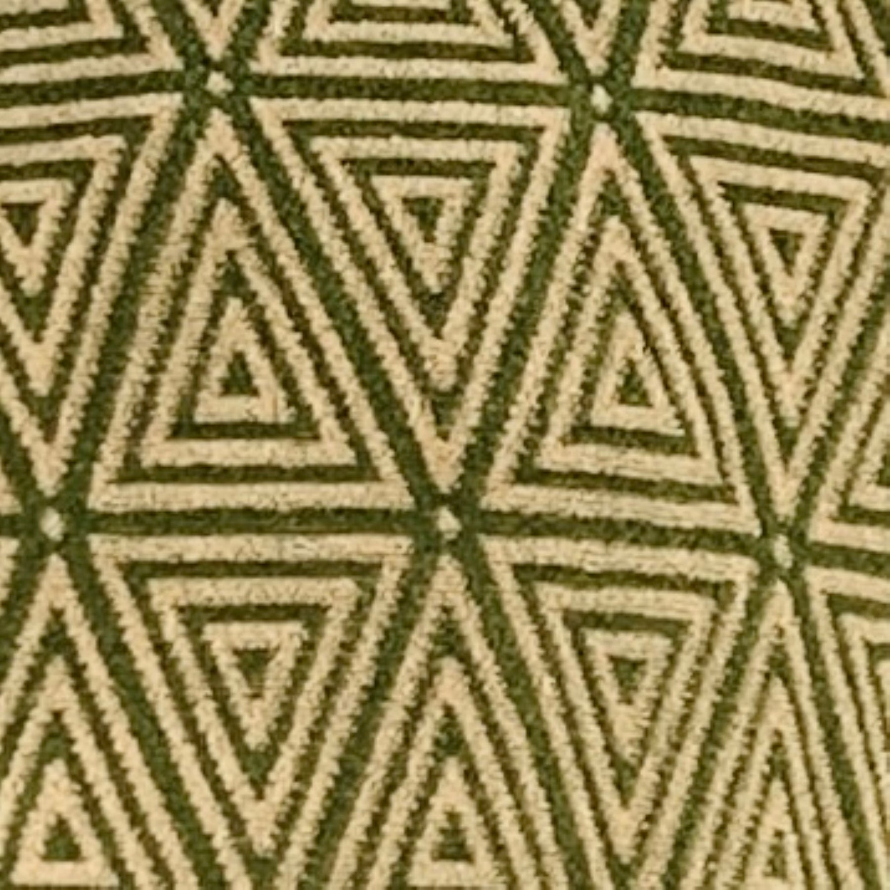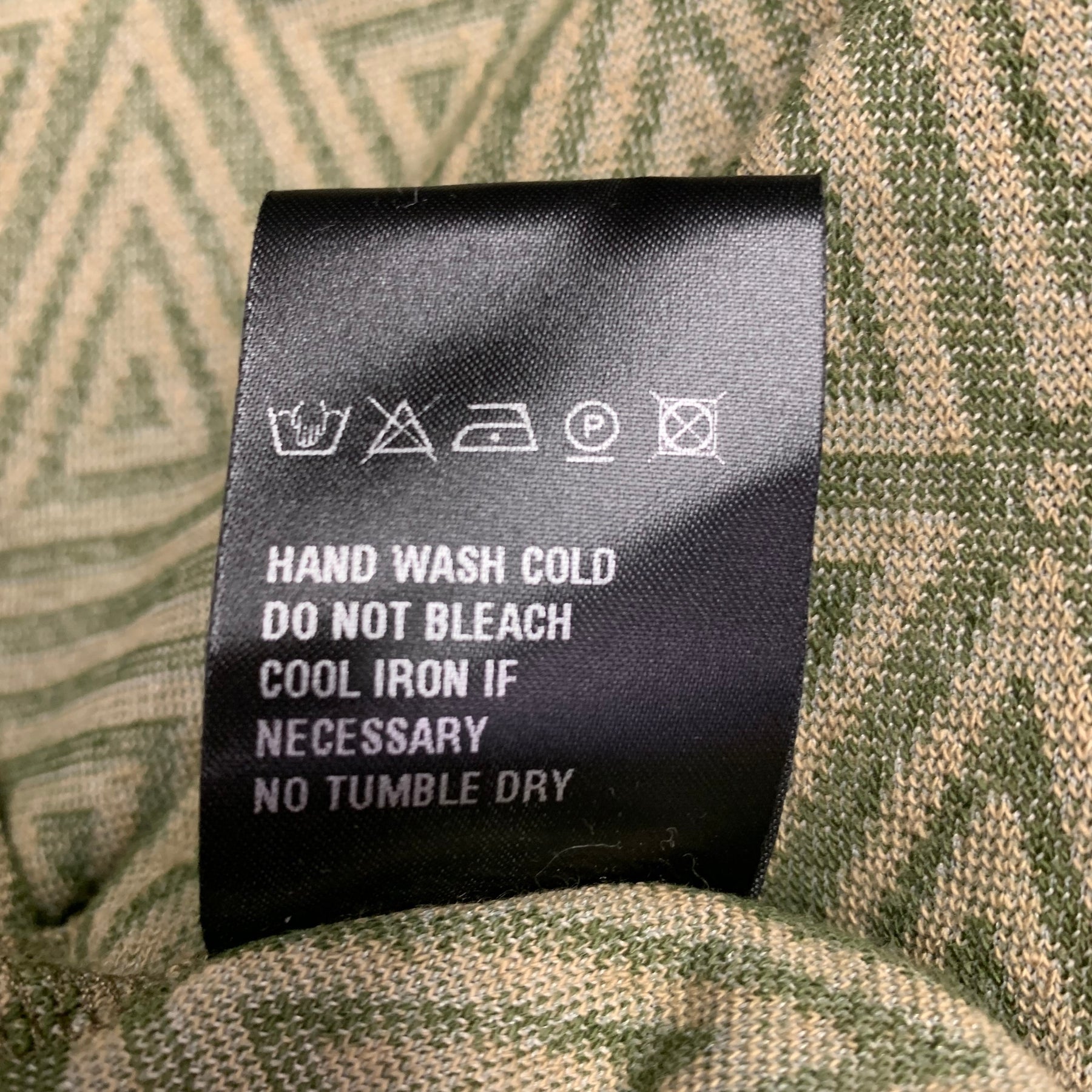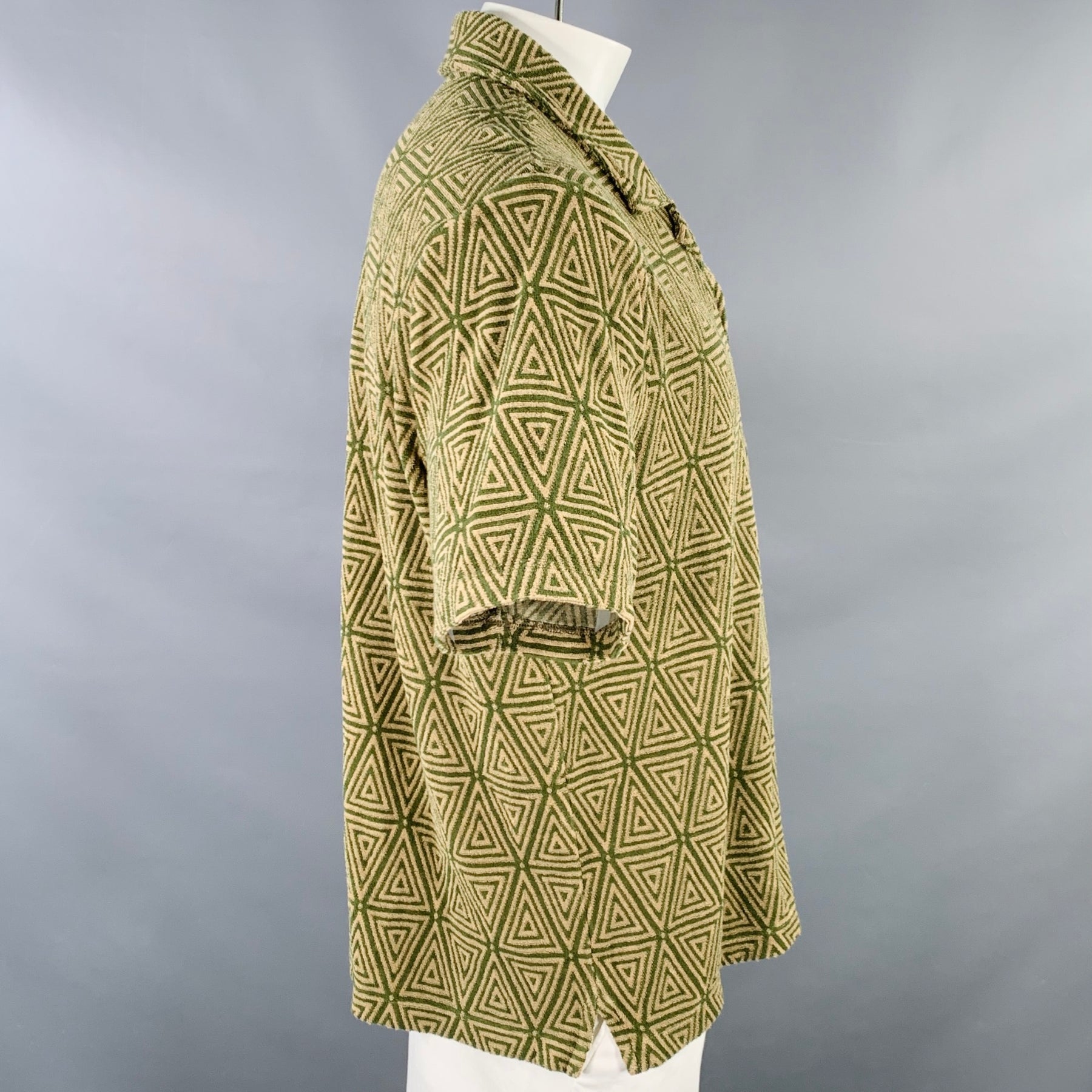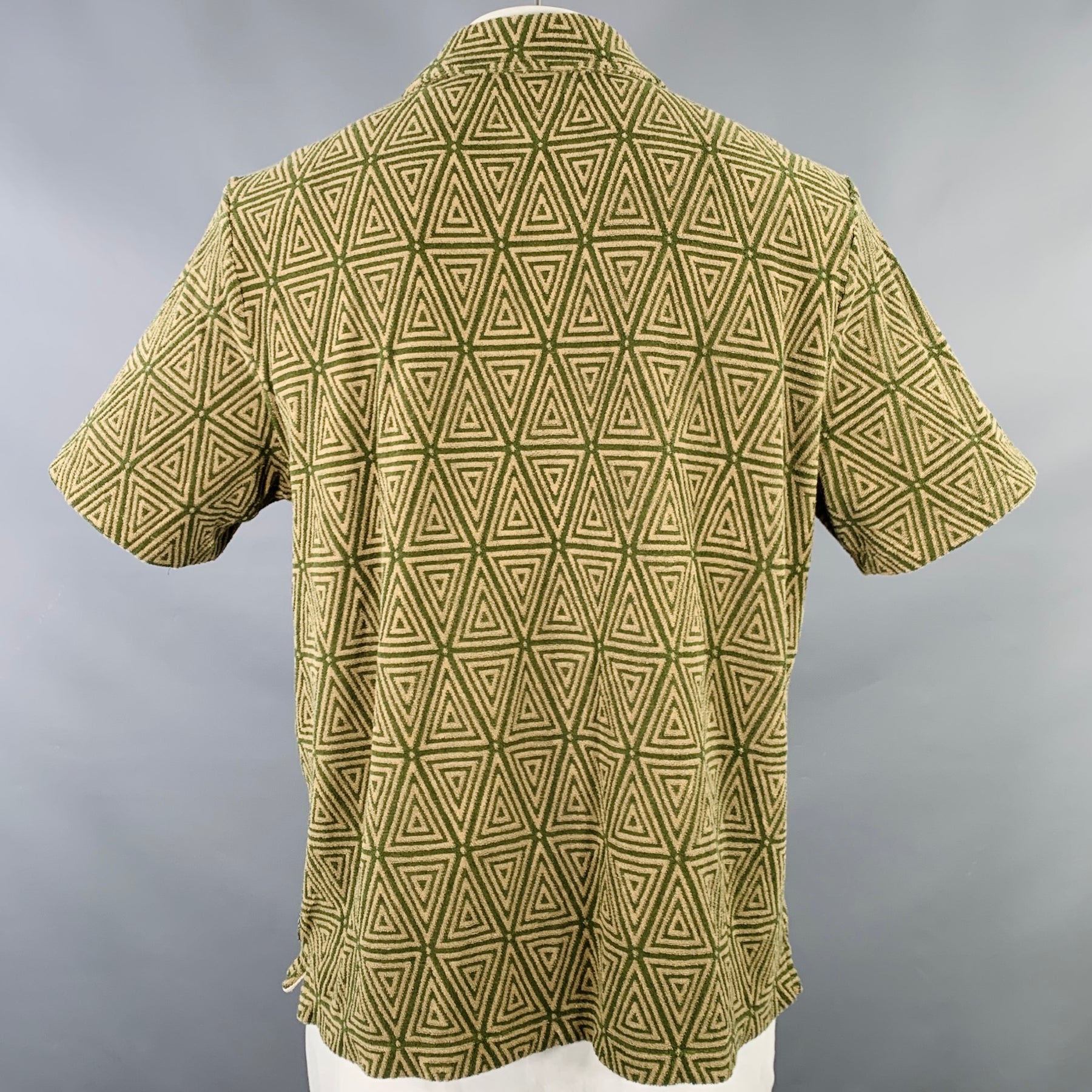 TODD SNYDER short sleeve shirt in a green and taupe cotton blend terry featuring a triangle pattern, spread collar, and button closure. Made in Italy.