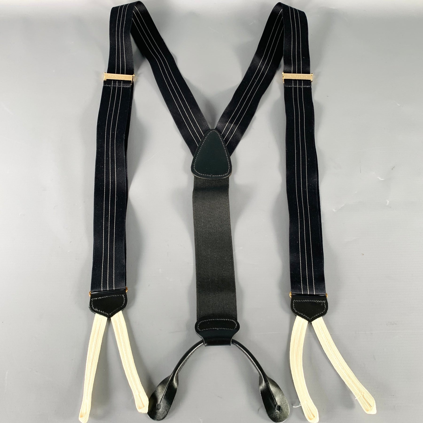 TRAFALGAR suspenders in a black elastic material featuring an adjustable fit, stripe design, and black leather trim.
