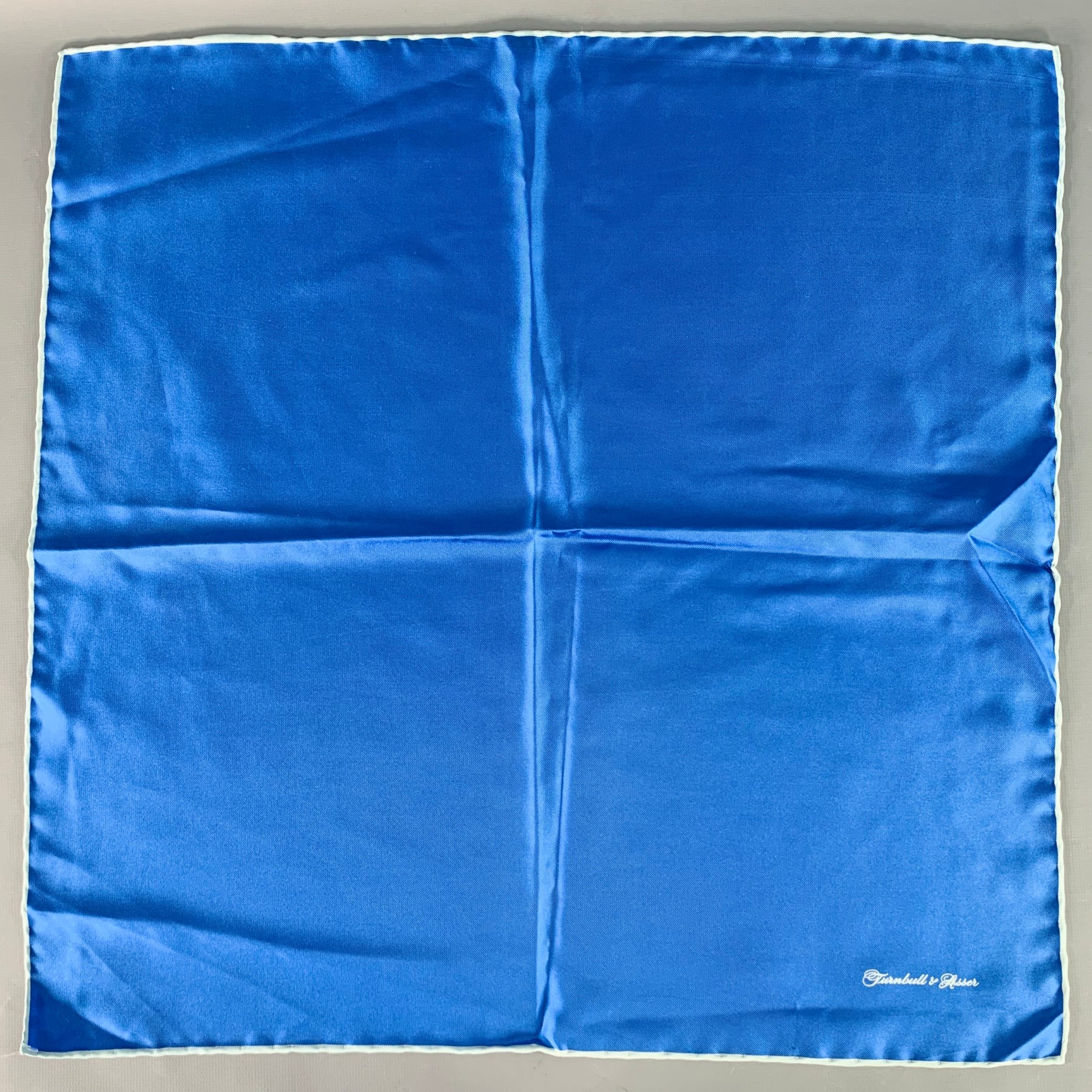 TURNBULL & ASSER pocket square in a blue silk featuring contrasting light blue silk edges, which are hand rolled.