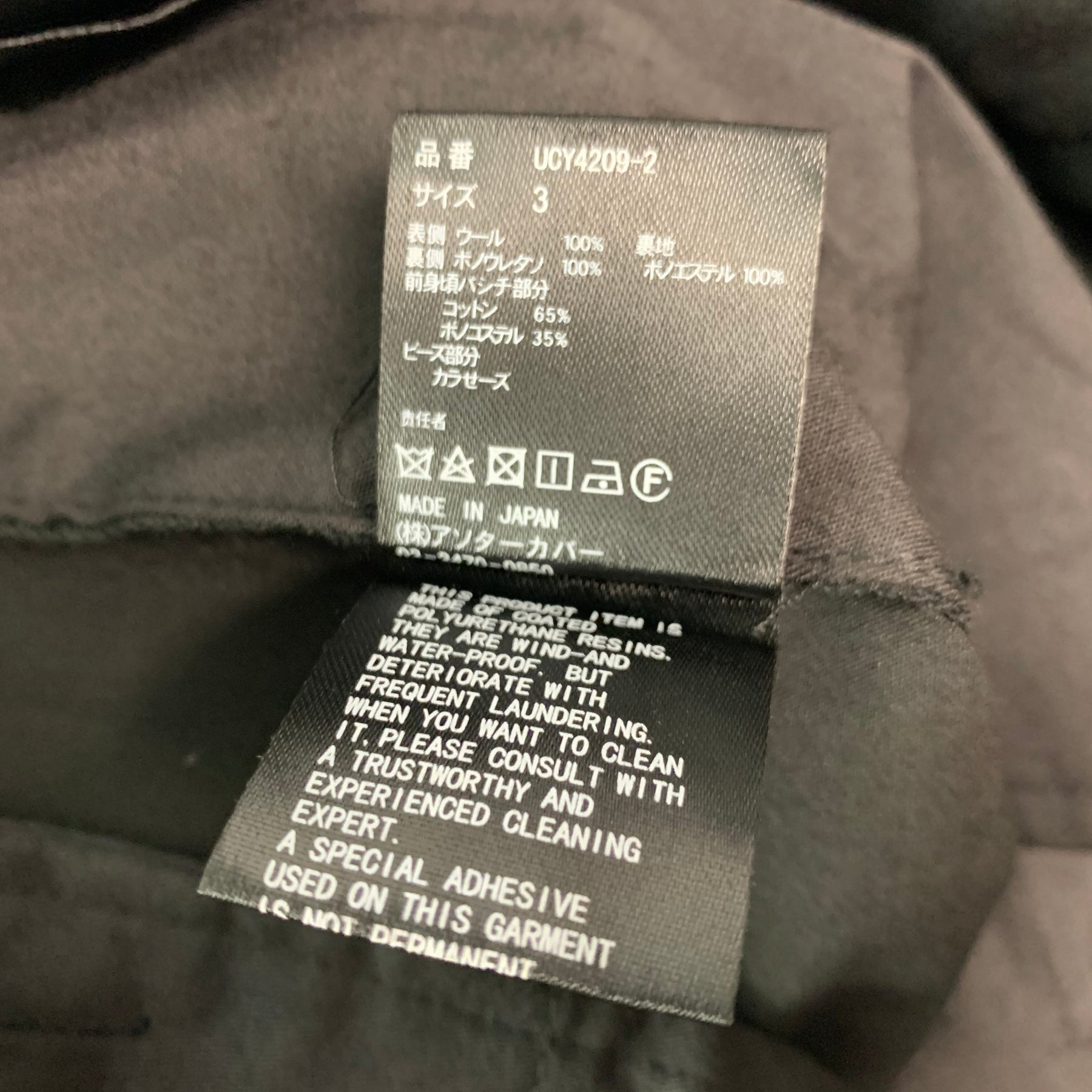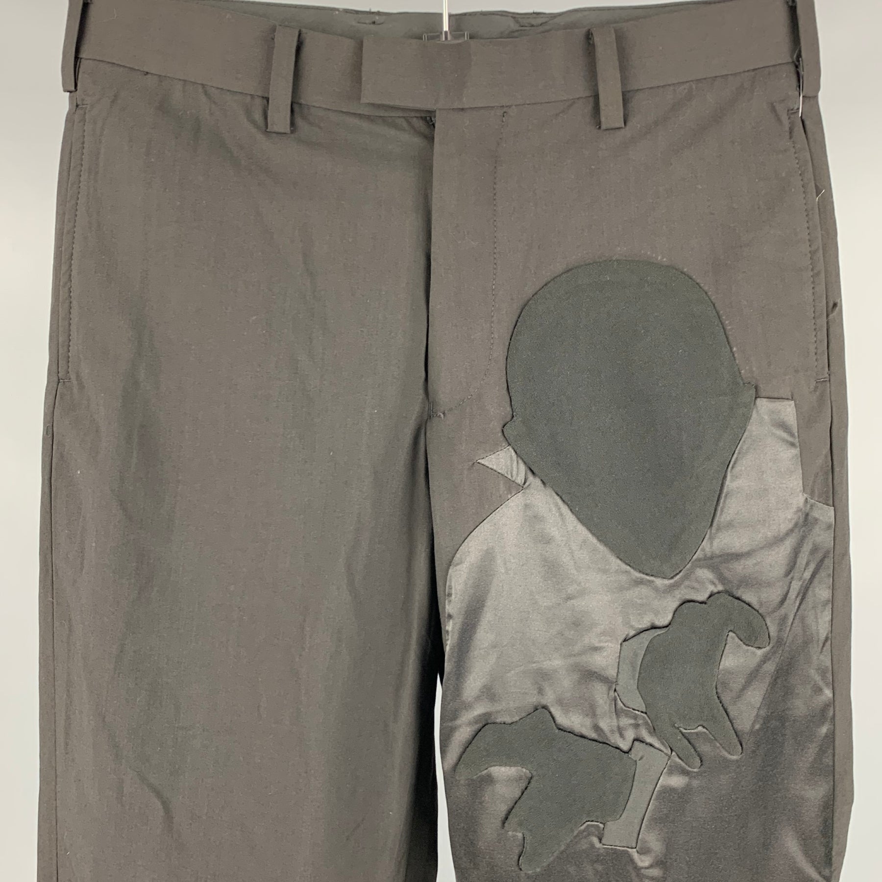UNDERCOVER dress pants in a black wool blend fabric featuring an apron style, applique, satin panel, and zipper fly closure.