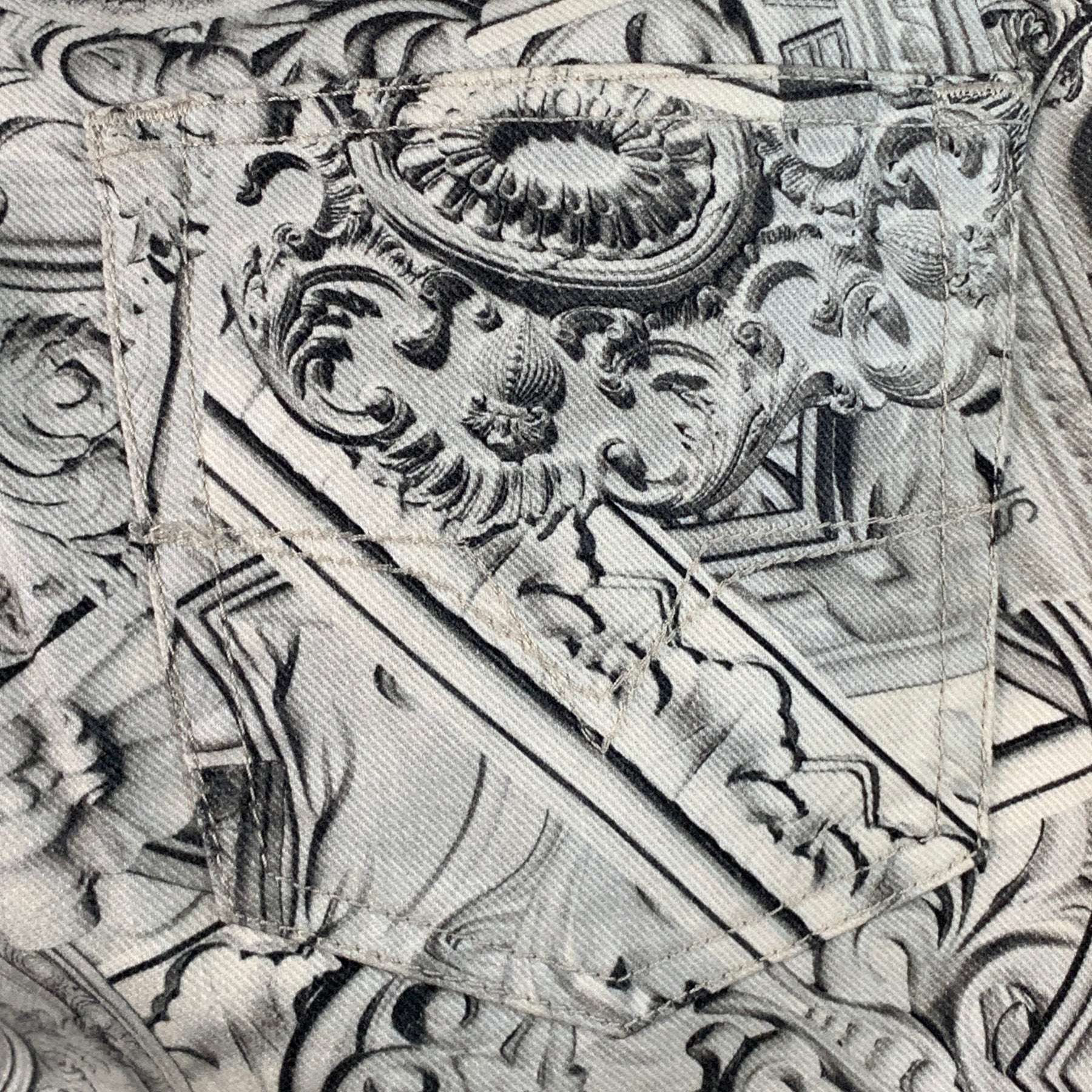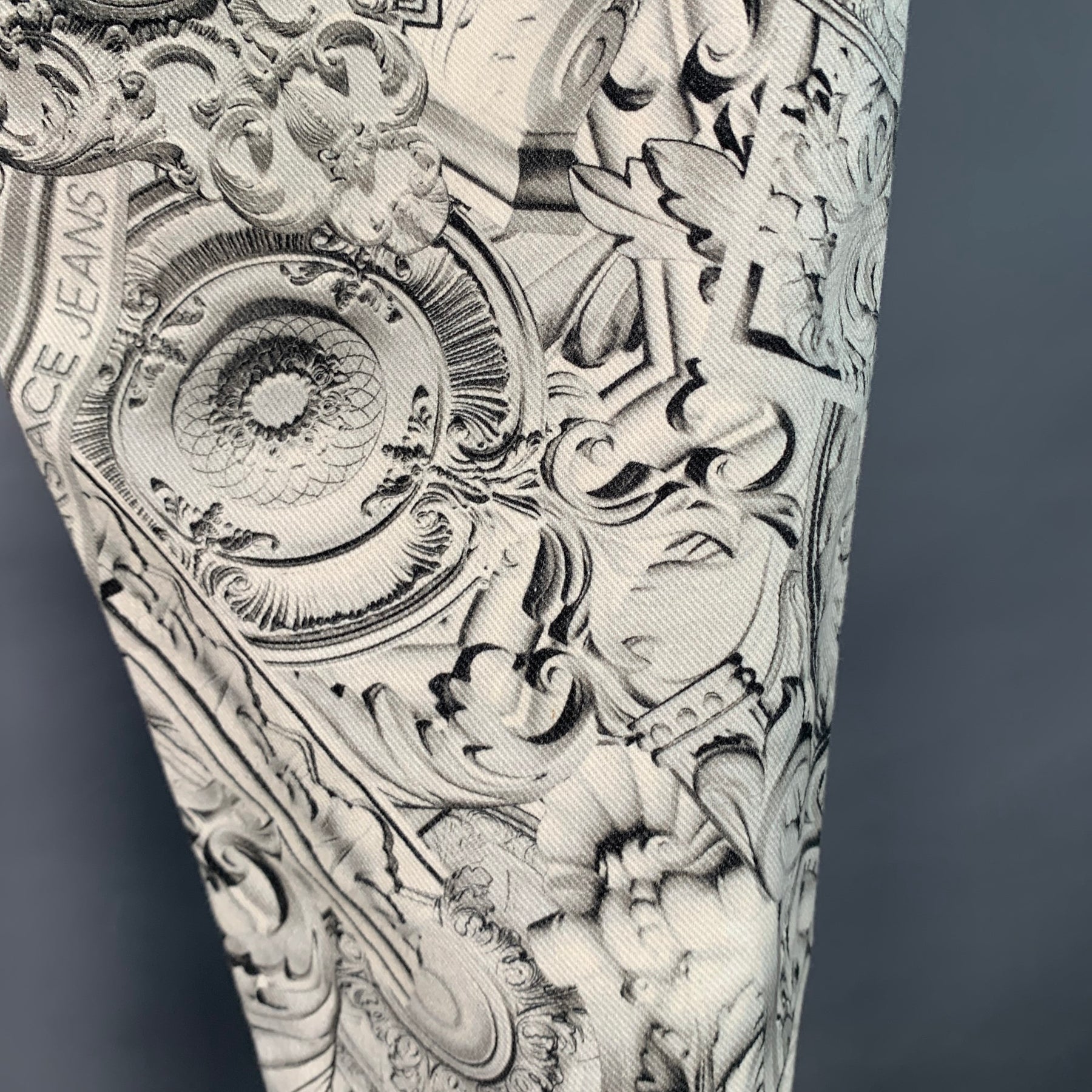 VERSACE JEANS casual pants in a grey and white cotton stretch blend twill featuring a slim fit, brocade pattern with logo details, and zip fly closure. Made in Albania.